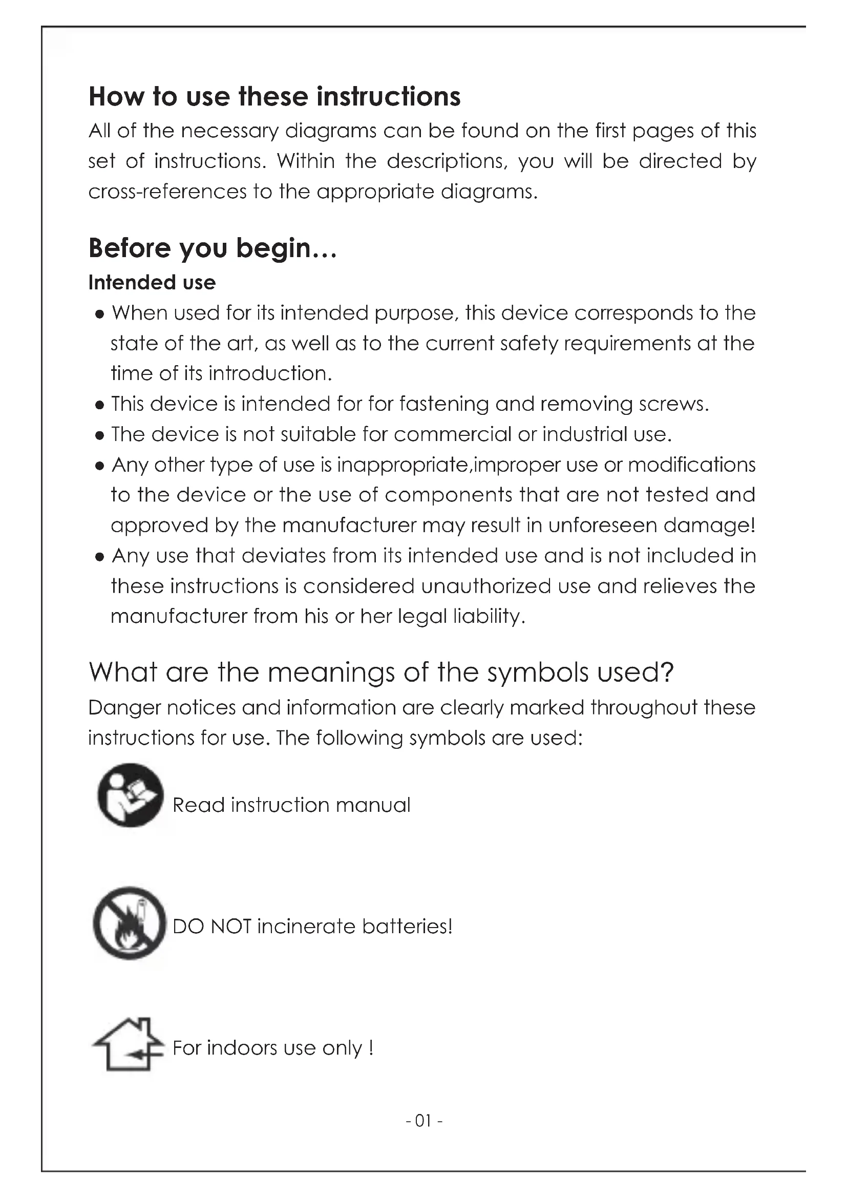 Keep cutting tools sharp and clean. Properly maintained cutting tools with sharp cutting edges are less likely to jam and are easier to control. ● Prevent overheating of the device and the work piece. Excess heat may dam-age the tool and the device. ● Never use power tool near flammable materials. Sparks may set fire to these materials. ● Keep the handles dry and free of grease. Slippery handles can lead to accidents. ● Do not use accessories that have not been designed and recommended by the manufacturer for this specific power tool. Just because you are able to attach an accessory to your power tool this does not guarantee that it is safe to use ● The permitted revolutions of the tool must be at least as high as the highest revolutions specified on the power tool. Accessories that rotate faster than they are permitted to may break and fly and thus cause injuries. ● Remember that moving parts may also be located behind ventilation and venting slots. ● Symbols affixed to your unit may not be removed or covered. Information on the unit that is no longer legible must be replaced immediately. Before putting the unit into operation, read and observe the instructions for use. Risk of damage to the eyes! Never look directly into the LED. DANGER! Direct danger to life and risk of injury! Directly dangerous situation that may lead to death or severe injuries. WARNING! Probable danger to life and risk of injury! Generally dangerous situation that may lead to death or severe injuries. CAUTION! Possible risk of injury! Read instruction manual DO NOT incinerate batteries! For indoors use only ! Class II construction Environmental Protection Waste electrical products should not be disposed of with household waste. Please recycle where facilities exist. Check with your local authority or retailer for recycling advice. Conforms to relevant legislation and safety standards. Li-ion battery cells are recyclable and should not be disposed of with household waste. Please recycle where facilities exist. Check with your local authority or retailer for recycling advice - 02 -How to use these instructions All of the necessary diagrams can be found on the first pages of this set of instructions. Within the descriptions, you will be directed by cross-references to the appropriate diagrams. Before you begin… Intended use ● When used for its intended purpose, this device corresponds to the state of the art, as well as to the current safety requirements at the time of its introduction. ● This device is intended for for fastening and removing screws. ● The device is not suitable for commercial or industrial use. ● Any other type of use is inappropriate,improper use or modifications to the device or the use of components that are not tested and approved by the manufacturer may result in unforeseen damage! ● Any use that deviates from its intended use and is not included in these instructions is considered unauthorized use and relieves the manufacturer from his or her legal liability. What are the meanings of the symbols used? Danger notices and information are clearly marked throughout these instructions for use. The following symbols are used: