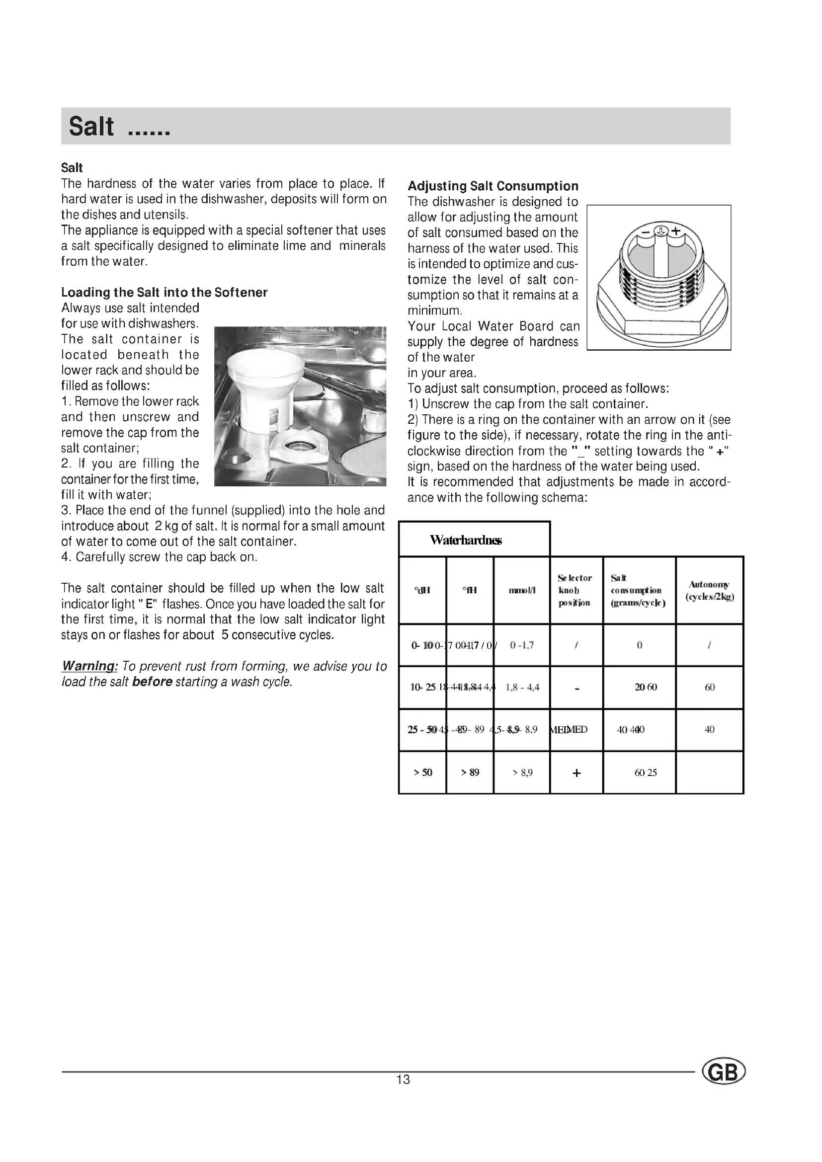 load the salt before starting a wash cycle. Adjusting Salt Consumption The dishwasher is designed to allow for adjusting the amount of salt consumed based on the harness of the water used. This is intended to optimize and cus- tomize the level of salt con- sumption so that it remains at a minimum. Your Local Water Board can supply the degree of hardness of the water in your area. To adjust salt consumption, proceed as follows: