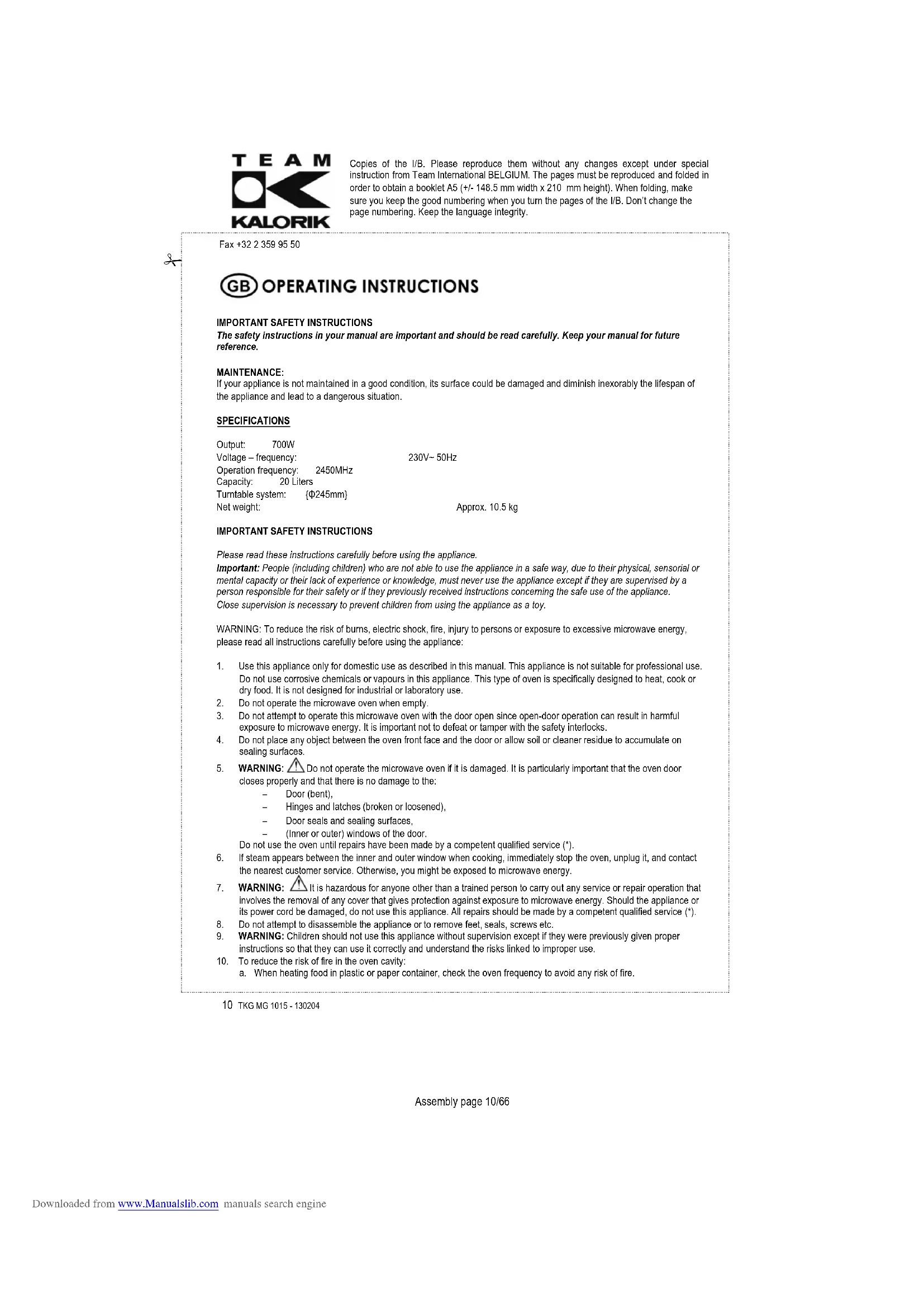 a. When heating food in plastic or paper container, check the oven frequency to avoid any risk of fire. Downloaded from www.Manualslib.com manuals search engineCopies of the I/B. Please reproduce them without any changes except under special instruction from Team International BELGIUM. The pages must be reproduced and folded in order to obtain a booklet A5 (+/- 148.5 mm width x 210 mm height). When folding, make sure you keep the good numbering when you turn the pages of the I/B. Don’t change the page numbering. Keep the language integrity.