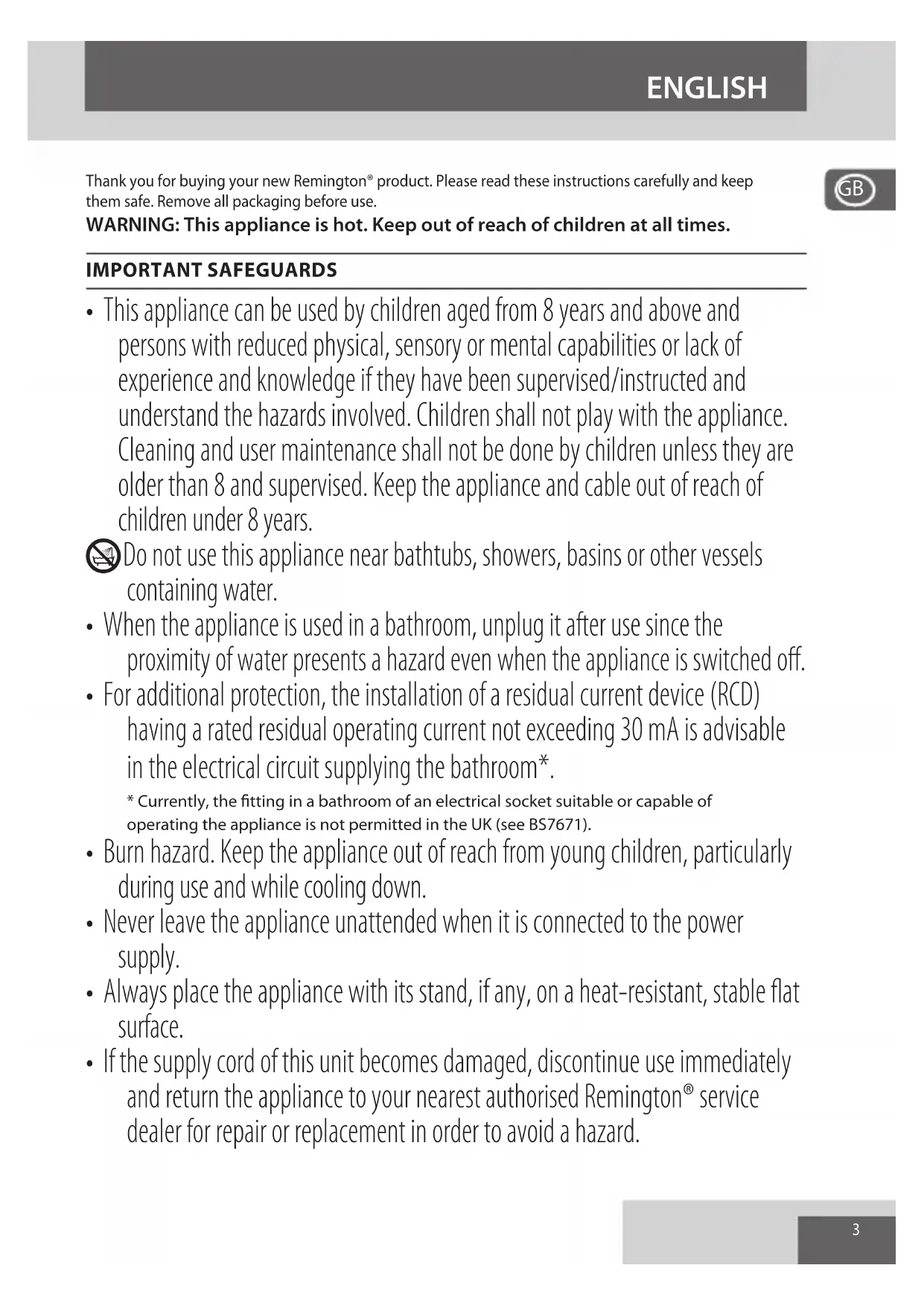 - If the supply cord of this unit becomes damaged, discontinue use immediately and return the appliance to your nearest authorised Remington® service dealer for repair or replacement in order to avoid a hazard. ENGLISH