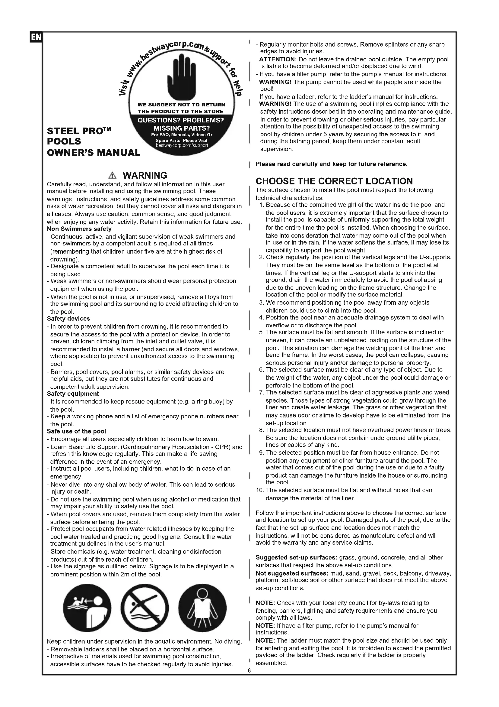The surface chosen to install the pool must respect the following technical characteristics: 1. Because of the combined weight of the water inside the pool and the pool users, it is extremely important that the surface chosen to install the pool is capable of uniformly supporting the total weight for the entire time the pool is installed. When choosing the surface, take into consideration that water may come out of the pool when in use or in the rain. If the water softens the surface, it may lose its capability to support the pool weight. 2. Check regularly the position of the vertical legs and the U-supports. They must be on the same level as the bottom of the pool at all times. If the vertical leg or the U-support starts to sink into the ground, drain the water immediately to avoid the pool collapsing due to the uneven loading on the frame structure. Change the location of the pool or modify the surface material. 3. We recommend positioning the pool away from any objects children could use to climb into the pool. 4. Position the pool near an adequate drainage system to deal with overflow or to discharge the pool. 5. The surface must be flat and smooth. If the surface is inclined or uneven, it can create an unbalanced loading on the structure of the pool. This situation can damage the welding point of the liner and bend the frame. In the worst cases, the pool can collapse, causing serious personal injury and/or damage to personal property. 6. The selected surface must be clear of any type of object. Due to the weight of the water, any object under the pool could damage or perforate the bottom of the pool. 7. The selected surface must be clear of aggressive plants and weed species. Those types of strong vegetation could grow through the liner and create water leakage. The grass or other vegetation that may cause odor or slime to develop have to be eliminated from the set-up location. 8. The selected location must not have overhead power lines or trees. Be sure the location does not contain underground utility pipes, lines or cables of any kind. 9. The selected position must be far from house entrance. Do not position any equipment or other furniture around the pool. The water that comes out of the pool during the use or due to a faulty product can damage the furniture inside the house or surrounding the pool.10. The selected surface must be flat and without holes that can damage the material of the liner. Follow the important instructions above to choose the correct surface and location to set up your pool. Damaged parts of the pool, due to the fact that the set-up surface and location does not match the instructions, will not be considered as manufacture defect and will avoid the warranty and any service claims.Suggested set-up surfaces: grass, ground, concrete, and all other surfaces that respect the above set-up conditions.Not suggested surfaces: mud, sand, gravel, deck, balcony, driveway, platform, soft/loose soil or other surface that does not meet the above set-up conditions.NOTE: Check with your local city council for by-laws relating to fencing, barriers, lighting and safety requirements and ensure you comply with all laws.NOTE: If have a filter pump, refer to the pump’s manual for instructions.NOTE: The ladder must match the pool size and should be used only for entering and exiting the pool. It is forbidden to exceed the permitted payload of the ladder. Check regularly if the ladder is properly assembled.WE SUGGEST NOT TO RETURNTHE PRODUCT TO THE STOREQUESTIONS? PROBLEMS?MISSING PARTS? For FAQ, Manuals, Videos Or Spare Parts, Please Visitbestwaycorp.com/support
