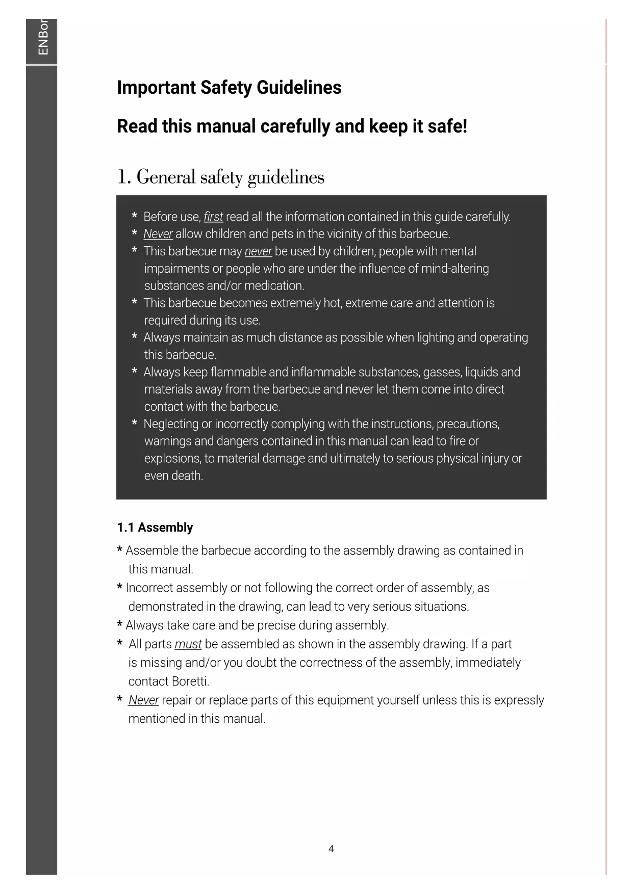 - Do not empty the ash receptacle until all charcoal/briquettes and ash have been completely extinguished and the barbecue has cooled down fully. 14ENBoretti Maggiore / User guide - Installation advice