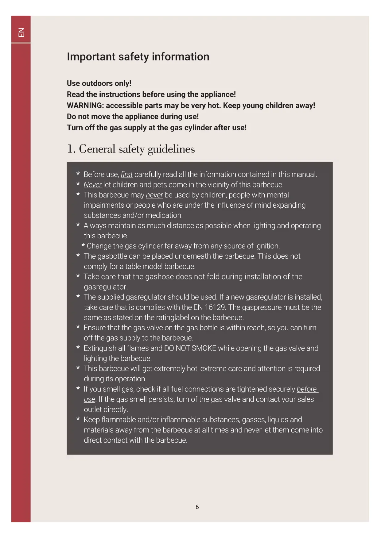 - The supplied gasregulator should be used. If a new gasregulator is installed, take care that is complies with the EN 16129. The gaspressure must be the same as stated on the ratinglabel on the barbecue.