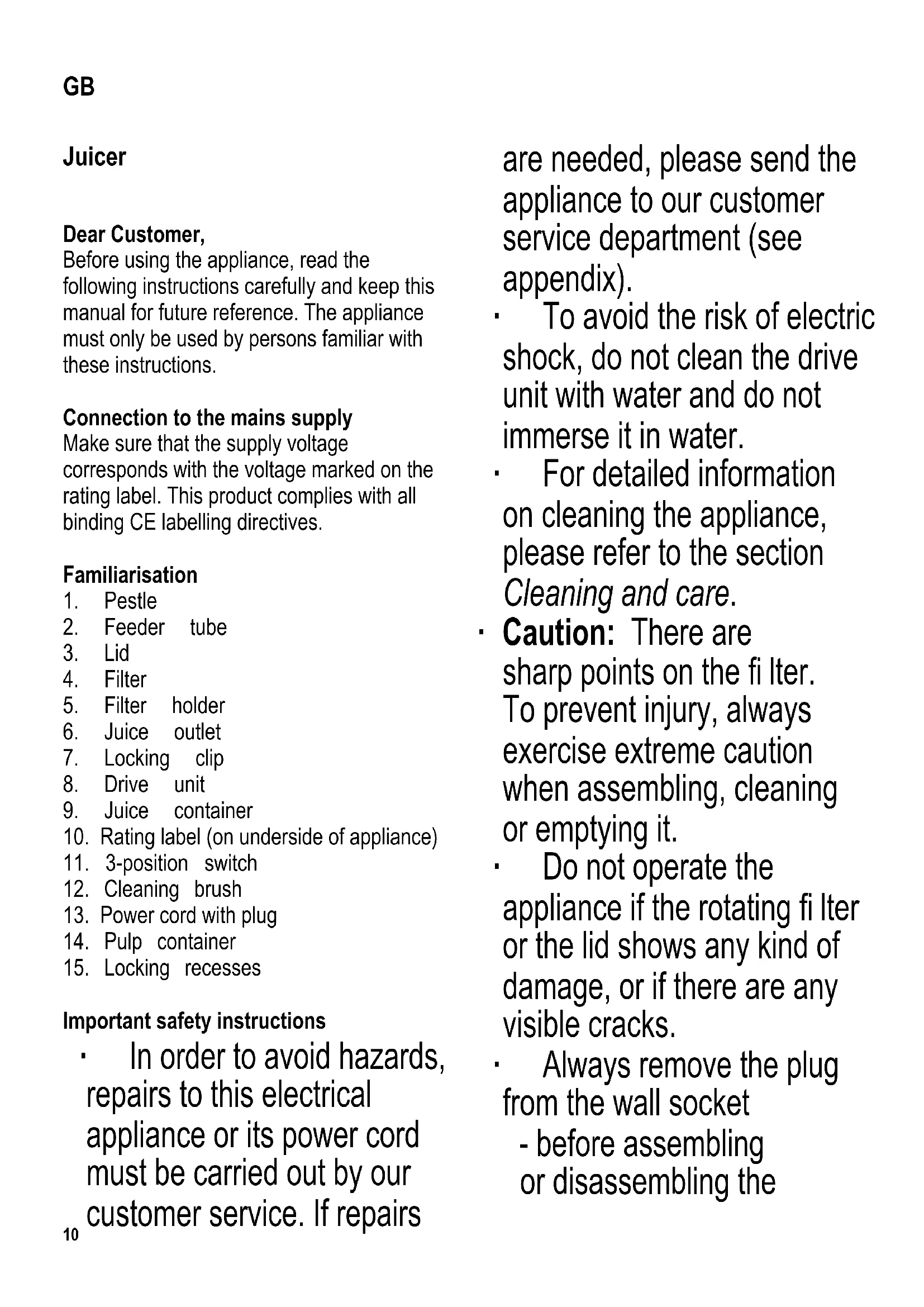 Important safety instructions ∙ In order to avoid hazards, repairs to this electrical appliance or its power cord must be carried out by our customer service. If repairs are needed, please send the appliance to our customer service department (see appendix). ∙ To avoid the risk of electric shock, do not clean the drive unit with water and do not immerse it in water. ∙ For detailed information on cleaning the appliance, please refer to the section Cleaning and care. ∙ Caution: There are sharp points on the fi lter. To prevent injury, always exercise extreme caution when assembling, cleaning or emptying it. ∙ Do not operate the appliance if the rotating fi lter or the lid shows any kind of damage, or if there are any visible cracks. ∙ Always remove the plug from the wall socket - before assembling or disassembling the GB11 appliance, - after use, - in case of any malfunction, - before opening the lid, - when there is no supervision, - before cleaning the appliance. ∙ This appliance is intended for domestic or similar applications, such as - in staff kitchens in shops, offi ces and other similar working environments, - in agricultural working environments, - by customers in hotels, motels etc. and similar accommodation, - in bed-and breakfast type environments. ∙ Caution: Any misuse can cause severe personal injury. ∙ The appliance may only be used by persons with reduced physical, sensory or mental capabilities, or lacking experience and knowledge, if they have been given supervision or instruction concerning the use of the appliance and fully understand all dangers and safety precautions involved. ∙ Children must not be permitted to operate the appliance. The appliance and its power cord must be kept well away from children. ∙ Children must not be permitted to play with the appliance. ∙ Caution: Keep any packaging materials well away from children – these materials are a potential source of danger, e.g. of suffocation. ∙ Every time the appliance is used, the main body including the power cord as well as any attachment fi tted should be checked thoroughly for any defects. Should the appliance, for instance, have been dropped onto a hard surface, or if excessive force has been used to pull the power cord, it must no longer be used: even invisible damage may have adverse effects on the operational safety of the12 appliance. ∙ For safety reasons, use the pestle at all times when feeding fruit or vegetables into the feeder tube. Under no circumstances use your hands or fi ngers. ∙ After switching off, always wait until the motor has come to a complete standstill before opening the lid. ∙ Do not allow the appliance or its power cord to touch hot surfaces or to come into contact with any heat sources. ∙ When removing the plug from the wall socket, never pull on the power cord; always grip the plug itself. Do not touch the plug with wet hands. ∙ Do not let the power cord hang free. ∙ No responsibility will be accepted if damage results from improper use, or if these instructions are not complied with. Intended use ∙ This appliance must only be used for extracting juice from fruit and vegetables such as apples, carrots, cucumber, tomatoes etc. ∙ The following fruits and vegetables are not suitable for juice extraction: fi gs, avocados, aubergines, elderberries, rhubarb, cranberries and the like. ∙ Peeled bananas should be added for aromatic purposes only, as very little juice can be extracted. ∙ Any use other than that described in these instructions must be considered improper and may lead to personal injury or material damage. Short-time operation The appliance is designed for short-term operation only, i.e. it should not be operated continuously for more than 1 minute. Allow it to cool down for 1 minute afterwards. After 3 such cycles, the unit must be permitted to cool down for 15 minutes before it is switched on again. Overheating protection The appliance automatically switches off in the case of over-heating. If this happens, disconnect the appliance from the mains and allow it to cool down for 30 minutes, when it will be ready for use again. Before using for the fi rst time Before the appliance is used for the fi rst time, it must be cleaned as described in the section Cleaning and care. Switch The appliance is equipped with a 3-position switch. 0 appliance switched off I slow juice extraction II fast juice extraction Tip! The slow-juicing setting I is suitable for soft, juicy fruits or vegetables such as melons (peeled), tomatoes etc. For harder fruits or vegetables such as apples, carrots etc, we recommend using the quick-juicing setting II.13 Operation Preparing the ingredients ∙ Clean and cut up the fruit or vegetable as necessary, so that the pieces fi t down the feeder tube. Remove any stones, pips or cores to prevent damage to the appliance. Preparing the appliance ∙ Ensure that the switch is set to its 0 position. ∙ Place the fi lter holder onto the drive unit with the juice outlet to the right. ∙ Fit the fi lter into its holder, pushing it fi rmly down by the rim until it is heard locking into place. It is important that the fi lter is securely attached and not at an angle, and that it can be turned easily. ∙ Slide the pulp container on the left side of the unit under the rim of the fi lter holder, tilting the container slightly. ∙ Place the transparent lid onto the fi lter holder. The left side of the lid must engage in the pulp container. Secure the lid with the locking clip, which will activate the safety switch. Ensure that the locking clip engages fi rmly on both sides into the locking recesses on the lid. ∙ Fit the juice container with its lid below the outlet. Juicing ∙ Insert the plug into the wall outlet and put the switch to the required setting. ∙ Feed the clean, pre-cut fruit or vegetable pieces down the feeder tube while the unit is running. When inserting the pestle, ensure that its guide slots slide ov