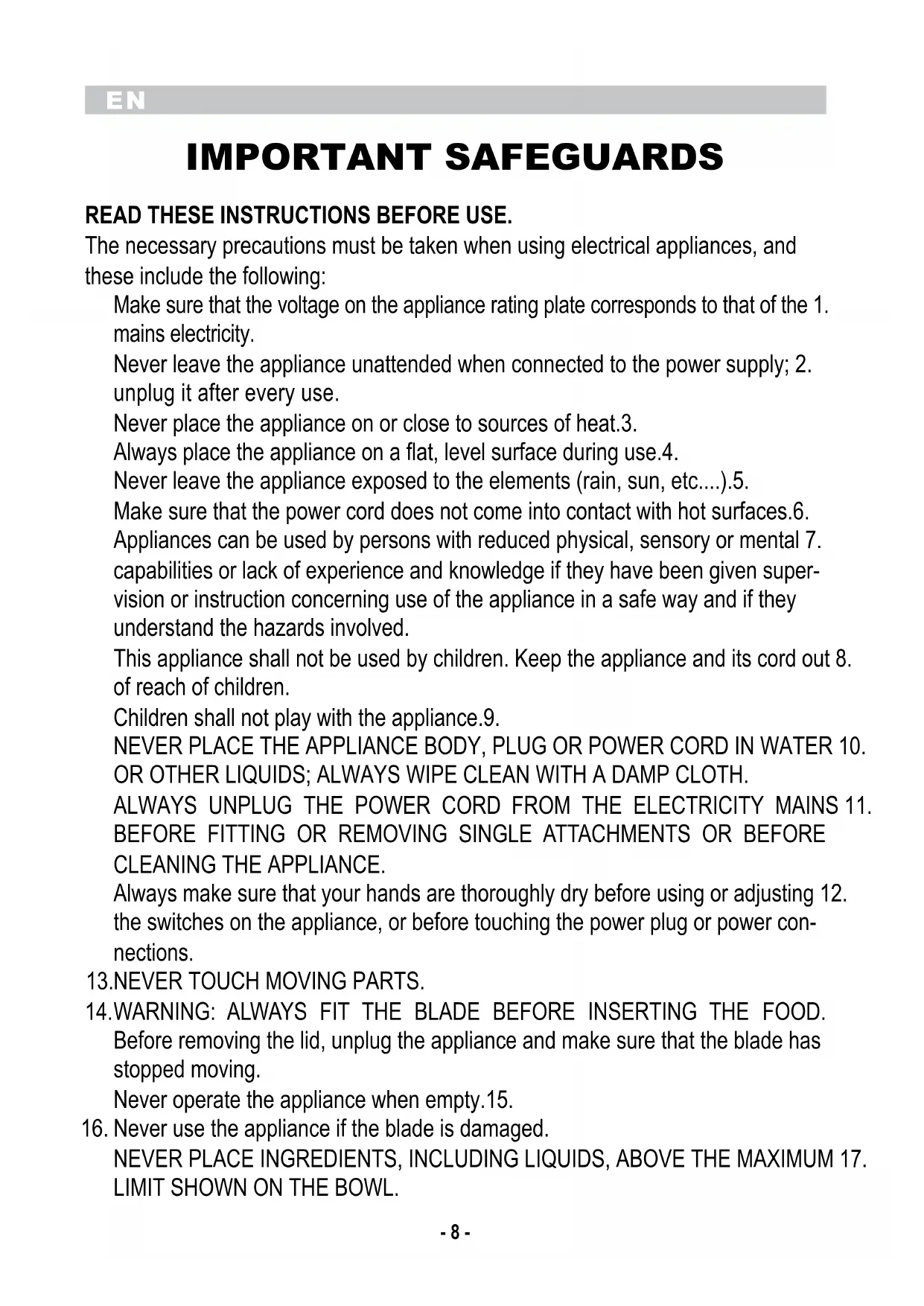 IMPORTANT SAFEGUARDS READ THESE INSTRUCTIONS BEFORE USE. The necessary precautions must be taken when using electrical appliances, and these include the following: Make sure that the voltage on the appliance rating plate corresponds to that of the 1. mains electricity. Never leave the appliance unattended when connected to the power supply; 2. unplug it after every use. Never place the appliance on or close to sources of heat.3. Always place the appliance on a flat, level surface during use.4. Never leave the appliance exposed to the elements (rain, sun, etc....).5. Make sure that the power cord does not come into contact with hot surfaces.6. Appliances can be used by persons with reduced physical, sensory or mental 7. capabilities or lack of experience and knowledge if they have been given super- vision or instruction concerning use of the appliance in a safe way and if they understand the hazards involved. This appliance shall not be used by children. Keep the appliance and its cord out 8. of reach of children. Children shall not play with the appliance.9. NEVER PLACE THE APPLIANCE BODY, PLUG OR POWER CORD IN WATER 10. OR OTHER LIQUIDS; ALWAYS WIPE CLEAN WITH A DAMP CLOTH. ALWAYS UNPLUG THE POWER CORD FROM THE ELECTRICITY MAINS 11. BEFORE FITTING OR REMOVING SINGLE ATTACHMENTS OR BEFORE CLEANING THE APPLIANCE. Always make sure that your hands are thoroughly dry before using or adjusting 12. the switches on the appliance, or before touching the power plug or power con- nections. NEVER TOUCH MOVING PARTS.13.