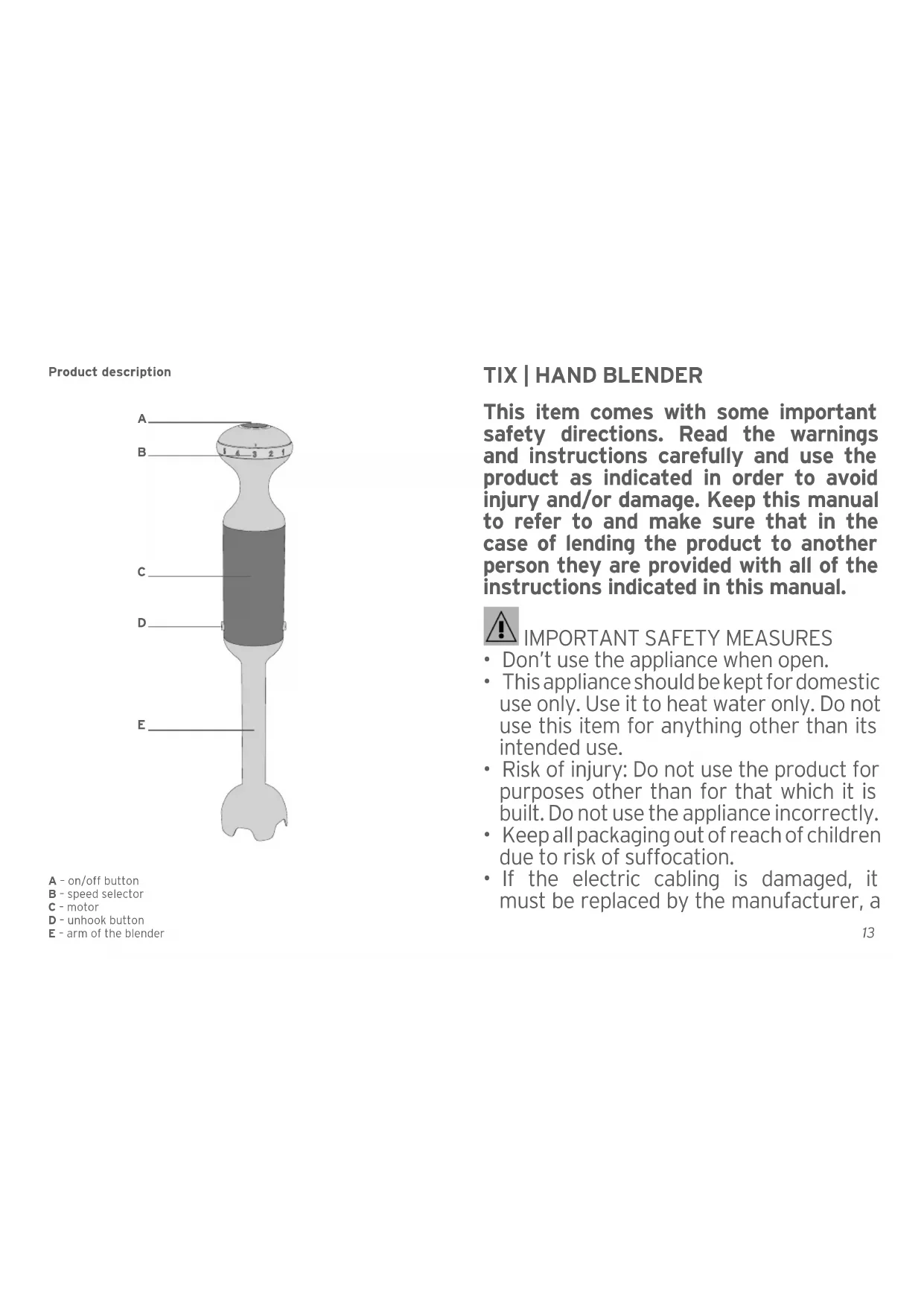 Download the instructions for your Hand blender in PDF format for free! Find your manual Tix 71053 - Vice Versa and take your electronic device back in hand. On this page are published all the documents necessary for the use of your device. Tix 71053 by Vice Versa.