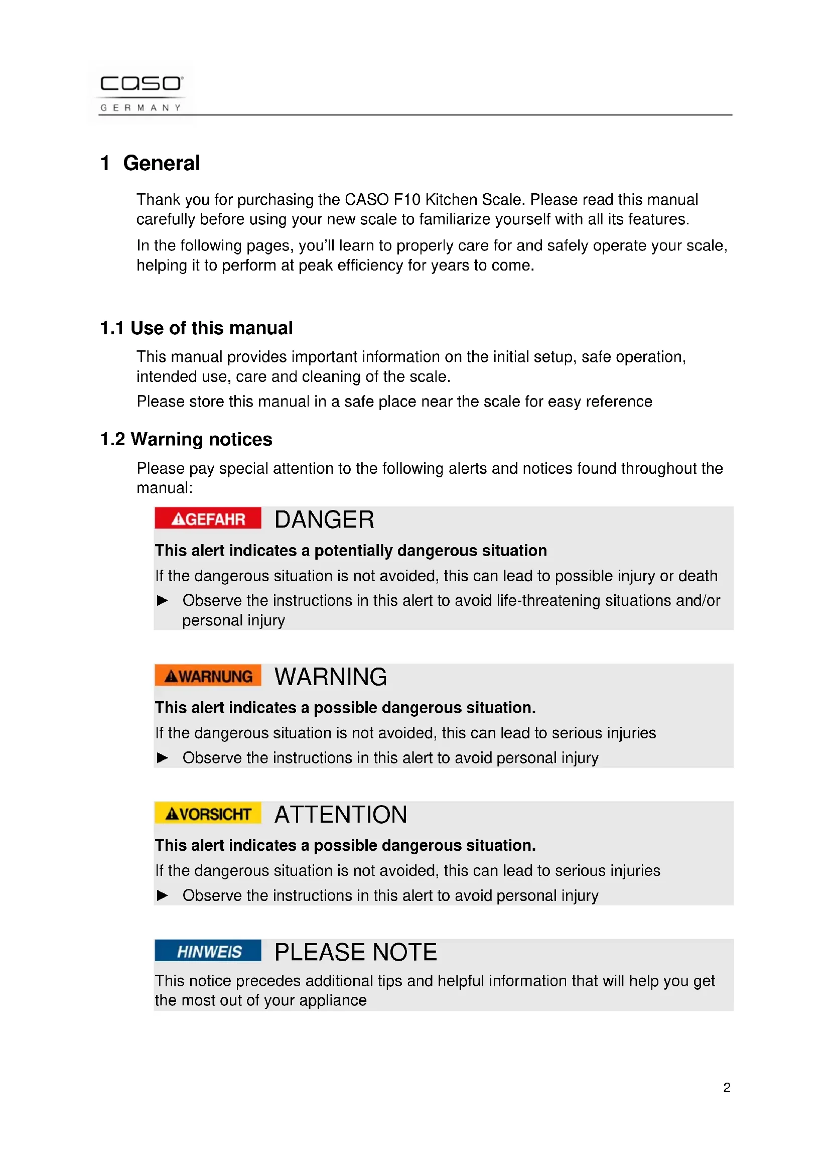 1 General Thank you for purchasing the CASO F10 Kitchen Scale. Please read this manual carefully before using your new scale to familiarize yourself with all its features. In the following pages, you’ll learn to properly care for and safely operate your scale, helping it to perform at peak efficiency for years to come.