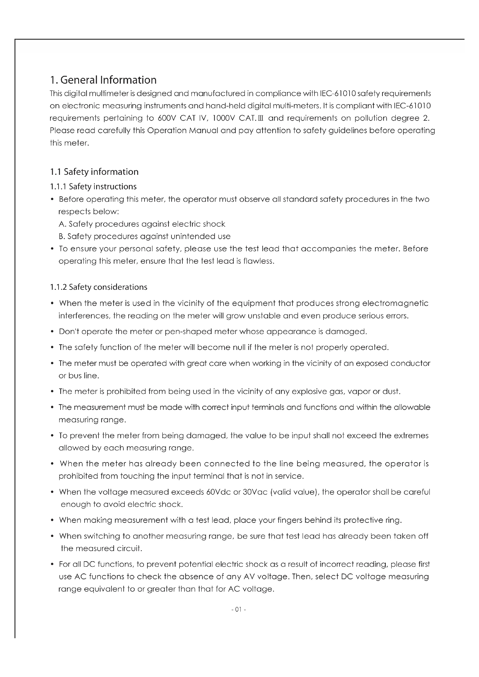This digital multimeter is designed and manufactured in compliance with IEC-61010 safety requirements on electronic measuring instruments and hand-held digital multi-meters. It is compliant with IEC-61010 requirements pertaining to 600V CAT IV, 1000V CAT.Ⅲ and requirements on pollution degree 2. Please read carefully this Operation Manual and pay attention to safety guidelines before operating this meter.