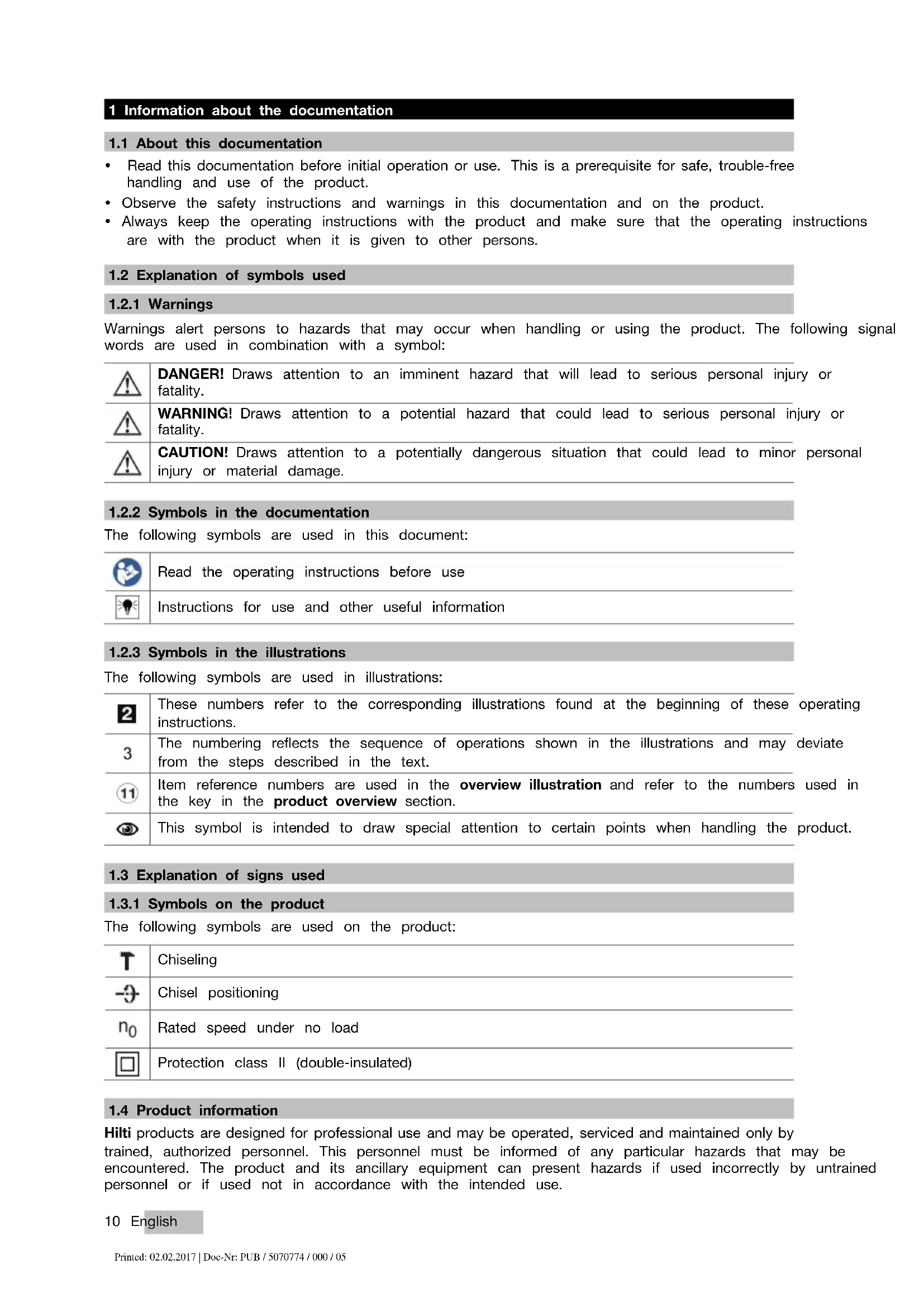 Hilti products are designed for professional use and may be operated, serviced and maintained only by trained, authorized personnel. This personnel must be informed of any particular hazards that may be encountered. The product and its ancillary equipment can present hazards if used incorrectly by untrained personnel or if used not in accordance with the intended use. Printed: 02.02.2017 | Doc-Nr: PUB / 5070774 / 000 / 05English 11 The type designation and serial number are stated on the rating plate. ▶ Write down the serial number in the table below. You will be required to state the product details when contacting Hilti Service or your local Hilti organization to inquire about the product. Product information Breaker TE 1500AVR Generation 01 Serial no.