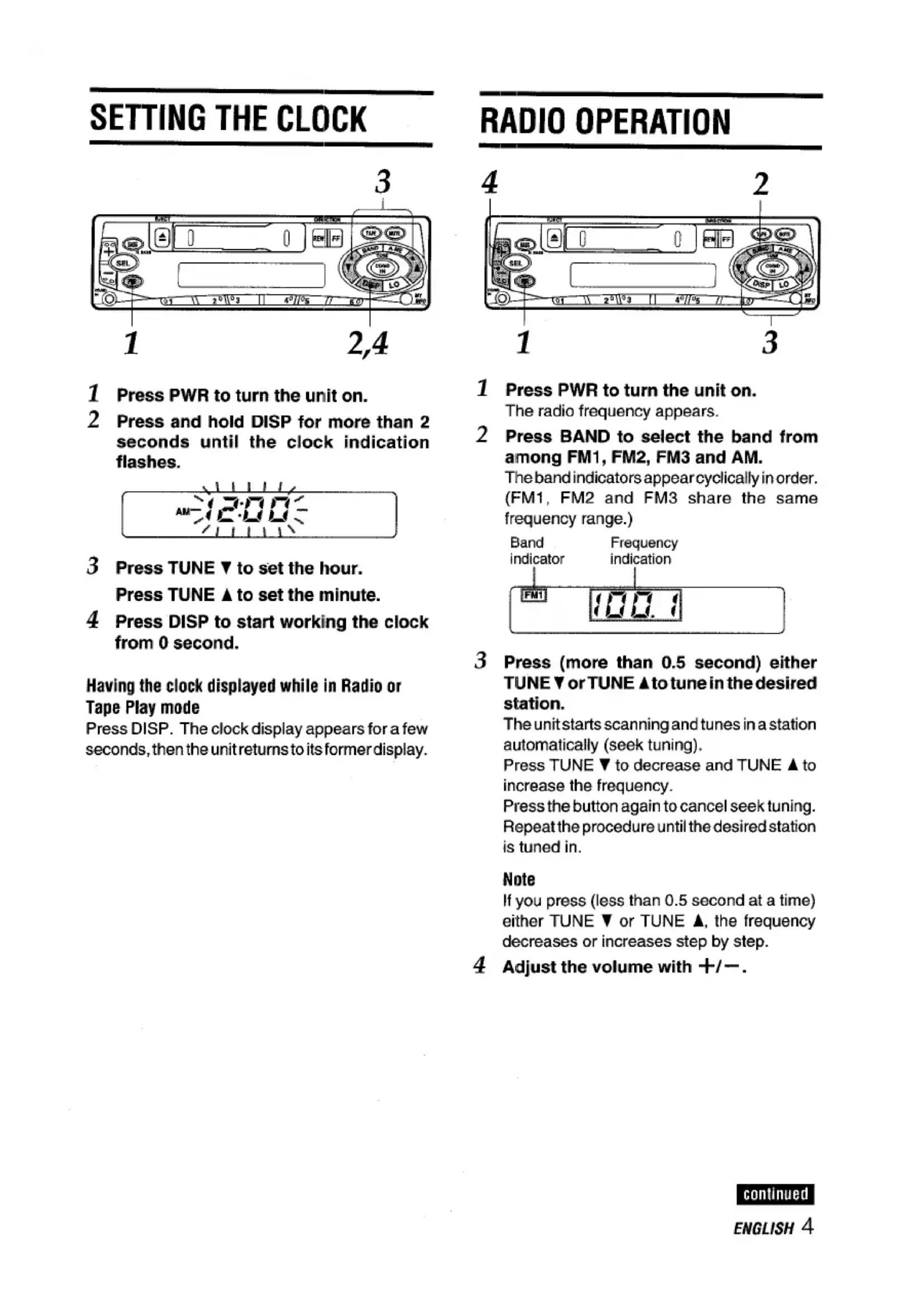 1 2,4 Press PWR to turn the unit on. Press and hold DISP for more than 2 seconds until the clock indication flashes,Press TUNE 7 to set the hour. Press TUNE A to set the minute. Press DISP to start working the clock from O second. Having the clock displayed while in Radio or Tape Play mode Press DISP. The clock display appears for a few seconds, then the unit returns to itsformer display.