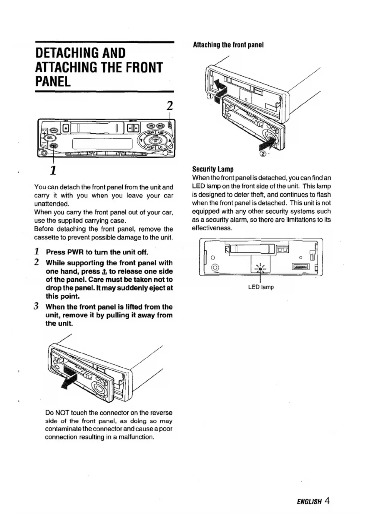 Attaching the front panelSwxrrity Lamp When the front panel is detached, you can find an LED lamp on the front side of the unit. This lamp is designed to deter theft, and continues to flash when the front panel is detached. This unit is not ec~uipped with any other security systems such as a security alarm, so there are limitations to its ef festiveness. LED lamp Do NOT touch the connector on the reverse side of the front panel, as doing so may contaminate the connector and cause a poor connection resulting in a malfunction. ENGLISH