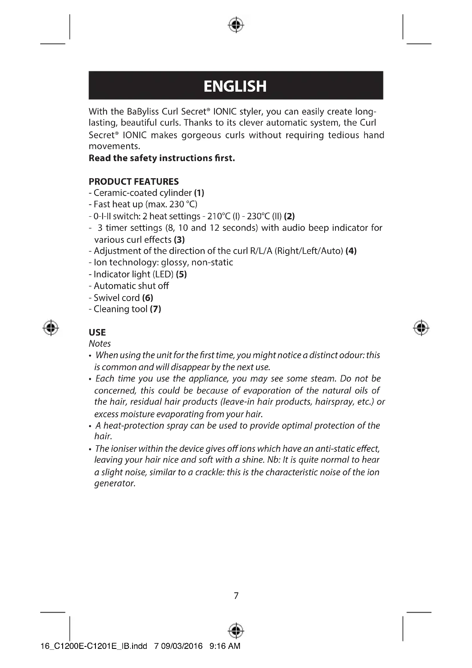- The ioniser within the device gives o ions which have an anti-static eect, leaving your hair nice and soft with a shine. Nb: It is quite normal to hear a slight noise, similar to a crackle: this is the characteristic noise of the ion generator. 16_C1200E-C1201E_IB.indd 7 09/03/2016 9:16 AM8