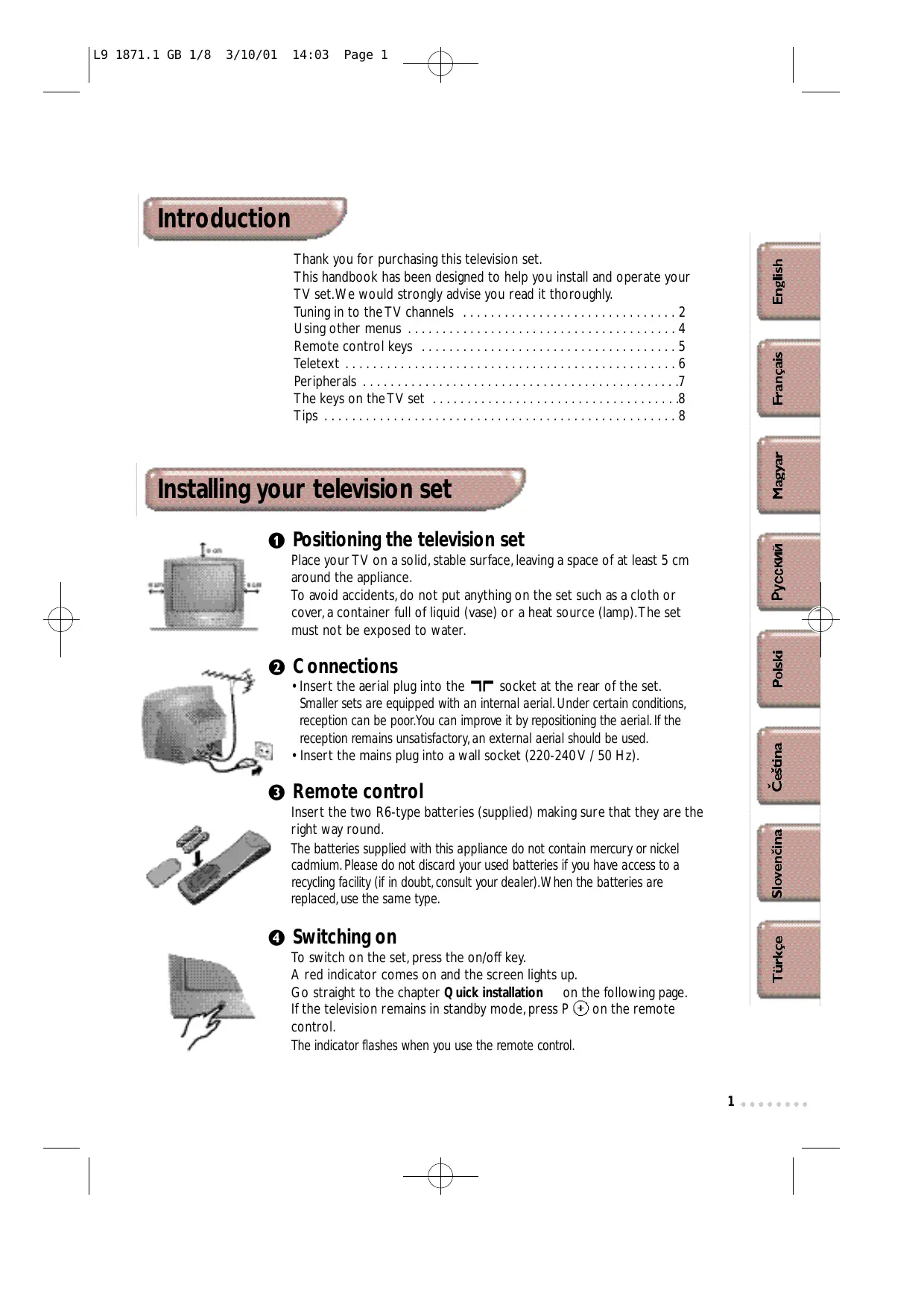 ® Switching on To switch on the set, press the on/off key. A red indicator comes on and the screen lights up. Go straight to the chapter Quick installation on the following page. If the television remains in standby mode, press P on the remote control. The indicator flashes when you use the remote control.