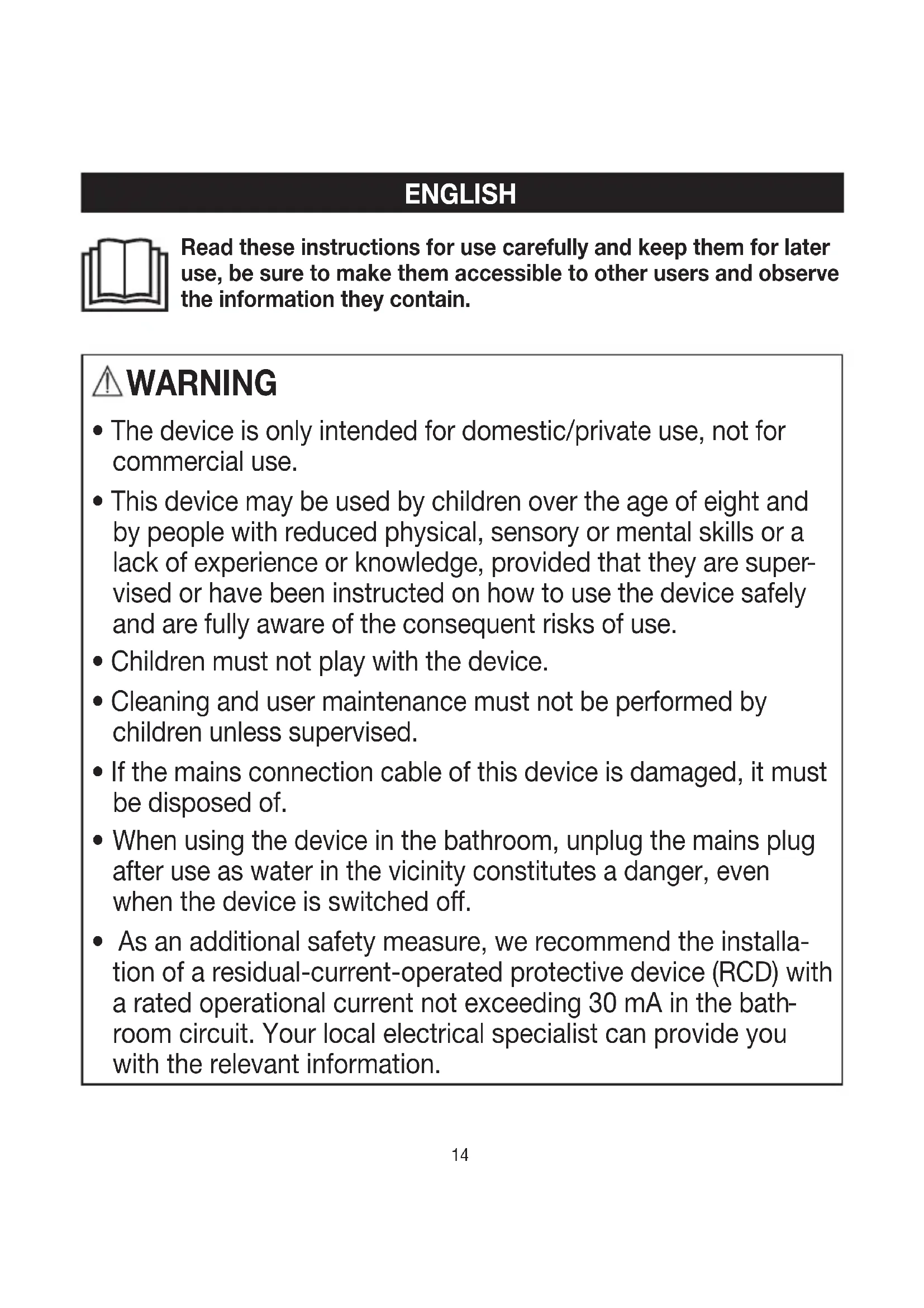- The device is only intended for domestic/private use, not for commercial use.