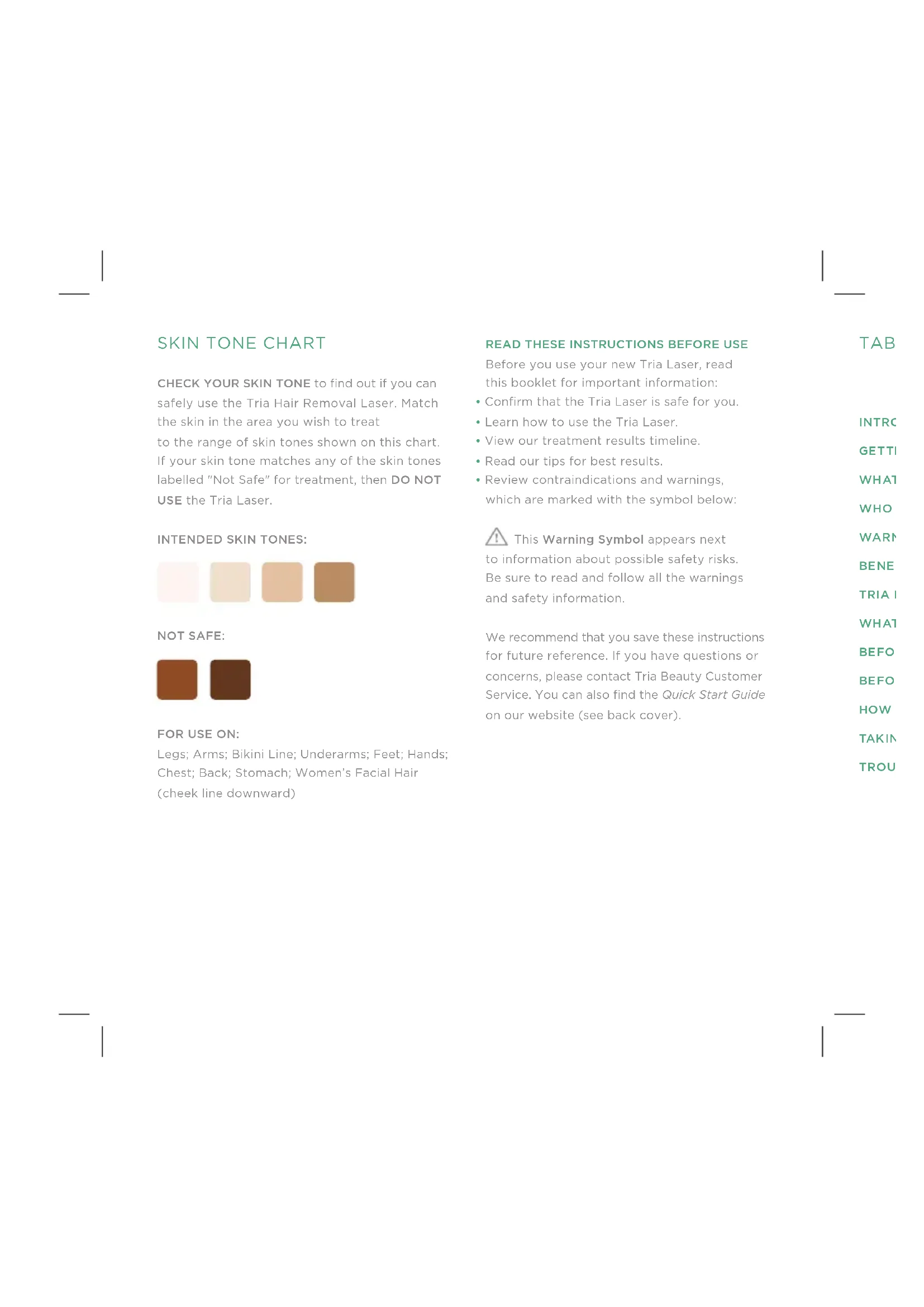 - Review contraindications and warnings, which are marked with the symbol below: This Warning Symbol appears next to information about possible safety risks. Be sure to read and follow all the warnings and safety information. We recommend that you save these instructions for future reference. If you have questions or concerns, please contact Tria Beauty Customer Service. You can also find the Quick Start Guide on our website (see back cover).