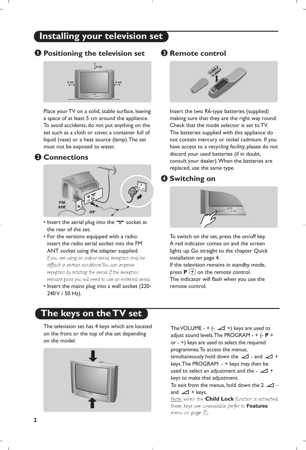 - Insert the mains plug into a wall socket (220240 V / 50 Hz). To switch on the set, press the on/off key. A red indicator comes on and the screen lights up. Go straight to the chapter Quick installation on page 4. If the television remains in standby mode, press P # on the remote control. The indicator will flash when you use the remote control. The keys on the TV set The television set has 4 keys which are located on the front or the top of the set depending on the model. The VOLUME - + (- ” +) keys are used to adjust sound levels.The PROGRAM - + (- P + or - +) keys are used to select the required programmes.To access the menus, simultaneously hold down the ” - and ” + keys.The PROGRAM - + keys may then be used to select an adjustment and the - ” + keys to make that adjustment. To exit from the menus, hold down the 2 ” and ” + keys. Note: when the Child Lock function is activated, these keys are unavailable (refer to Features menu on page 7).