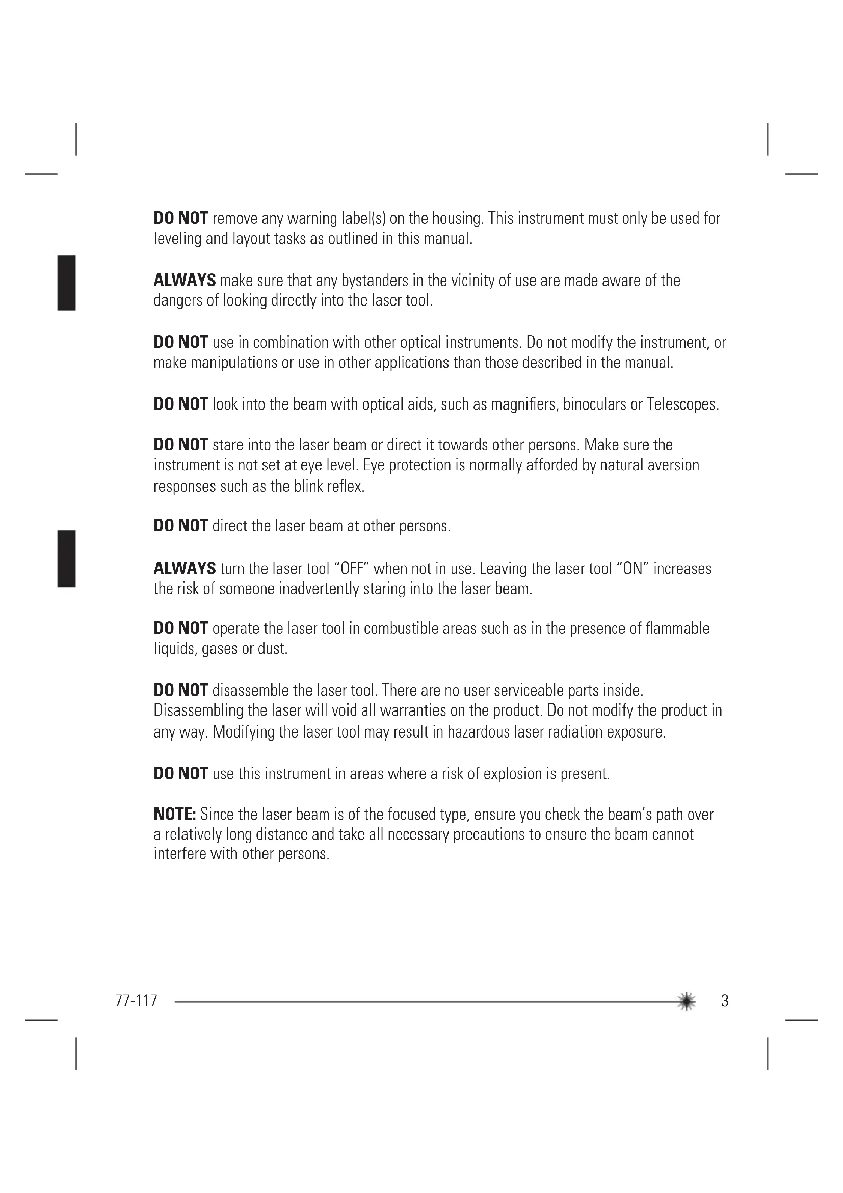 LT LT LT LT TR TR TR HR HR HR HR3 77-117 DO NOT remove any warning label(s) on the housing. This instrument must only be used for leveling and layout tasks as outlined in this manual. ALWAYS make sure that any bystanders in the vicinity of use are made aware of the dangers of looking directly into the laser tool. DO NOT use in combination with other optical instruments. Do not modify the instrument, or make manipulations or use in other applications than those described in the manual. DO NOT look into the beam with optical aids, such as magnifiers, binoculars or Telescopes. DO NOT stare into the laser beam or direct it towards other persons. Make sure the instrument is not set at eye level. Eye protection is normally afforded by natural aversion responses such as the blink reflex. DO NOT direct the laser beam at other persons. ALWAYS turn the laser tool “OFF” when not in use. Leaving the laser tool “ON” increases the risk of someone inadvertently staring into the laser beam. DO NOT operate the laser tool in combustible areas such as in the presence of flammable liquids, gases or dust. DO NOT disassemble the laser tool. There are no user serviceable parts inside. Disassembling the laser will void all warranties on the product. Do not modify the product in any way. Modifying the laser tool may result in hazardous laser radiation exposure. DO NOT use this instrument in areas where a risk of explosion is present. NOTE: Since the laser beam is of the focused type, ensure you check the beam’s path over a relatively long distance and take all necessary precautions to ensure the beam cannot interfere with other persons.4 77-117