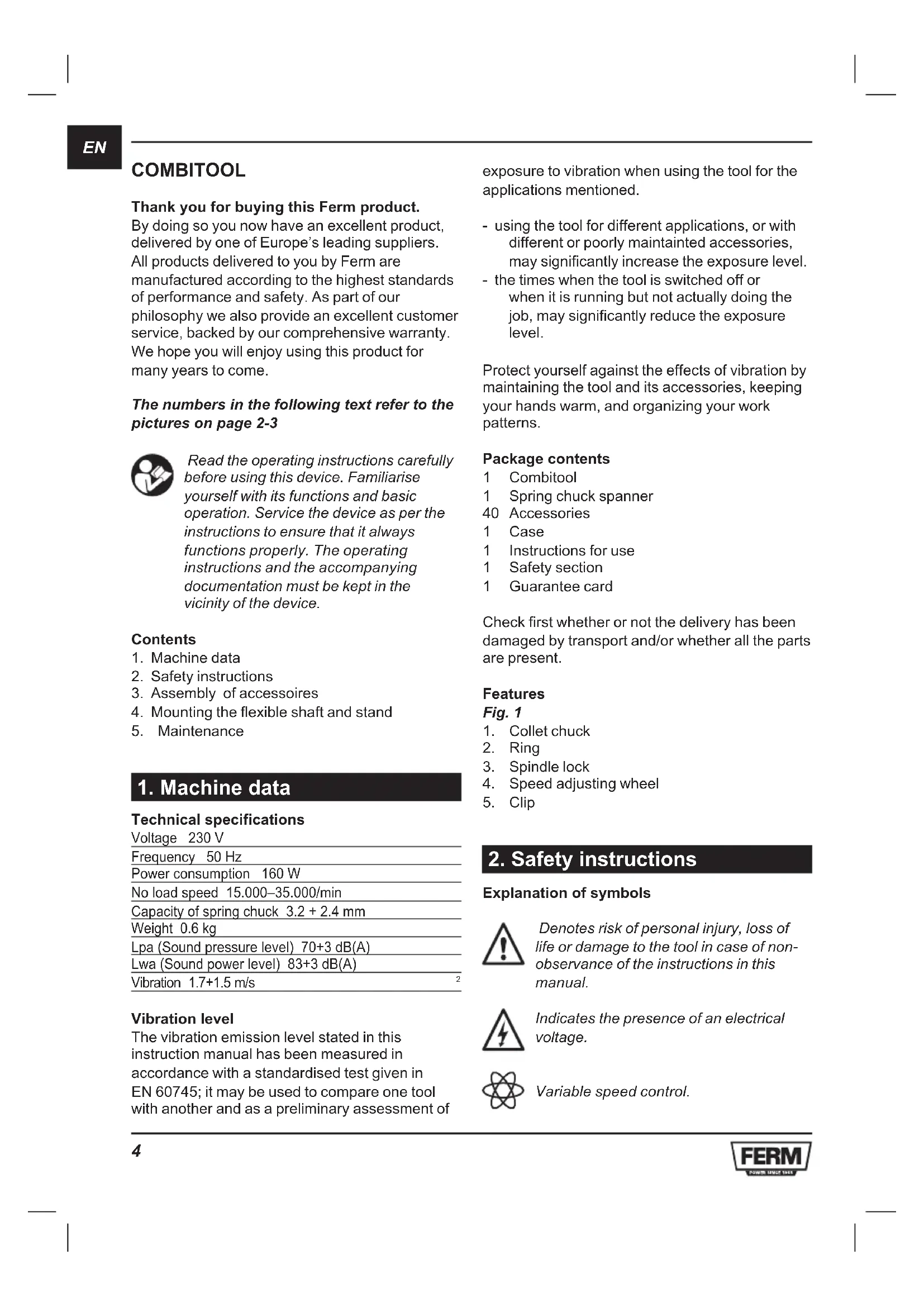 COMBITOOL Thank you for buying this Ferm product. By doing so you now have an excellent product, delivered by one of Europe’s leading suppliers. All products delivered to you by Ferm are manufactured according to the highest standards of performance and safety. As part of our philosophy we also provide an excellent customer service, backed by our comprehensive warranty. We hope you will enjoy using this product for many years to come. The numbers in the following text refer to the pictures on page 2-3 Read the operating instructions carefully before using this device. Familiarise yourself with its functions and basic operation. Service the device as per the instructions to ensure that it always functions properly. The operating instructions and the accompanying documentation must be kept in the vicinity of the device. Contents