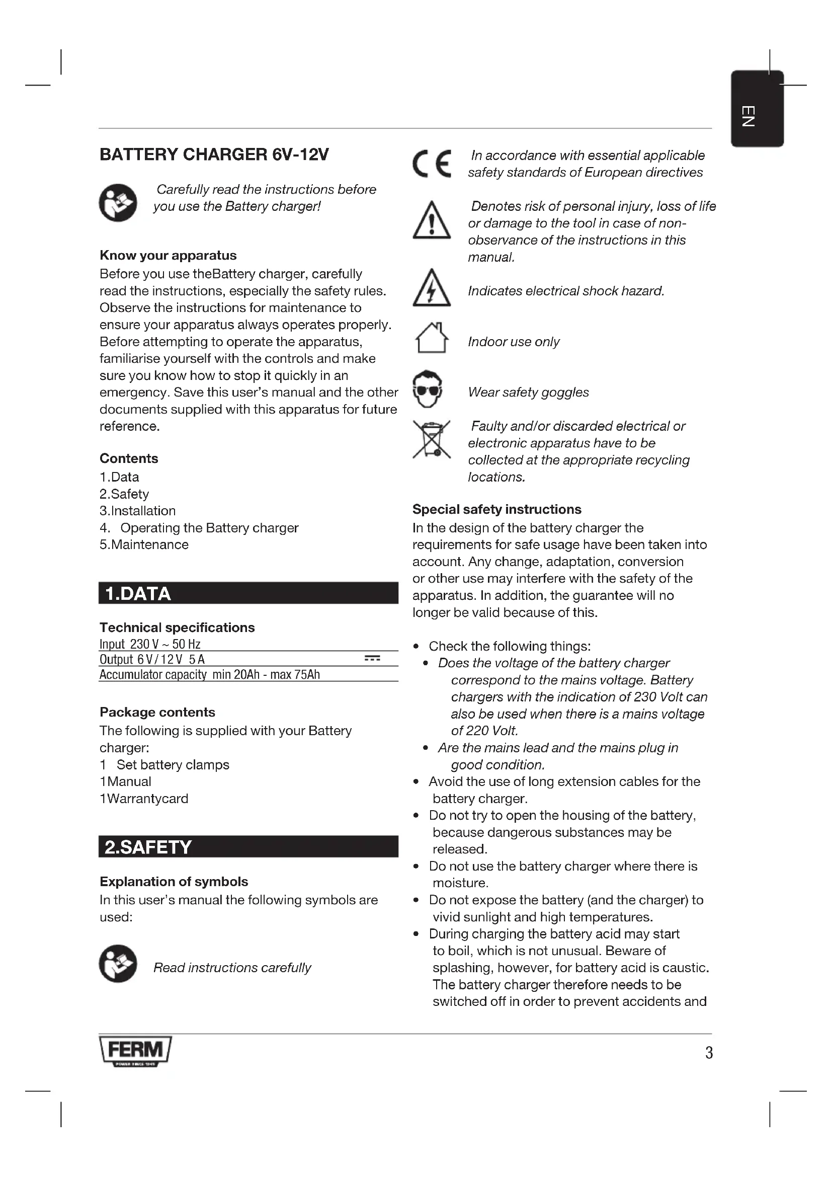 Fig. 2 Fig. 1BATTERY CHARGER 6V-12V Carefully read the instructions before you use the Battery charger! Know your apparatus Before you use theBattery charger, carefully read the instructions, especially the safety rules. Observe the instructions for maintenance to ensure your apparatus always operates properly. Before attempting to operate the apparatus, familiarise yourself with the controls and make sure you know how to stop it quickly in an emergency. Save this user’s manual and the other documents supplied with this apparatus for future reference. Contents