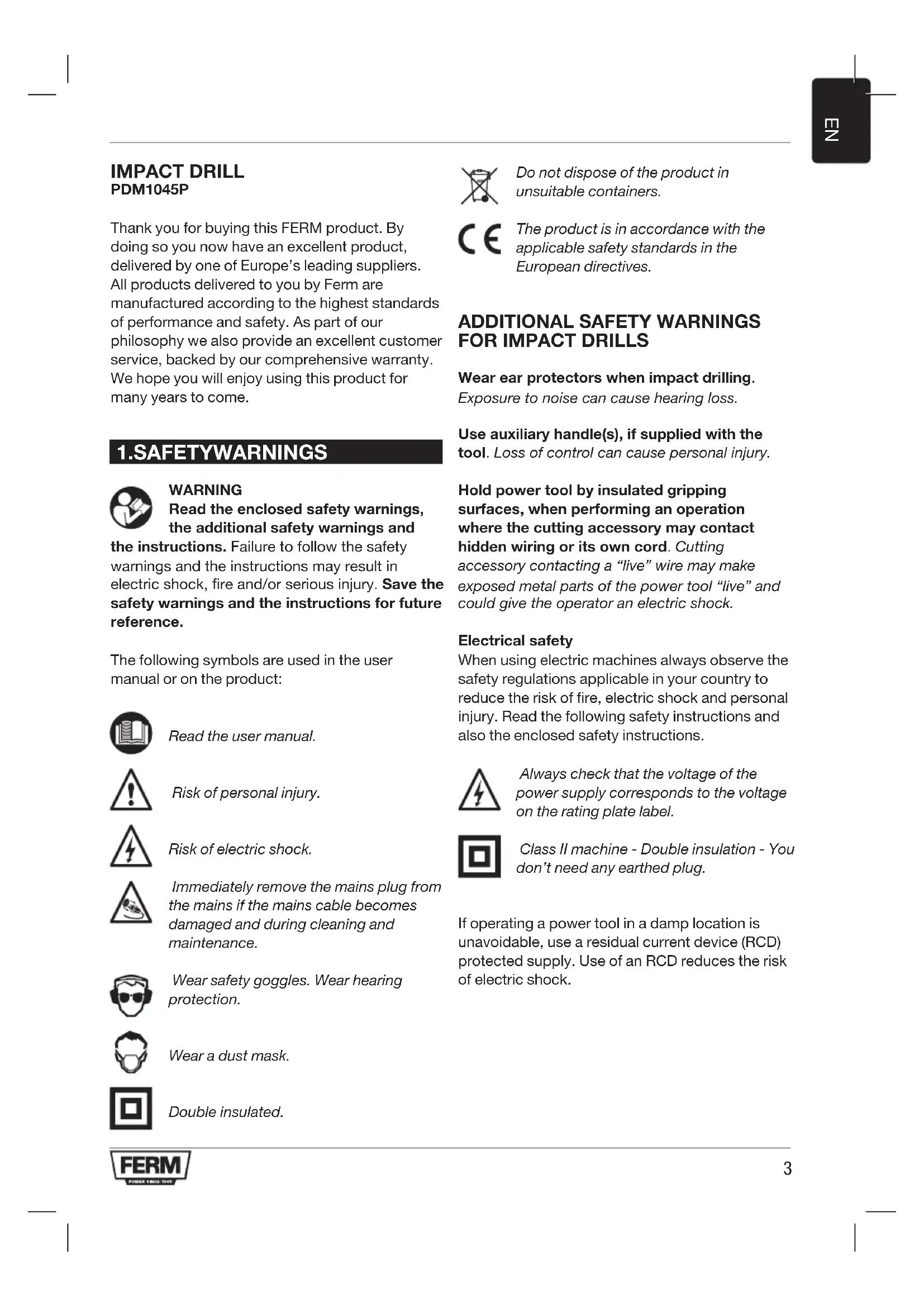 IMPACT DRILL PDM1045P Thank you for buying this FERM product. By doing so you now have an excellent product, delivered by one of Europe’s leading suppliers. All products delivered to you by Ferm are manufactured according to the highest standards of performance and safety. As part of our philosophy we also provide an excellent customer service, backed by our comprehensive warranty. We hope you will enjoy using this product for many years to come.