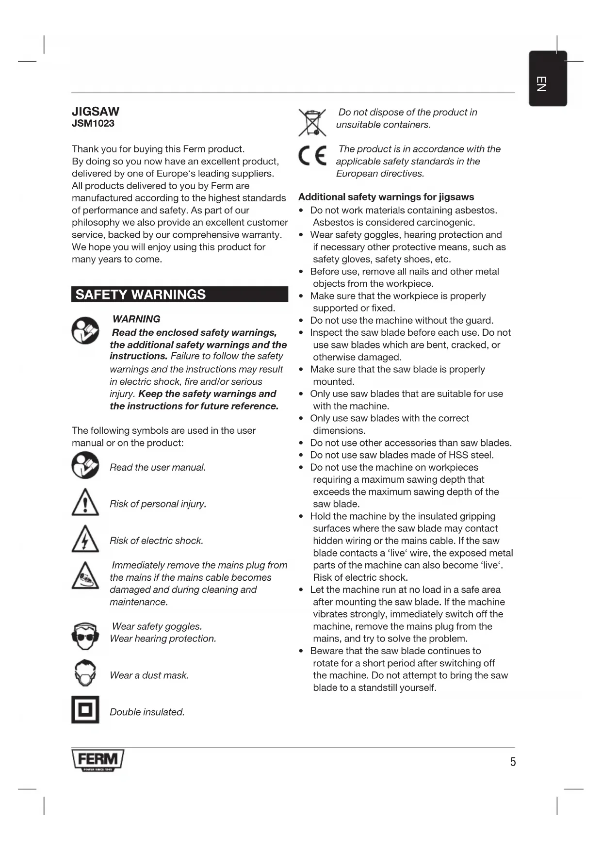 JIGSAW JSM1023 Thank you for buying this Ferm product. By doing so you now have an excellent product, delivered by one of Europe‘s leading suppliers. All products delivered to you by Ferm are manufactured according to the highest standards of performance and safety. As part of our philosophy we also provide an excellent customer service, backed by our comprehensive warranty. We hope you will enjoy using this product for many years to come. SAFETY WARNINGS WARNING Read the enclosed safety warnings, the additional safety warnings and the instructions. Failure to follow the safety warnings and the instructions may result in electric shock, fire and/or serious injury. Keep the safety warnings and the instructions for future reference. The following symbols are used in the user manual or on the product: Read the user manual. Risk of personal injury. Risk of electric shock. Immediately remove the mains plug from the mains if the mains cable becomes damaged and during cleaning and maintenance. Wear safety goggles. Wear hearing protection. Wear a dust mask. Double insulated. Do not dispose of the product in unsuitable containers. The product is in accordance with the applicable safety standards in the European directives. Additional safety warnings for jigsaws