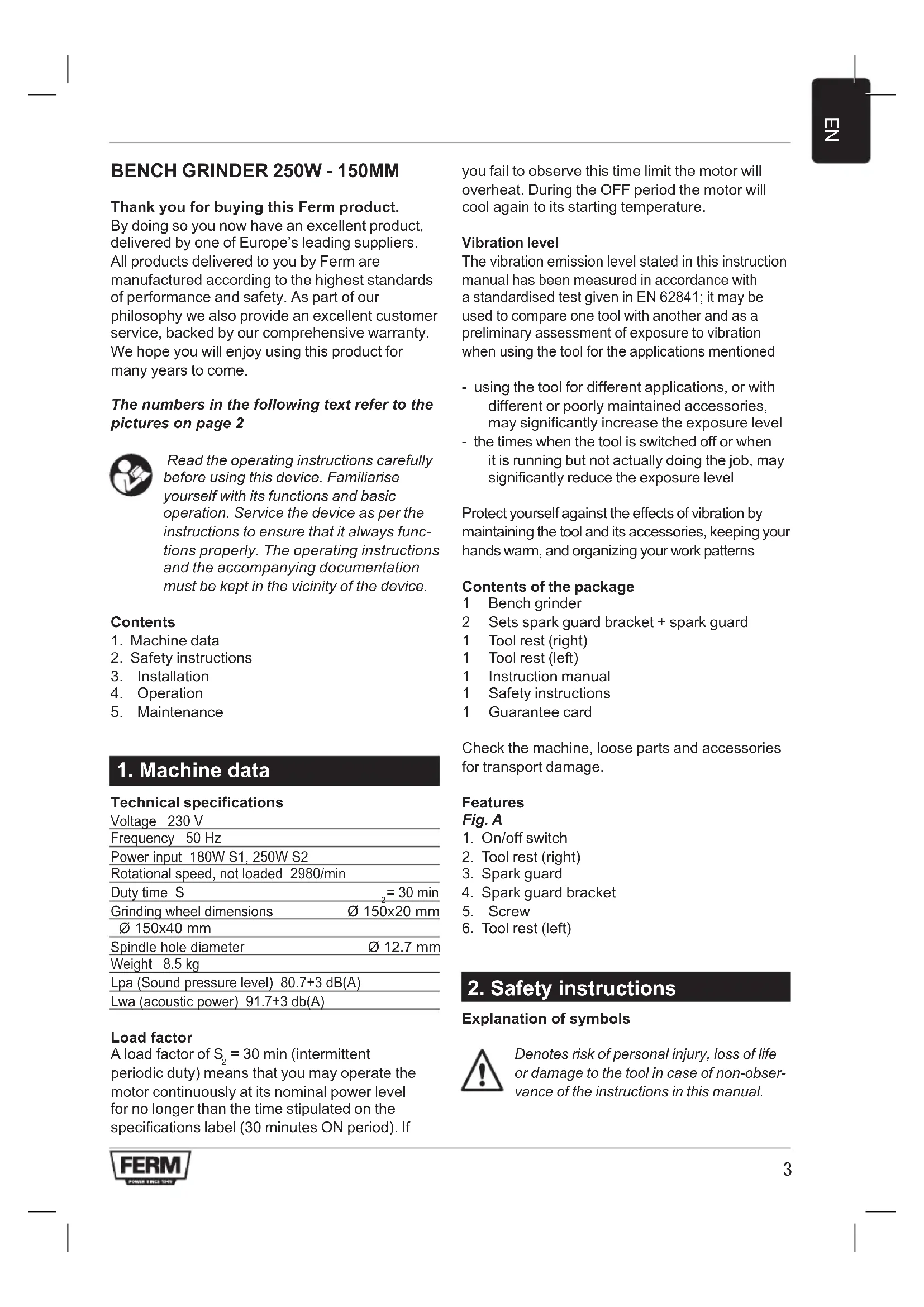 = 30 min (intermittent periodic duty) means that you may operate the motor continuously at its nominal power level for no longer than the time stipulated on the specifications label (30 minutes ON period). If you fail to observe this time limit the motor will overheat. During the OFF period the motor will cool again to its starting temperature. Vibration level The vibration emission level stated in this instruction manual has been measured in accordance with a standardised test given in EN 62841; it may be used to compare one tool with another and as a preliminary assessment of exposure to vibration when using the tool for the applications mentioned - using the tool for different applications, or with different or poorly maintained accessories, may significantly increase the exposure level - the times when the tool is switched off or when it is running but not actually doing the job, may significantly reduce the exposure level Protect yourself against the effects of vibration by maintaining the tool and its accessories, keeping your hands warm, and organizing your work patterns Contents of the package 1 Bench grinder 2 Sets spark guard bracket + spark guard 1 Tool rest (right) 1 Tool rest (left) 1 Instruction manual 1 Safety instructions 1 Guarantee card Check the machine, loose parts and accessories for transport damage. Features Fig. A
