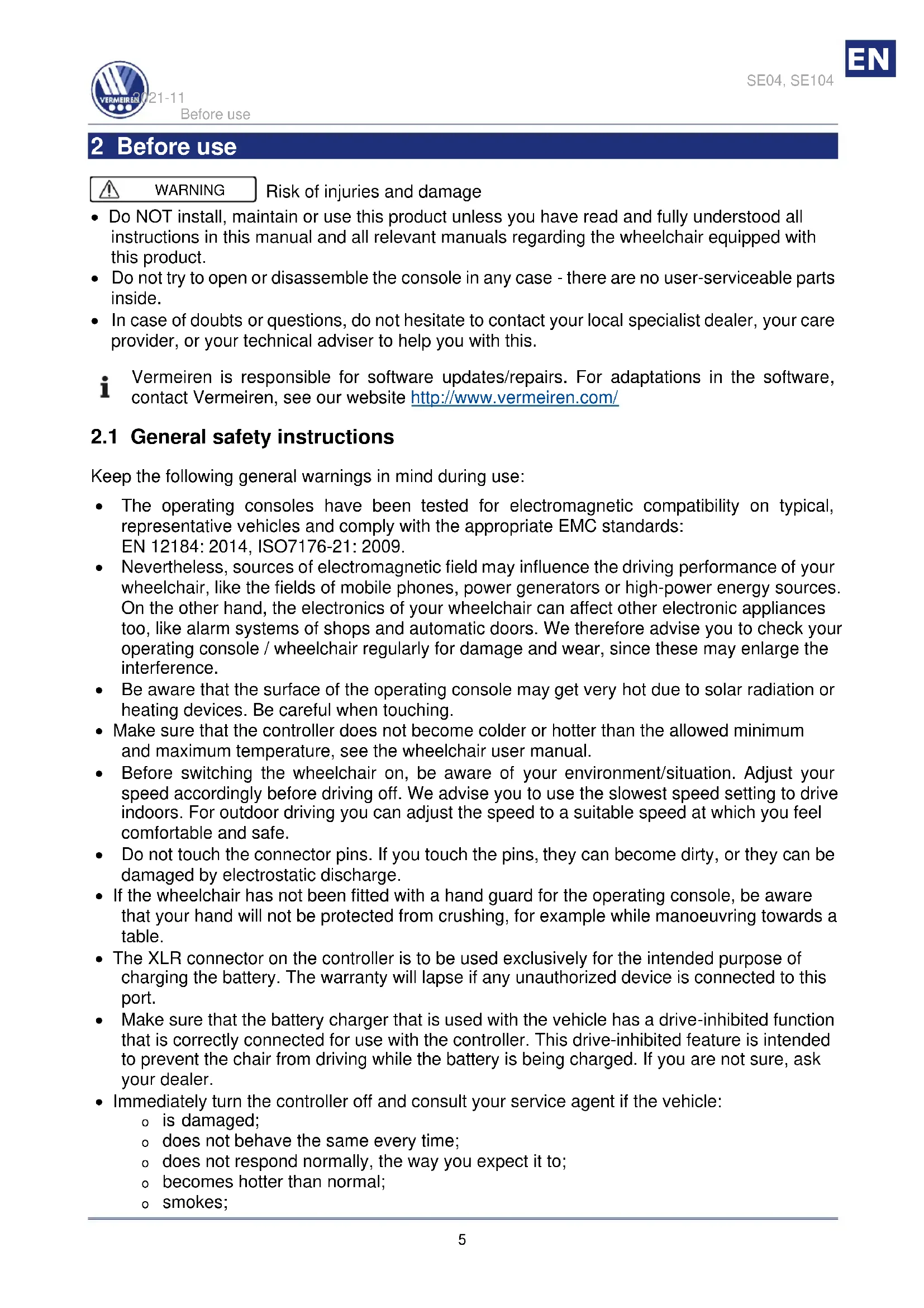 Vermeiren is responsible for software updates/repairs. For adaptations in the software, contact Vermeiren, see our website http://www.vermeiren.com/SE04, SE104 2021-11 Driving
