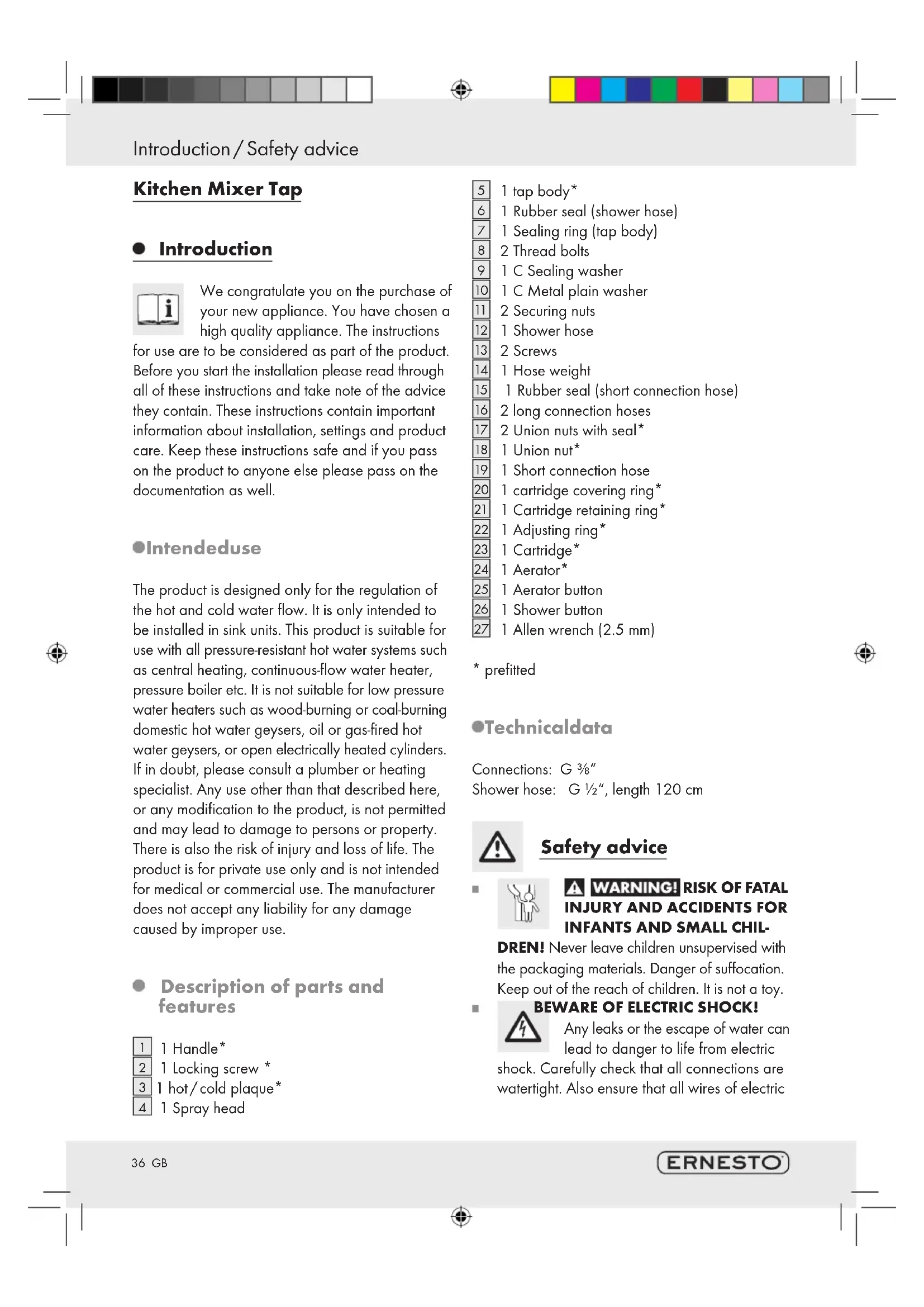- Gratis nummer. Productbeschrijving: Eenhendel mengkraan35 GB Table of Contents Introduction Intended use ........................................................................................................................................ Page 36 Description of parts and features ....................................................................................................... Page 36 Technical data ..................................................................................................................................... Page 36 Safety advice ...............................................................................................................................Page 36 Assembly .........................................................................................................................................Page 37 Preparations for use .............................................................................................................. Page 38 Operation Eco Function / saving water ................................................................................................................Page 38 Setting the scald protection ................................................................................................................Page 38 Switch over rinsing spray ....................................................................................................................Page 39 Maintenance and Cleaning Maintaining and cleaning the tap .....................................................................................................Page 39 Replacing the cartridge ......................................................................................................................Page 39 Disposal ............................................................................................................................................Page 40 Information Potability of tap water .........................................................................................................................Page 40 Warranty and Service .......................................................................................................... Page 4036 GB Kitchen Mixer Tap Introduction We congratulate you on the purchase of your new appliance. You have chosen a high quality appliance. The instructions for use are to be considered as part of the product. Before you start the installation please read through all of these instructions and take note of the advice they contain. These instructions contain important information about installation, settings and product care. Keep these instructions safe and if you pass on the product to anyone else please pass on the documentation as well. Intended use The product is designed only for the regulation of the hot and cold water flow. It is only intended to be installed in sink units. This product is suitable for use with all pressure-resistant hot water systems such as central heating, continuous-flow water heater, pressure boiler etc. It is not suitable for low pressure water heaters such as wood-burning or coal-burning domestic hot water geysers, oil or gas-fired hot water geysers, or open electrically heated cylinders. If in doubt, please consult a plumber or heating specialist. Any use other than that described here, or any modification to the product, is not permitted and may lead to damage to persons or property. There is also the risk of injury and loss of life. The product is for private use only and is not intended for medical or commercial use. The manufacturer does not accept any liability for any damage caused by improper use. Description of parts and features