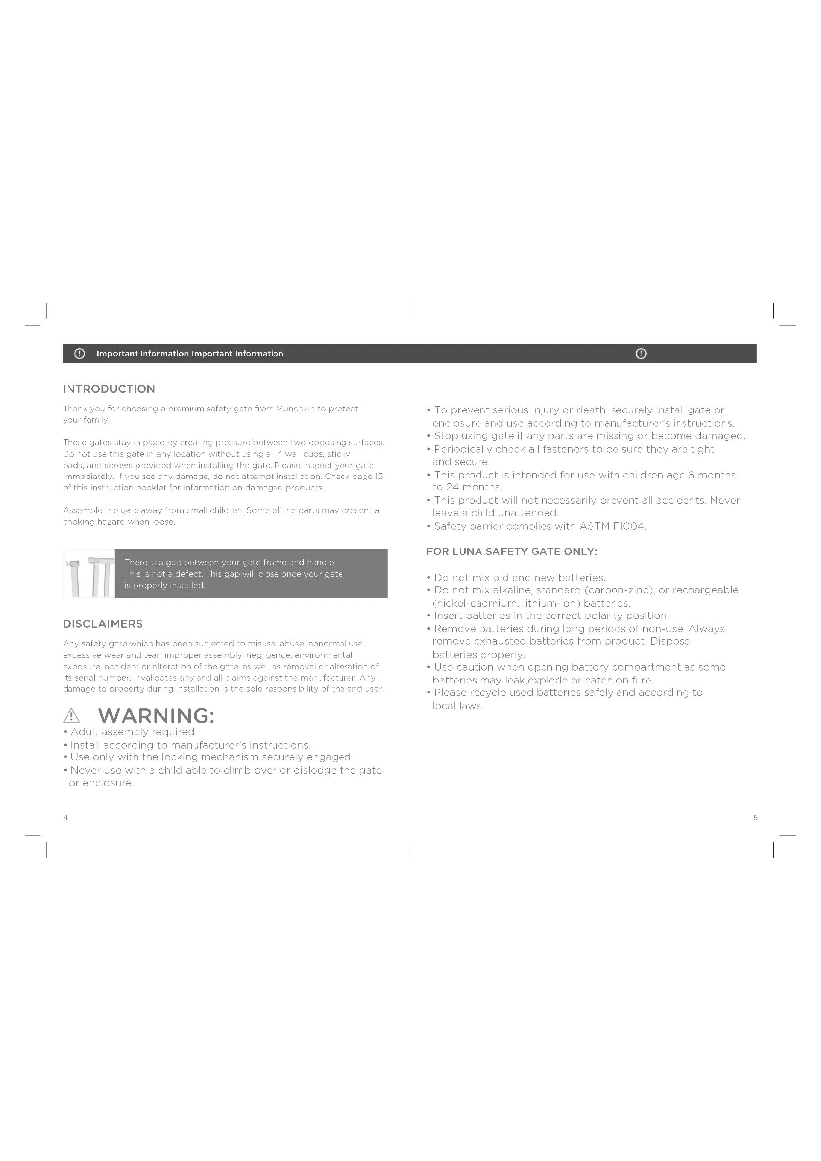 Contents | Contenido | Contenu4 5 Important Information Important Information INTRODUCTION DISCLAIMERS Thank you for choosing a premium safety gate from Munchkin to protect your family. These gates stay in place by creating pressure between two opposing surfaces. Do not use this gate in any location without using all 4 wall cups, sticky pads, and screws provided when installing the gate. Please inspect your gate immediately. If you see any damage, do not attempt installation. Check page 15 of this instruction booklet for information on damaged products. Assemble the gate away from small children. Some of the parts may present a choking hazard when loose.