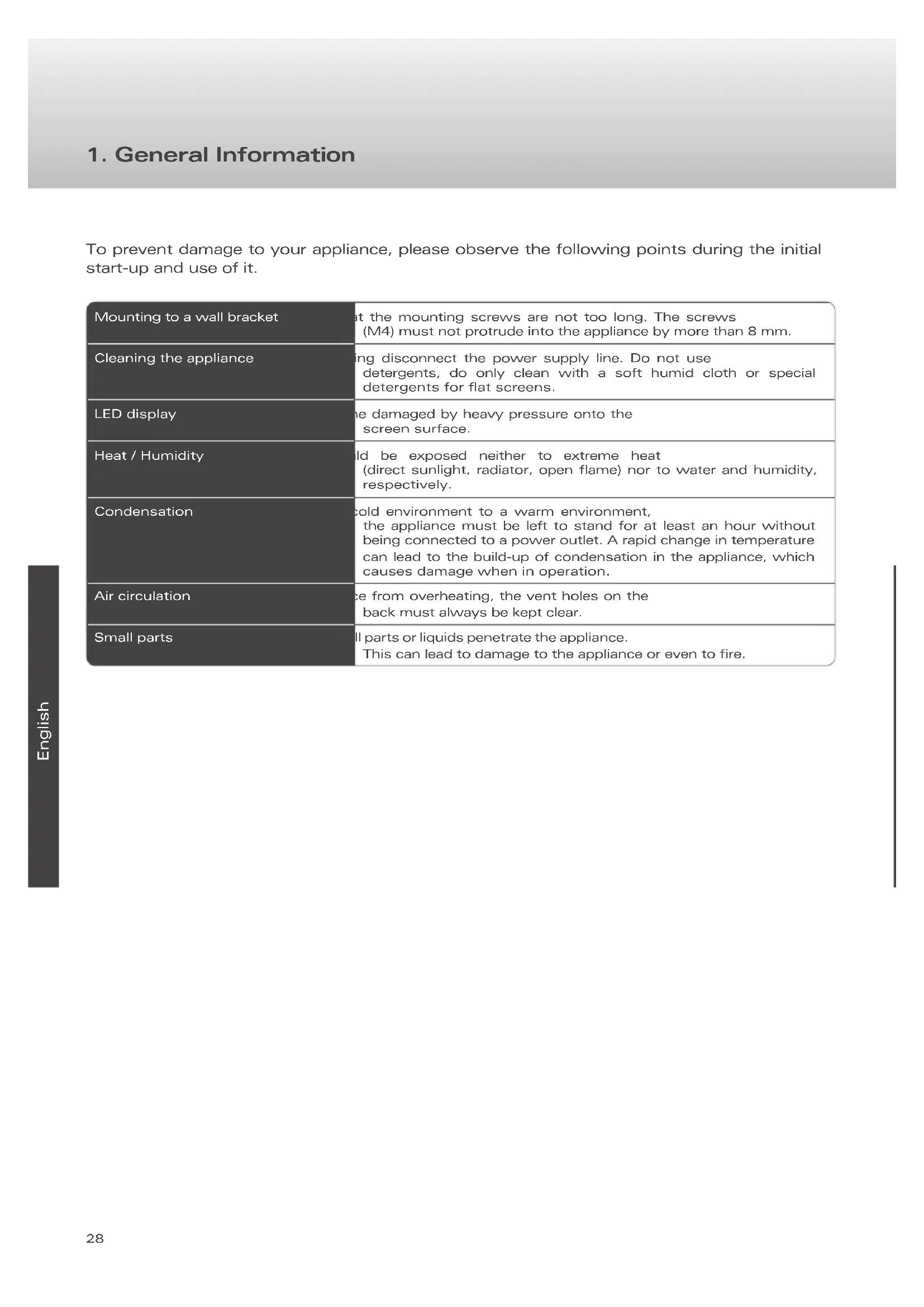 Mounting to a wall bracket Ensure that the mounting screws are not too long. The screws (M4) must not protrude into the appliance by more than 8 mm. Cleaning the appliance Prior to cleaning disconnect the power supply line. Do not use detergents, do only clean with a soft humid cloth or special detergents for flat screens. LED display The appliance can become damaged by heavy pressure onto the screen surface. Heat / Humidity The appliance should be exposed neither to extreme heat (direct sunlight, radiator, open flame) nor to water and humidity, respectively. Condensation After moving from a cold environment to a warm environment, the appliance must be left to stand for at least an hour without being connected to a power outlet. A rapid change in temperature can lead to the build-up of condensation in the appliance, which causes damage when in operation. Air circulation To prevent the appliance from overheating, the vent holes on the back must always be kept clear. Small parts Please ensure that no small parts or liquids penetrate the appliance. This can lead to damage to the appliance or even to fire. To prevent damage to your appliance, please observe the following points during the initial start-up and use of it.29 English