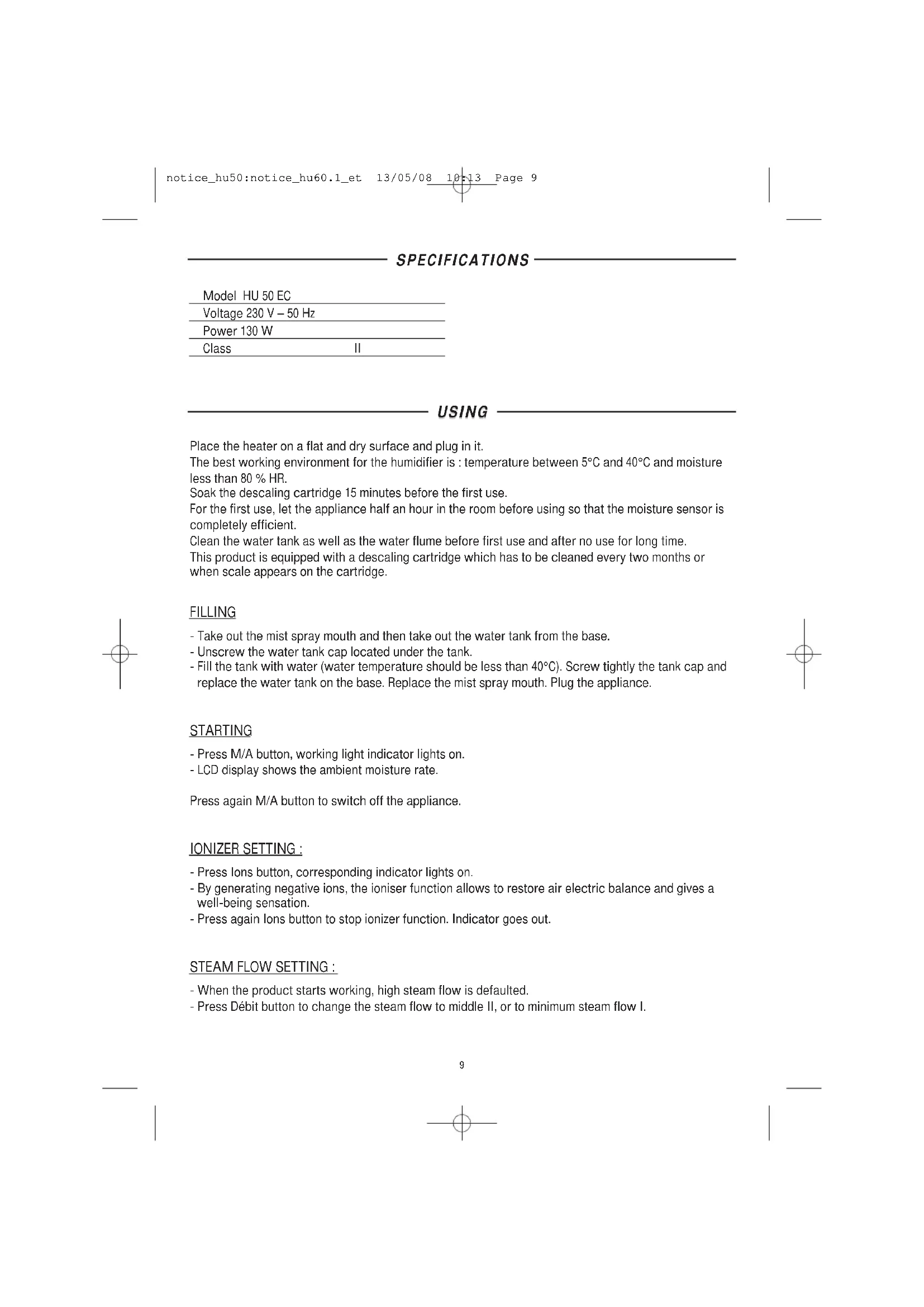 notice_hu50:notice_hu60.1_et 13/05/08 10:13 Page 8SPECIFICATIONS SPECIFICATIONS Model HU 50 EC Voltage 230 V – 50 Hz Power 130 W Class II USING USING Place the heater on a flat and dry surface and plug in it. The best working environment for the humidifier is : temperature between 5°C and 40°C and moisture less than 80 % HR. Soak the descaling cartridge 15 minutes before the first use. For the first use, let the appliance half an hour in the room before using so that the moisture sensor is completely efficient. Clean the water tank as well as the water flume before first use and after no use for long time. This product is equipped with a descaling cartridge which has to be cleaned every two months or when scale appears on the cartridge. FILLING - Take out the mist spray mouth and then take out the water tank from the base. - Unscrew the water tank cap located under the tank. - Fill the tank with water (water temperature should be less than 40°C). Screw tightly the tank cap and replace the water tank on the base. Replace the mist spray mouth. Plug the appliance. STARTING - Press M/A button, working light indicator lights on. - LCD display shows the ambient moisture rate. Press again M/A button to switch off the appliance. IONIZER SETTING : - Press Ions button, corresponding indicator lights on. - By generating negative ions, the ioniser function allows to restore air electric balance and gives a well-being sensation. - Press again Ions button to stop ionizer function. Indicator goes out. STEAM FLOW SETTING : - When the product starts working, high steam flow is defaulted. - Press Débit button to change the steam flow to middle II, or to minimum steam flow I.