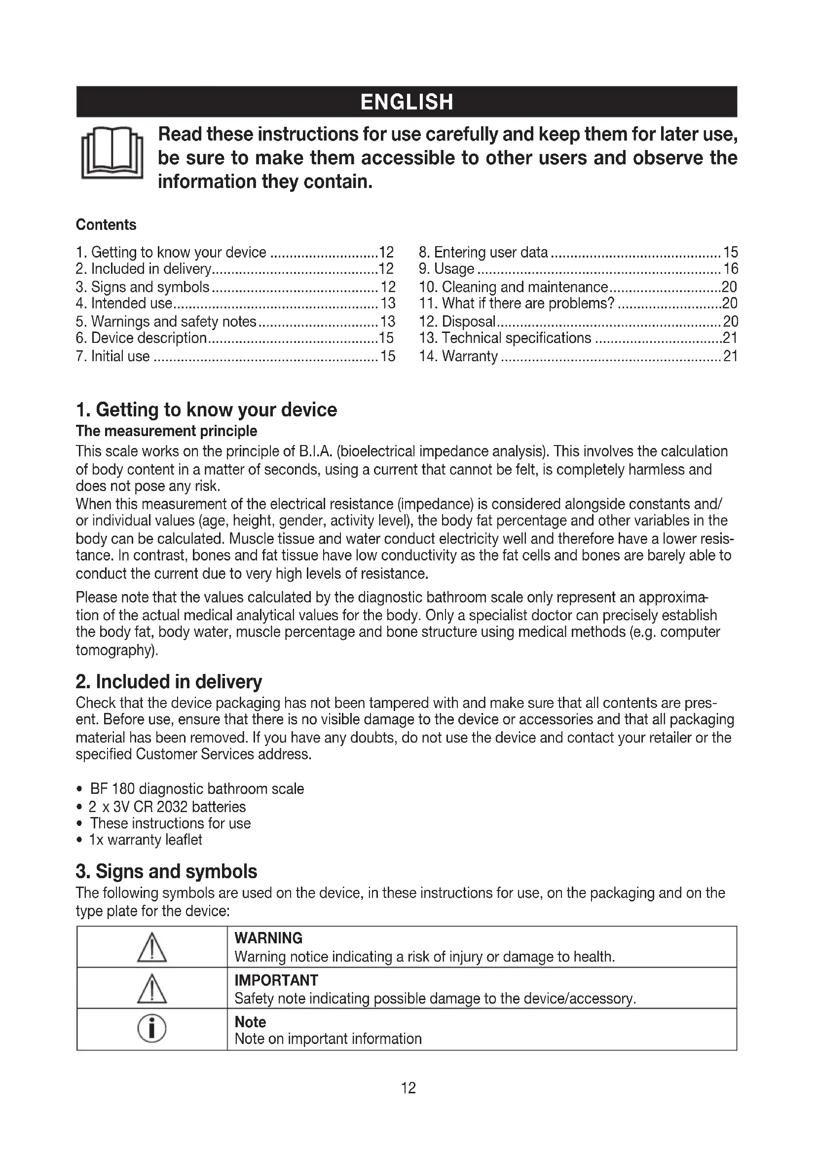 tor). Male Female Age Low Normal Moderate High Age Low Normal Moderate High 10–14 <11% 11–16% 16.1–21% >21.1% 10–14 <16% 16–21% 21.1–26% >26.1% 15–19 <12% 12–17% 17.1–22% >22.1% 15–19 <17% 17–22% 22.1–27% >27.1% 20–29 <13% 13 –18% 18.1–23% >23.1% 20–29 <18% 18–23% 23.1–28% >28.1% 30–39 <14% 14–19% 19.1–24% >24.1% 30–39 <19% 19–24% 24.1–29% >29.1% 40–49 <15% 15–20% 20.1–25% >25.1% 40–49 <20% 20–25% 25.1–30% >30.1% 50–59 <16% 16–21% 21.1–26% >26.1% 50–59 <21% 21–26% 26.1–31% >31.1% 60–69 <17% 17–22% 22.1–27% >27.1% 60–69 <22% 22–27% 27.1–32% >32.1% 70–100 <18% 18–23% 23.1–28% >28.1% 70–100 <23% 23–28% 28.1–33% >33.1% Values will often be lower for fitness enthusiasts. Depending on the sporting activities performed, the train- ing intensity and the physical constitution, the results may still be below the stated standard values. Please note, however, that there may be a risk to health in the case of extremely low values. Body water content The body water content in % is normally within the following ranges: Male Female Age Poor Good Very good Age Poor Good Very good 10–100 <50% 50–65% >65% 10–100 <45% 45–60% >60% Body fat contains relatively little water, therefore body water content may be below the standard values in persons with a high body fat percentage. On the other hand, endurance athletes may exceed the standard values due to having low levels of fat and a high muscle percentage. The body water calculation performed using this scale is not suitable for drawing medical conclusions, for example in the case of age-related water retention. Consult your doctor where necessary. A high body water content is generally desirable.18 Muscle percentage The muscle percentage is normally within the following ranges: Male Female Age Low Normal High Age Low Normal High 10–14 <44% 44–57% >57% 10–14 <36% 36–43% >43% 15–19 <43% 43–56% >56% 15–19 <35% 35–41% >41% 20–29 <42% 42–54% >54% 20–29 <34% 34–39% >39% 30–39 <41% 41–52% >52% 30–39 <33% 33–38% >38% 40–49 <40% 40–50% >50% 40–49 <31% 31–36% >36% 50–59 <39% 39–48% >48% 50–59 <29% 29–34% >34% 60–69 <38% 38–47% >47% 60–69 <28% 28–33% >33% 70–100 <37% 37–46% >46% 70–100 <27% 27–32% >32% Bone mass Like the rest of our body, our bones are subject to natural growth, shrinking and ageing processes. Bone mass increases rapidly during childhood and reaches its peak between the ages of 30 and 40. As we age, our bone mass then begins to reduce. You can combat this reduction to an extent with the help of a healthy diet (particularly calcium and vitamin D) and regular physical exercise. The stability of your skeleton can be further increased by means of targeted muscle build-up. Please note that this scale does not identify the total bone mass, but rather just the mineral content of the bone (without water content and without organic substances). It is very difficult to influence the bone mass, although it does fluctuate slightly within the scope of influencing factors (weight, height, age, gender). There are no recognised guidelines or recommendations. IMPORTANT: Please do not confuse bone mass with bone density. The bone density can only be determined by means of a medical examination (e.g. computer tomography, ultrasound). It is therefore not possible to draw conclusions on changes to bones and bone hardness (e.g. osteoporosis) using this scale. BMR The basal metabolic rate (BMR) is the amount of energy required by the body at complete rest in order to maintain its basic functions (e.g. when lying in bed 24 hours a day). This value is primarily dependent on weight, height and age. It is displayed on the diagnostic bathroom scale in the kcal/day unit and is calculated using the scientifi
