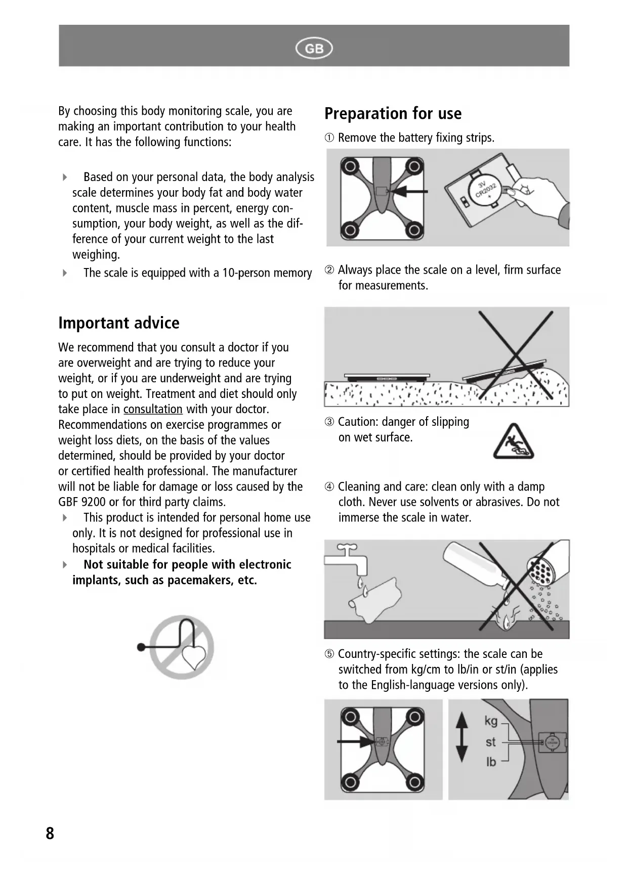 We recommend that you consult a doctor if you are overweight and are trying to reduce your weight, or if you are underweight and are trying to put on weight. Treatment and diet should only take place in consultation with your doctor. Recommendations on exercise programmes or weight loss diets, on the basis of the values determined, should be provided by your doctor or certified health professional. The manufacturer will not be liable for damage or loss caused by the GBF 9200 or for third party claims.