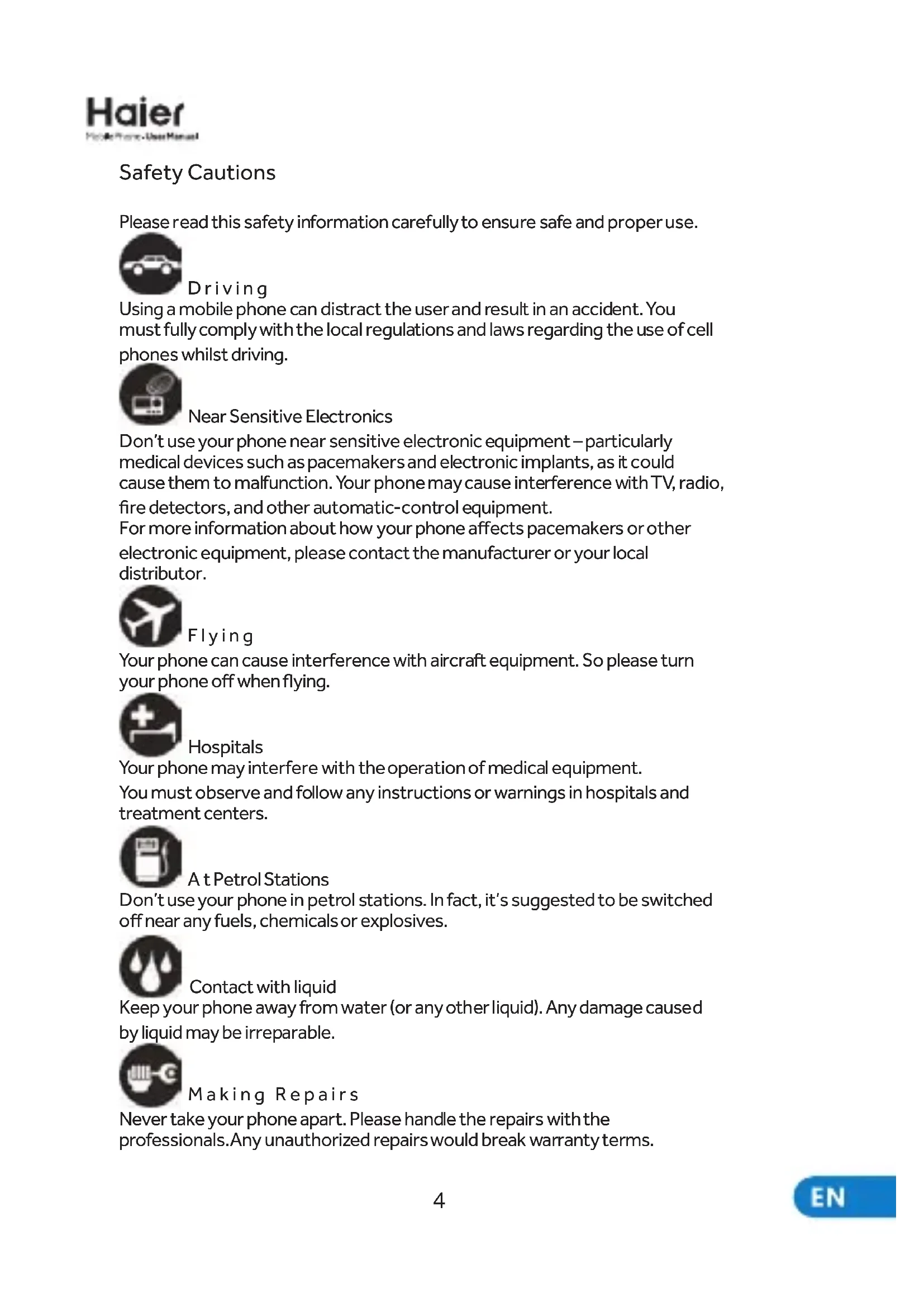 Battery'coverSIM2/TF1 SIM1 SIM2/TF1 SIM1 SIM2/TF1 SIM1 Nano'SIM+Micro'SIM MicroSD'''+'Micro'SIM! Legal Notice This document, whether in part or whole, shall not be reproduced or transmitted in any way, shape, or form without the prior written consent of Haier. is a trademark of Haier Telecom Co., Ltd. Haier reserves the right to modify the information contained in this guide at any time. Disclaimer THIRD PARTY SERVICES AND CON TENT ARE D ELIVERED «AS IS». HAIER DOES NOT GUARANTEE THE CONTENT AND SERVICES SO DELIVERED, EITHER EXPRESS LY OR IMPLICITLY, F O R ANY PURPOSE WHATSOEVER AS WELL AS WARRANTIES OF MERCHANTABILITY AND FITNESS FOR A PARTICULAR PURPOSE. HAIER DOES NOT GUARANTEE THE ACCURACY, V A LIDITY, LEGALITY OR EXHAUSTIVENESS OF THE CONTENT OR SERVICES PROVIDED BY THIS DEVICE. HAIER SHALL NOT BE LIABLE FOR NEGLIGENCE, WHETHER IN CONTRACT OR IN TORT, FOR ANY DIRECT, INDIRECT, INCIDENTAL OR SPECIAL DAMAGES, LEGAL FEES, EXPENSES OR ANY OTHER DAMAGE ARISING FROM USE OF THE CONTENT OR SERVICES BY YOURSELF OR BY A THIRD PARTY EVEN IF HAIER HAS BEEN ADVISED OF THE POSS IBILITY OF SUCH INCONVENIENCES. AS SOME COUNTRIES DO NOT ALLOW THE EXCLUSION OF IMPLIED WARRANTY OR LIMITATIONS ON THE LEGAL RIGHTS OF CONSUMERS, IT IS POSS IBLE THAT THESE EXCLUSIONS AND LIMITATIONS MAY NOT APPLY TO Y O U. 3Safety Cautions Please read this safety information carefully to ensure safe and proper use. Driving Using a mobile phone can distract the user and result in an accident. You must fully comply with the local regulations and laws regarding the use of cell phones whilst driving. Near Sensitive Electronics Don’t use your phone near sensitive electronic equipment – particularly medical devices such as pacemakers and electronic implants, as it could cause them to malfunction. Your phone may cause interference with TV, radio, ƪre detectors, and other automatic-control equipment. For more information about how your phone aƩects pacemakers or other electronic equipment, please contact the manufacturer or your local distributor. Flying Your phone can cause interference with aircraft equipment. So please turn your phone oƩ when ƫying. Hospitals Your phone may interfere with the operation of medical equipment. You must observe and follow any instructions or warnings in hospitals and treatment centers. At Petrol Stations Don’t use your phone in petrol stations. In fact, it’s suggested to be switched oƩ near any fuels, chemicals or explosives. Contact with liquid Keep your phone away from water (or any other liquid). Any damage caused by liquid may be irreparable. Making Repairs Never take your phone apart. Please handle the repairs with the professionals. Any unauthorized repairs would break warranty terms. 4Broken Antenna Don’t use your phone if the antenna is damaged, as it could cause injury. Around Children Keep your mobile out of children’s reach. It should never be used as a toy and it might not be good for their health. Original Accessories Only use the original accessories supplied with your phone or those approved by the manufacturer. The use of unauthorized accessories may damage your phone or cause a safety risk. Near Explosives and Fire hazard Turn oƩ your phone in or near explosive materials or heat sources such as radiators or cookers. Always obey local regulations and laws. Turn oƩ your phone when requested. Emergency Calls To ma ke an emergency call your phone must be turned on and in an area where there’s network coverage. Dial the national emergency number and press ‘send’. Explain exactly where you are and don’t hang up until help has arrived.