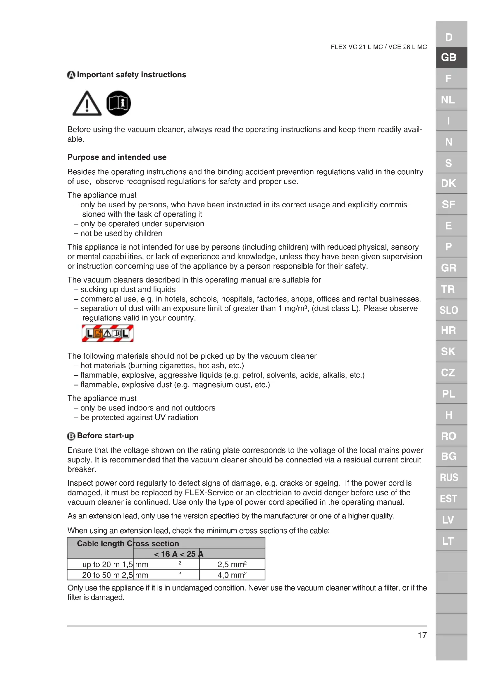 FLEX VC 21 L MC / VCE 26 L MC Important safety instructions Before using the vacuum cleaner, always read the operating instructions and keep them readily avail- able. Purpose and intended use Besides the operating instructions and the binding accident prevention regulations valid in the country of use, observe recognised regulations for safety and proper use. The appliance must – only be used by persons, who have been instructed in its correct usage and explicitly commis- sioned with the task of operating it – only be operated under supervision – not be used by children This appliance is not intended for use by persons (including children) with reduced physical, sensory or mental capabilities, or lack of experience and knowledge, unless they have been given supervision or instruction concerning use of the appliance by a person responsible for their safety. The vacuum cleaners described in this operating manual are suitable for – sucking up dust and liquids – commercial use, e.g. in hotels, schools, hospitals, factories, shops, offices and rental businesses. – separation of dust with an exposure limit of greater than 1 mg/m³, (dust class L). Please observe regulations valid in your country. The following materials should not be picked up by the vacuum cleaner – hot materials (burning cigarettes, hot ash, etc.) – flammable, explosive, aggressive liquids (e.g. petrol, solvents, acids, alkalis, etc.) – flammable, explosive dust (e.g. magnesium dust, etc.) The appliance must – only be used indoors and not outdoors – be protected against UV radiation Before start-up Ensure that the voltage shown on the rating plate corresponds to the voltage of the local mains power supply. It is recommended that the vacuum cleaner should be connected via a residual current circuit breaker. Inspect power cord regularly to detect signs of damage, e.g. cracks or ageing. If the power cord is damaged, it must be replaced by FLEX-Service or an electrician to avoid danger before use of the vacuum cleaner is continued. Use only the type of power cord specified in the operating manual. As an extension lead, only use the version specified by the manufacturer or one of a higher quality. When using an extension lead, check the minimum cross-sections of the cable: Cable length Cross section < 16 A < 25 A up to 20 m 1,5 mm