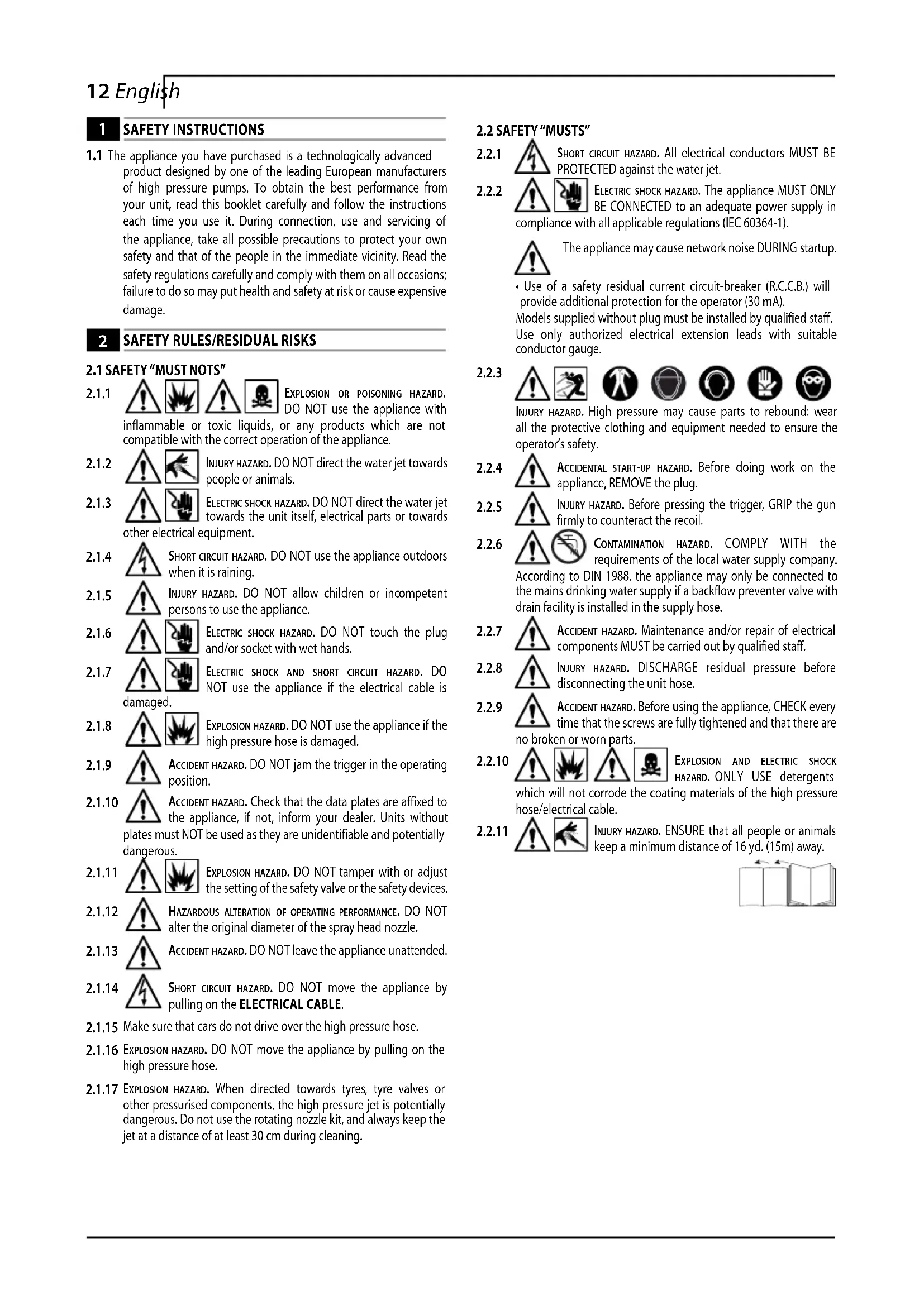 product designed by one of the leading European manufacturers of high pressure pumps. To obtain the best performance from your unit, read this booklet carefully and follow the instructions each time you use it. During connection, use and servicing of the appliance, take all possible precautions to protect your own safety and that of the people in the immediate vicinity. Read the safety regulations carefully and comply with them on all occasions; failure to do so may put health and safety at risk or cause expensive damage.