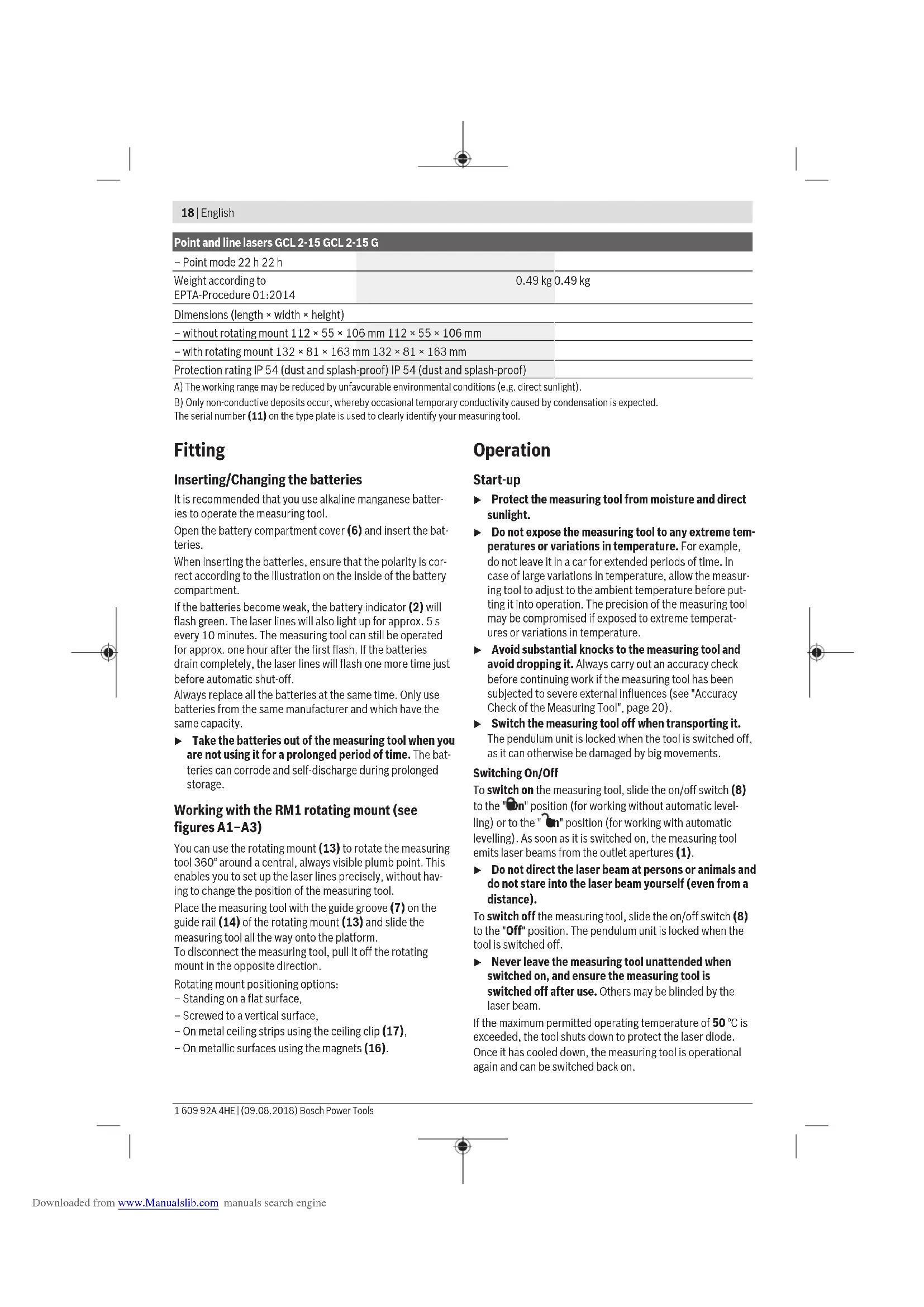 – Divergence 0.8mrad (full angle) 0.8mrad (full angle) Tripod mount 1/4", 5/8" 1/4", 5/8" Batteries 3×1.5V LR6(AA) 3×1.5V LR6(AA) Operating duration in operating mode – Cross-line and point mode 6h 6h – Cross-line mode 8h 8h – Line and point mode 12 h 10 h – Line mode 16 h 12 h English | 17 Bosch Power Tools 1 609 92A 4HE | (09.08.2018) Downloaded from www.Manualslib.com manuals search engine18 | English 1 609 92A 4HE | (09.08.2018) Bosch Power Tools Point and line lasers GCL 2-15 GCL 2-15 G – Point mode 22 h 22 h Weight according to EPTA-Procedure 01:2014 0.49kg 0.49kg Dimensions (length× width× height) – without rotating mount 112×55×106mm 112×55×106mm – with rotating mount 132×81×163mm 132×81×163mm Protection rating IP 54 (dust and splash-proof) IP 54 (dust and splash-proof) A) The working range may be reduced by unfavourable environmental conditions (e.g. direct sunlight).B) Only non-conductive deposits occur, whereby occasional temporary conductivity caused by condensation is expected.The serial number (11) on the type plate is used to clearly identify your measuring tool. Fitting Inserting/Changing the batteries It is recommended that you use alkaline manganese batter- ies to operate the measuring tool. Open the battery compartment cover (6) and insert the bat- teries. When inserting the batteries, ensure that the polarity is cor- rect according to the illustration on the inside of the battery compartment. If the batteries become weak, the battery indicator(2) will flash green. The laser lines will also light up for approx. 5s every 10minutes. The measuring tool can still be operated for approx. one hour after the first flash. If the batteries drain completely, the laser lines will flash one more time just before automatic shut-off. Always replace all the batteries at the same time. Only use batteries from the same manufacturer and which have the same capacity. u Take the batteries out of the measuring tool when you are not using it for a prolonged period of time. The bat- teries can corrode and self-discharge during prolonged storage. Working with the RM1 rotating mount (see figuresA1–A3) You can use the rotating mount(13) to rotate the measuring tool 360° around a central, always visible plumb point. This enables you to set up the laser lines precisely, without hav- ing to change the position of the measuring tool. Place the measuring tool with the guide groove(7) on the guide rail(14) of the rotating mount(13) and slide the measuring tool all the way onto the platform. To disconnect the measuring tool, pull it off the rotating mount in the opposite direction. Rotating mount positioning options: – Standing on a flat surface, – Screwed to a vertical surface, – On metal ceiling strips using the ceiling clip(17), – On metallic surfaces using the magnets(16). Operation Start-up u Protect the measuring tool from moisture and direct sunlight. u Do not expose the measuring tool to any extreme tem- peratures or variations in temperature. For example, do not leave it in a car for extended periods of time. In case of large variations in temperature, allow the measur- ing tool to adjust to the ambient temperature before put- ting it into operation. The precision of the measuring tool may be compromised if exposed to extreme temperat- ures or variations in temperature. u Avoid substantial knocks to the measuring tool and avoid dropping it. Always carry out an accuracy check before continuing work if the measuring tool has been subjected to severe external influences (see "Accuracy Check of the Measuring Tool", page20). u Switch the measuring tool off when transporting it. The pendulum unit is locked when the tool is switched off, as it can otherwise be damaged by big movements. Switching On/Off To switch on the measuring tool, slide the on/off switch (8) to the " On" position (for working without automatic level- ling) or to the " On" position (for working with automatic levelling). As soon as it is switched on, the measuring tool emits laser beams from the outlet apertures(1). u Do not direct the laser beam at persons or animals and do not stare into the laser beam yourself (even from a distance). To switch off the measuring tool, slide the on/off switch (8) to the "Off" position. The pendulum unit is locked when the tool is switched off. u Never leave the measuring tool unattended when switched on, and ensure the measuring tool is switched off after use. Others may be blinded by the laser beam. If the maximum permitted operating temperature of 50 °C is exceeded, the tool shuts down to protect the laser diode. Once it has cooled down, the measuring tool is operational again and can be switched back on. Downloaded from www.Manualslib.com manuals search engineAutomatic Shut-Off If no button on the measuring tool is pressed for approx. 120 min., the measuring tool will automatically switch itself off to preserve battery life. To switch the measuring tool back on after it has been auto- matically switched off, you can either slide the on/off switch(8) to the "Off" position first and then switch the measuring tool back on, or press either the laser point mode button(4) or the laser line mode button(5). Temporarily Deactivating Automatic Shut-Off To deactivate the automatic shut-off function, hold down the laser line mode button(5) for at least 3s (with the measur- ing tool switched on). If the automatic shut-off function is deactivated, the laser beams will flash briefly as confirma- tion. Note: If the operating temperature exceeds 45°C, automatic shut-off can no longer be deactivated. To activate the automatic shut-off function, switch the meas- uring tool off and on again. Setting the Operating Mode The measuring tool has several operating modes which you can switch between at any time: – Cross-line and point mode: The measuring tool gener- ates a horizontal and a vertical laser line as well as two vertical laser points, one facing up, the other down.