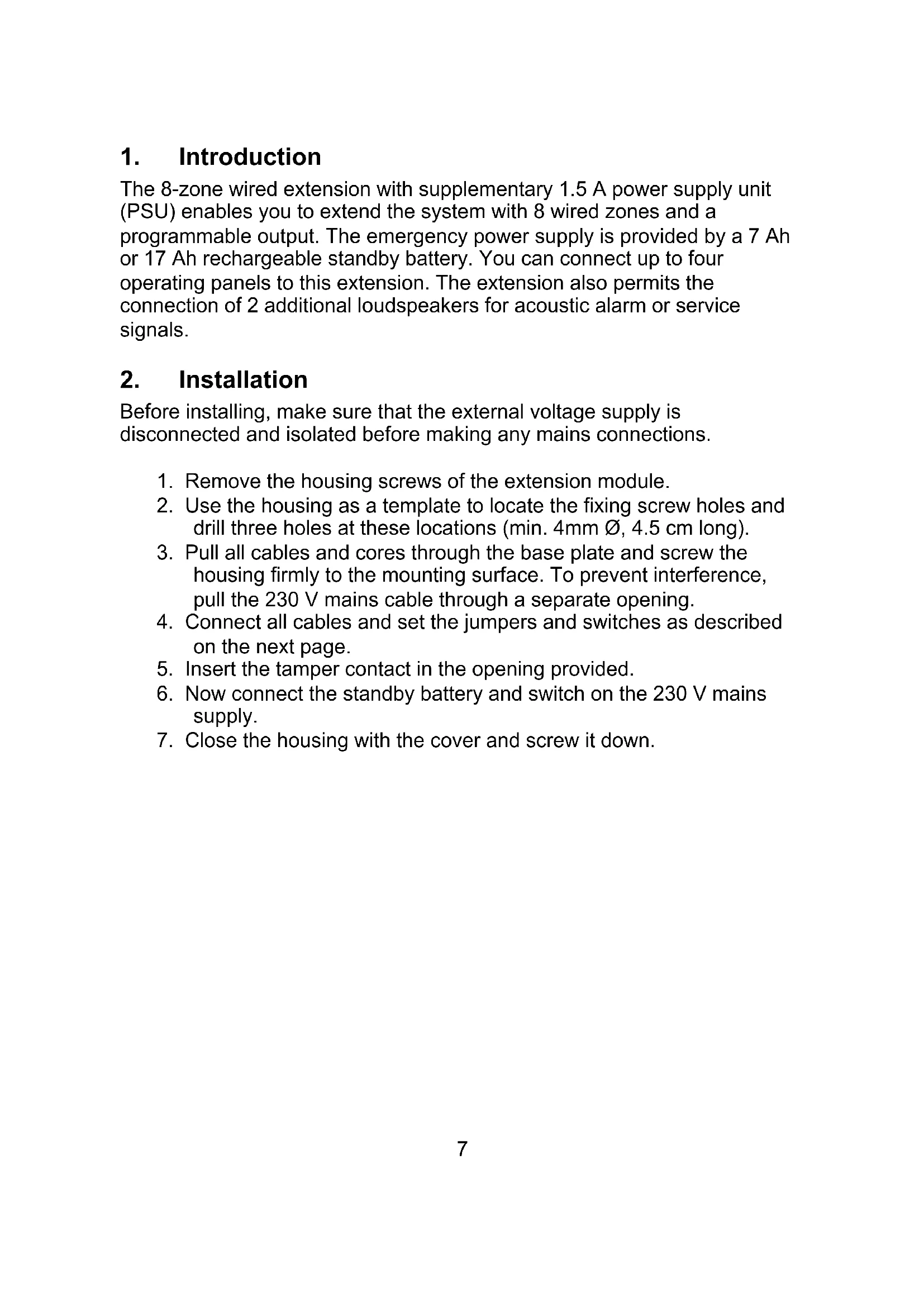 The 8-zone wired extension with supplementary 1.5 A power supply unit (PSU) enables you to extend the system with 8 wired zones and a programmable output. The emergency power supply is provided by a 7 Ah or 17 Ah rechargeable standby battery. You can connect up to four operating panels to this extension. The extension also permits the connection of 2 additional loudspeakers for acoustic alarm or service signals.
