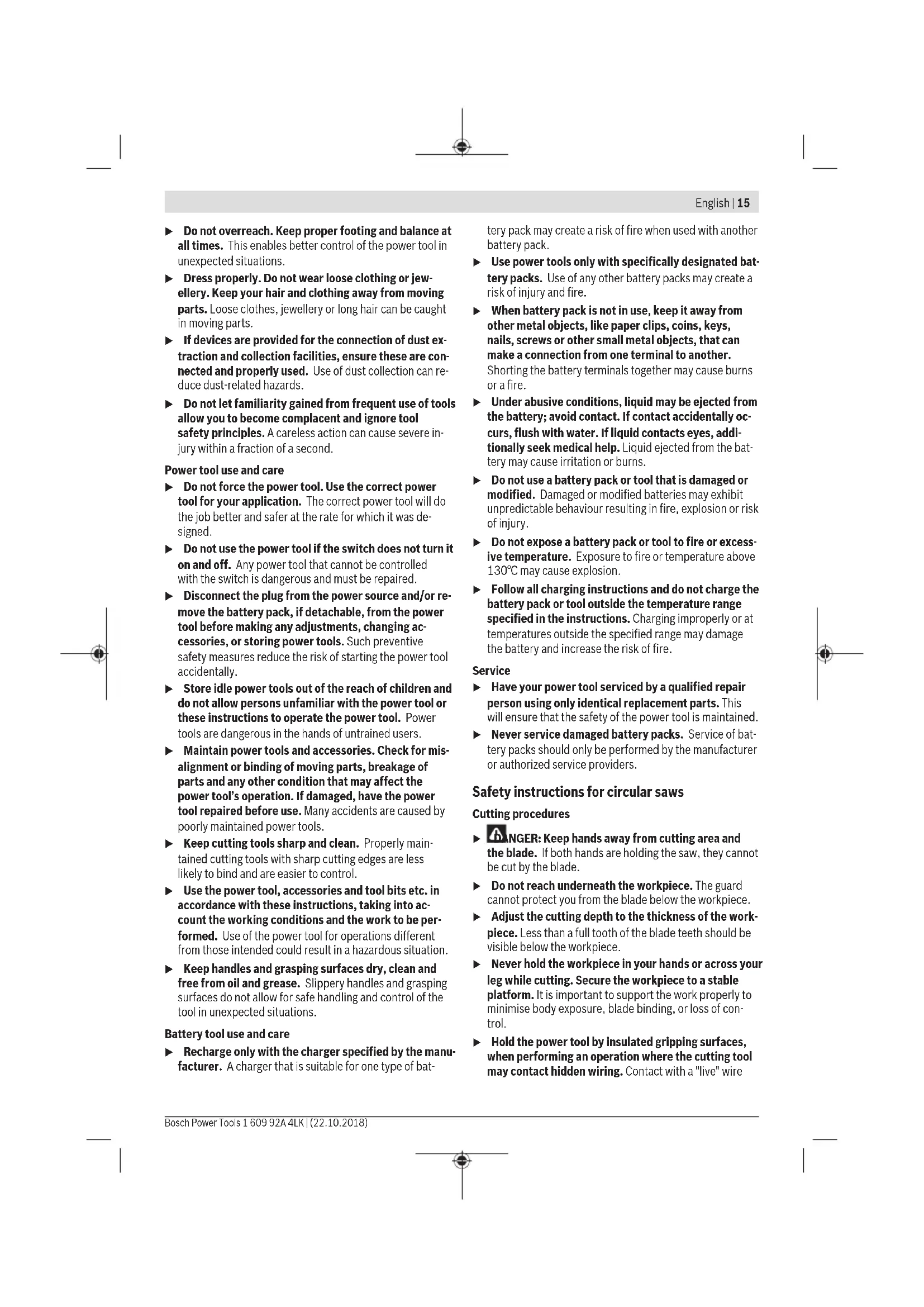 and during storage °C -20 to +50 Recommended batteries GBA 12V... GBA 10.8V... English | 17 Bosch Power Tools 1 609 92A 4LK | (22.10.2018)18 | English 1 609 92A 4LK | (22.10.2018) Bosch Power Tools Hand-held circular saw GKS 12V-26 Recommended chargers GAL 12.. AL 11.. A) Depends on battery in use B) Limited performance at temperatures <0°C Noise/Vibration Information Noise emission values determined according toEN62841-2-5. Typically, the A-weighted noise level of the power tool is: Sound pressure level 82dB(A); sound power level 93dB(A). Uncertainty K=3dB. Wear hearing protection Total vibration values a