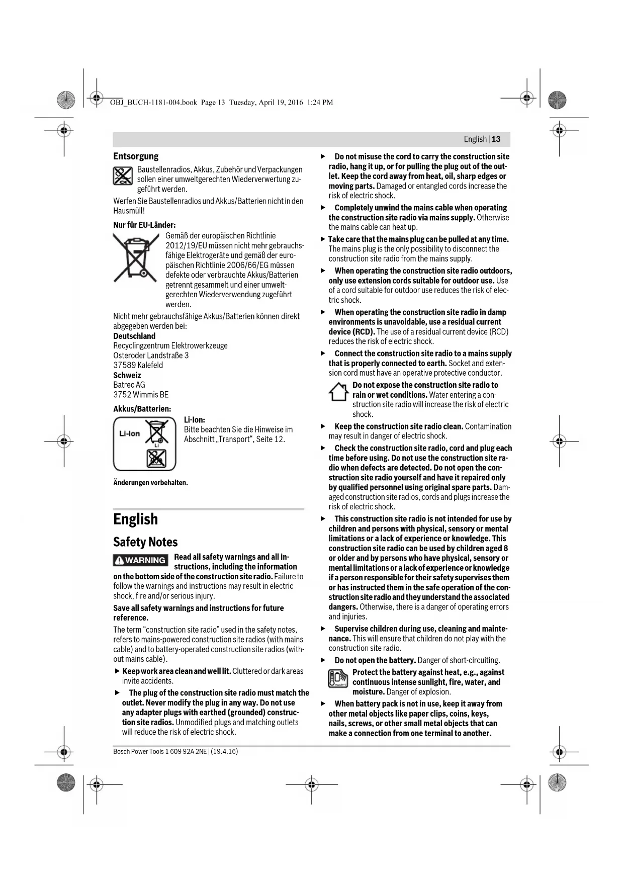– “USB”: External audio source (e.g. USB stick) via the USB port 33, – “SD”: External audio source (SD/MMC card) via the SD/MMC slot 34. Setting the Rod Antenna The construction site radio is provided with a mounted rod an- tenna 10. For radio operation, point the rod antenna toward the direction that enables the best reception. When the reception is insufficient, position the construction site radio at a different location that enables better reception. Note: When operating the construction site radio in the direct vicinity of radio-communication equipment or radio trans- ceivers, or other electronic equipment, the radio reception can be subject to interference. If the rod antenna 10 should become loose, tighten it directly at the housing by turning in clockwise direction. Setting/Storing Radio Stations Press the “Source” button 22 until “FM” is indicated for the ultra-short wave reception range or “AM” for the medium wave reception range in display element m. To set a certain radio frequency, turn the “Tune” adjust- ment knob 19 clockwise to increase the frequency, and anti- clockwise to decrease it. During setting, the frequency is indi- cated in display section n, then in j. To scan for radio stations with a high signal strength, press and briefly hold the “– Seek” button 23 to scan down and the “Seek +” button 21 to scan up the frequency scale. The frequency of the found radio station is briefly indicated in display n and then in j. When the reception of a suitable signal is sufficiently strong, the construction site radio automatically switches to stereo reception. The indicator for stereo reception i appears on the display. To store a set station, press the “Memory” button 16. The “PRESET” indicator e flashes in the display and the number of the last preset in d. To select a preset, press the “– Seek” button 23 to scan down and the “Seek +” button 21 to scan up, until the desired preset is displayed in indicator d. Press the memory button 16 again to store the set station as the se- lected preset. The indicators e and d no longer flash. A total of 20 FM and 10 AM stations can be preset. Please note that an already occupied preset is overwritten when a new radio station is assigned to it. OBJ_BUCH-1181-004.book Page 16 Tuesday, April 19, 2016 1:24 PMEnglish | 17 Bosch Power Tools 1 609 92A 2NE | (19.4.16) For playback of a preset station, briefly press the “– Seek” button 23 to scan down or the “Seek +” button 21 to scan up, until the desired preset is displayed in indicator d and “PRE- SET” is displayed in e. Connecting External Audio Sources (see figure C) Apart from the integrated radio, various external audio sourc- es can be played. AUX-In connection 1: The AUX-In connection 1 is particularly suitable for audio sources to be placed outside of the digital media bay (e.g. a CD player). Remove the protective cap of the “AUX 1 IN” socket 28 and insert the 3.5 mm plug of the provided or of another matching AUX cable into the socket. Connect the AUX cable to an appropriate audio source. After removing the AUX cable, reattach the protective cap of the “AUX 1 IN” socket 28 to protect against dirt/debris. For external audio sources via the following connections, open locking latch 8 and open lid 9 of the “Digital Media Bay”. – SD/MMC connection: Insert a SD or MMC card into the SD/MMC slot 34. The labelling of the card must face to- ward the fuse cap 31. Playback of the card can be started as soon as the track number as well as the number of avail- able tracks on the card are displayed in indicator d. To re- move the card, briefly press on the card, which is then ejected. – USB connection: Insert a USB stick (or the USB plug of an appropriate audio source) into USB port 33. Playback of the USB stick can be started as soon as the track number as well as the number of available tracks on the stick are displayed in indicator d. To remove the USB stick, pull it out of the USB port. – AUX-In connection 2: AUX-In connection 2 is particularly suitable for audio sources that can be placed inside of the digital media bay (e.g. a MP3 player). Insert the 3.5 mm plug of the provided AUX cable into the “AUX 2 IN” socket