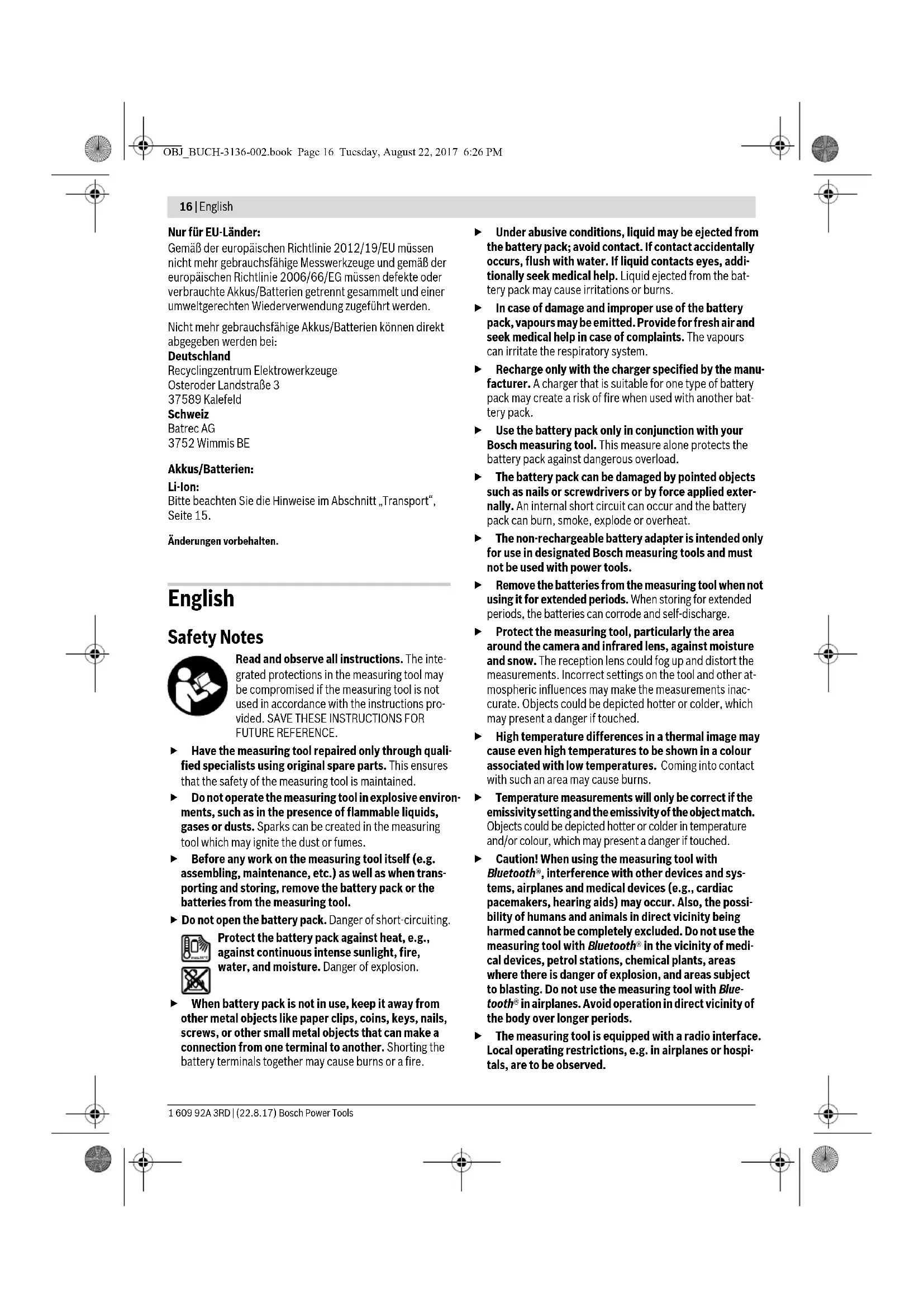 Technical data determined with battery from delivery scope. OBJ_BUCH-3136-002.book Page 18 Tuesday, August 22, 2017 6:26 PMEnglish | 19 Bosch Power Tools 1 609 92A 3RD | (22.8.17) Assembly Power Supply The measuring tool can be operated using either commercial- ly available batteries (LR6 AA batteries or similar) or using a Bosch Li-ion rechargeable battery. Operation with Battery Adapter (Removable) (see figure A) The batteries are inserted into the battery adapter. The non-rechargeable battery adapter is intended only for use in designated Bosch measuring tools and must not be used with power tools. To insert the batteries, slide the cover of the battery adapter 21 into the battery port 18. Place the batteries in the cover as per the illustration on the sealing cap 20. Slide the sealing cap over the cover until you feel it click into place and it is flush with the handle of the measuring tool. To remove the batteries, press the release buttons 19 of the sealing cap 20 and pull off the sealing cap. In doing so, make sure that the batteries do not fall out. To do this, hold the measuring tool with the battery port 18 facing upwards. Remove the batteries. To remove the inside cover 21 from the battery port 18, reach into the cover recess 22 and pull it out of the measuring tool by applying light pressure to the side wall (see figure B). Note: Do not use any tools (e.g. a screwdriver) to remove the battery, as this could break the casing. Always replace all batteries at the same time. Only use batter- ies from one brand and with the identical capacity. Remove the batteries from the measuring tool when not using it for extended periods. When storing for ex- tended periods, the batteries can corrode and self-dis- charge. Operation with Battery Pack (see figure C) Note: Use of battery packs not suitable for the measuring tool can lead to malfunctions of or cause damage to the measuring tool. Note: The battery pack is supplied partially charged. To en- sure full capacity of the battery pack, completely charge the battery pack in the battery charger before using for the first time. Use only the chargers listed in the technical data. Only these battery chargers are matched to the lithium-ion bat- tery of your measuring tool. The lithium-ion battery pack can be charged at any time with- out reducing its service life. Interrupting the charging proce- dure does not damage the battery pack. Following the automatic shut off of the measuring tool, do not continue to press the On/Off button. The battery can be damaged. To insert the charged battery pack 23, slide it into the battery port 18 until you feel it engage and it is flush with the handle of the measuring tool. To remove the battery pack 23, press the unlocking buttons 19 and pull the battery pack out of the battery port 18. Do not use force to do this. Battery Status Indicator The battery status indicator f on the display shows the charg- ing state of the batteries or battery pack 23. Operation Protect the measuring tool against moisture and direct sun light. Do not subject the measuring tool to extreme tempera- tures or variations in temperature. As an example, do not leave it in vehicles for a long time. In case of large vari- ations in temperature, allow the measuring tool to adjust to the ambient temperature before putting it into operation. In case of extreme temperatures or variations in tempera- ture, the accuracy of the measuring tool can be impaired. Make sure that the measuring tool is correctly acclima- tised. In the event of severe temperature fluctuations or environmental conditions which vary to a large degree, the measurement accuracy of the measuring tool may be im- paired until it is fully acclimatised again. Avoid hard knocks to the measuring tool or dropping it. After severe external influences and in the event of abnor- malities in the functionality, you should have the measur- ing tool checked by an authorised Bosch after-sales ser- vice agent. Initial Operation Switching On and Off To take a measurement, fold the protective cap 1 upwards. Make sure that the infrared measuring area is not closed off or covered while working. To switch on the measuring tool, press the On/Off button 9. A start sequence will appear in the display 14. After the start sequence, the measuring tool will immediately begin to meas- ure and will measure continuously until it is switched off. Note: In the first few minutes, the measuring tool may self- calibrate several times, as the sensor temperature and ambi- ent temperature have not yet been brought into line. Perform- ing calibration again enables precise measurement. The ther- mal image freezes briefly during calibration. To switch off the measuring tool, press the On/Off button again. The measuring tool saves all settings and then switches itself off. Close the protective cap 1 to transport the measur- ing tool safely. Indication Capacity >2/3 ≤2/3 ≤1/3 ≤10% Changing the Batteries or Battery Pack OBJ_BUCH-3136-002.book Page 19 Tuesday, August 22, 2017 6:26 PM20 | English 1 609 92A 3RD | (22.8.17) Bosch Power Tools In the “Settings” menu, you can choose whether and after how much time the measuring tool automatically switches off (see “Switch-off time”, page 22). If the battery or the measuring tool is not within the operating temperature range stated in the Technical Data, the measur- ing tool will shut down automatically after a brief warning (see “Troubleshooting – Causes and Corrective Measures”, page 23). Allow the measuring tool to reach to the correct temperature and then switch it back on. To save energy, only switch the measuring tool on when you are using it. Preparing for Measurement Setting the Emissivity Degree for Surface-temperature Measurements The emissivity degree of an object depends on the material and the structure of its surface. It indicates whether an object (in comparison with other objects with the same tempera- ture) emits much or little infrared h