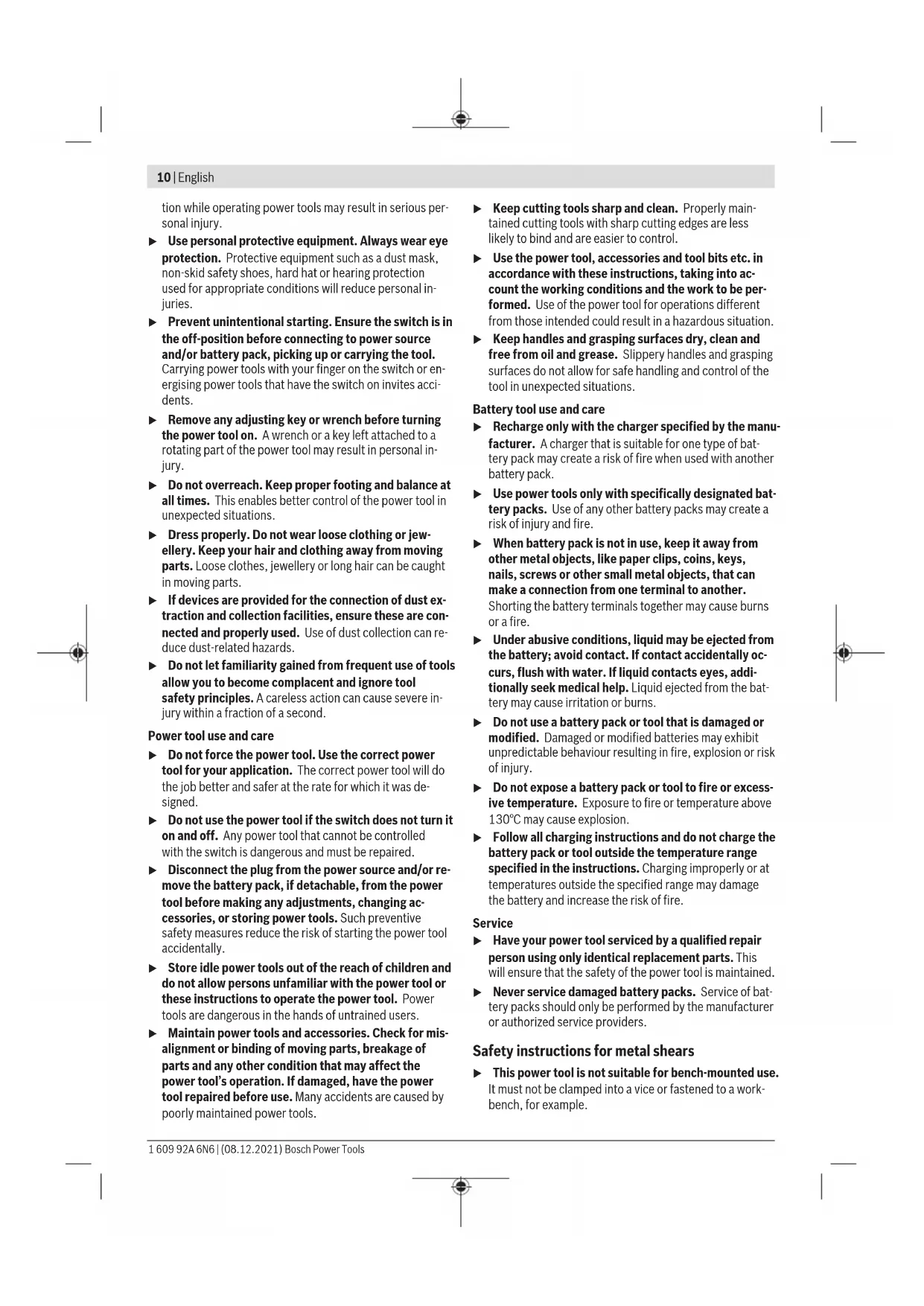The vibration level and noise emission value given in these instructions have been measured in accordance with a standardised measuring procedure and may be used to com- pare power tools. They may also be used for a preliminary estimation of vibration and noise emissions. The stated vibration level and noise emission value repres- ent the main applications of the power tool. However, if the power tool is used for other applications, with different ap- plication tools or is poorly maintained, the vibration level and noise emission value may differ. This may significantly Bosch Power Tools 1 609 92A 6N6 | (08.12.2021)12 | English increase the vibration and noise emissions over the total working period. To estimate vibration and noise emissions accurately, the times when the tool is switched off or when it is running but not actually being used should also be taken into account. This may significantly reduce vibration and noise emissions over the total working period. Implement additional safety measures to protect the oper- ator from the effects of vibration, such as servicing the power tool and application tools, keeping their hands warm, and organising workflows correctly. Assembly Battery Charging u Use only the chargers listed in the technical data. Only these chargers are matched to the lithium-ion battery of your power tool. Note: The battery is supplied partially charged. To ensure full battery capacity, fully charge the battery in the charger before using your power tool for the first time. The lithium-ion battery can be charged at any time without reducing its service life. Interrupting the charging process does not damage the battery. The lithium-ion battery is protected against deep discharge by the "Electronic Cell Protection (ECP)". When the battery is discharged, the power tool is switched off by means of a protective circuit: The application tool no longer rotates. u Do not continue to press the On/Off switch after the power tool has automatically switched off. The battery can be damaged. Removing the battery The battery(1) is equipped with two locking levels to pre- vent the battery from falling out if the battery release button(2) is pressed unintentionally. As long as the battery is inserted in the power tool, it is held in position by means of a spring. To remove the battery(1), press the battery release button(2) and pull the battery out of the power tool. Do not use force to do this. Battery charge indicator The green LEDs on the battery charge indicator indicate the state of charge of the battery. For safety reasons, it is only possible to check the state of charge when the power tool is not in operation. Press the button for the battery charge indicator or to show the state of charge. This is also possible when the bat- tery is removed. If no LED lights up after pressing the button for the battery charge indicator, then the battery is defective and must be replaced. Battery model GBA 18V... LEDs Capacity 3× continuous green light 60−100% 2× continuous green light 30−60% 1× continuous green light 5−30% 1× flashing green light 0−5% Battery model ProCORE18V... LEDs Capacity 5× continuous green light 80−100% 4× continuous green light 60−80% 3× continuous green light 40−60% 2× continuous green light 20−40% 1× continuous green light 5−20% 1× flashing green light 0−5% Operation Starting Operation Inserting the Battery Push the charged battery(1) into the base of the power tool until the battery is securely locked. Switching On and Off To switch on the power tool, slide the on/off switch(3) for- wards so that I appears on the switch. To switch off the power tool, slide the on/off switch(3) backwards so that 0 appears on the switch. Working Advice u Remove the battery from the power tool before carry- ing out work on the power tool (e.g. maintenance, changing tool, etc.). The battery should also be re- moved for transport and storage. There is risk of injury from unintentionally pressing the on/off switch. u This power tool is not suitable for bench-mounted use. It must not be clamped into a vice or fastened to a work- bench, for example. u Wear protective gloves during work. Make sure that cut sheet parts are not bent towards your body. Sharp burrs develop on cut sheets; these can cause injury. When necessary and while wearing gloves, press bending sheet parts away from your body. Apply the machine to the workpiece only when switched on. 1 609 92A 6N6 | (08.12.2021) Bosch Power ToolsEnglish | 13 80–90° Guide the power tool at an angle of 80° to 90° to the surface of the sheet metal and do not tilt it to the side. Guide the power tool evenly, pushing it gently in the cutting direction. Applying too much pressure to the power tool will significantly reduce the service life of application tools and can damage the power tool. When cutting curves, make sure not to tilt the power tool lat- erally and work with low feed rate only. Maximum steel sheet cutting capacity The maximum steel sheet cutting capacity d max depends on the strength properties of the material to be cut. The power tool allows for cutting of metal sheet to the follow- ing thicknesses: Material max. strength (N/mm