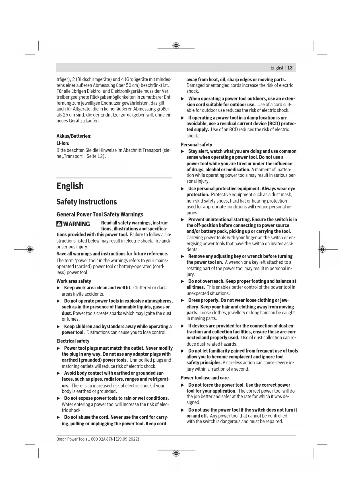 äußeren Abmessung größer als 25cm sind, im Einzel- handelsgeschäft oder in unmittelbarer Nähe hierzu un- entgeltlich zurückzunehmen; die Rücknahme darf nicht an den Kauf eines Elektro- oder Elektronikgerätes ge- knüpft werden und ist auf drei Altgeräte pro Geräteart beschränkt. Der Vertreiber hat beim Abschluss des Kaufvertrags für das neue Elektro- oder Elektronikgerät den Endnutzer über die Möglichkeit zur unentgeltlichen Rückgabe bzw. Abholung des Altgeräts zu informieren und den Endnutzer nach seiner Absicht zu befragen, ob bei der Auslieferung des neuen Ge- räts ein Altgerät zurückgegeben wird. Dies gilt auch bei Vertrieb unter Verwendung von Fernkom- munikationsmitteln, wenn die Lager- und Versandflächen für Elektro- und Elektronikgeräte mindestens 400m² betragen oder die gesamten Lager- und Versandflächen mindestens 800m² betragen, wobei die unentgeltliche Abholung auf Elektro- und Elektronikgeräte der Kategorien 1 (Wärmeüber- 1 609 92A 87N | (29.09.2022) Bosch Power ToolsEnglish | 13 träger), 2 (Bildschirmgeräte) und 4 (Großgeräte mit mindes- tens einer äußeren Abmessung über 50cm) beschränkt ist. Für alle übrigen Elektro- und Elektronikgeräte muss der Ver- treiber geeignete Rückgabemöglichkeiten in zumutbarer Ent- fernung zum jeweiligen Endnutzer gewährleisten; das gilt auch für Altgeräte, die in keiner äußeren Abmessung größer als 25cm sind, die der Endnutzer zurückgeben will, ohne ein neues Gerät zu kaufen. Akkus/Batterien: Li-Ion: Bitte beachten Sie die Hinweise im Abschnitt Transport (sie- he „Transport“, Seite12). English Safety Instructions General Power Tool Safety Warnings WARNING Read all safety warnings, instruc- tions, illustrations and specifica- tions provided with this power tool. Failure to follow all in- structions listed below may result in electric shock, fire and/ or serious injury. Save all warnings and instructions for future reference. The term "power tool" in the warnings refers to your mains- operated (corded) power tool or battery-operated (cord- less) power tool. Work area safety u Keep work area clean and well lit. Cluttered or dark areas invite accidents. u Do not operate power tools in explosive atmospheres, such as in the presence of flammable liquids, gases or dust. Power tools create sparks which may ignite the dust or fumes. u Keep children and bystanders away while operating a power tool. Distractions can cause you to lose control. Electrical safety u Power tool plugs must match the outlet. Never modify the plug in any way. Do not use any adapter plugs with earthed (grounded) power tools. Unmodified plugs and matching outlets will reduce risk of electric shock. u Avoid body contact with earthed or grounded sur- faces, such as pipes, radiators, ranges and refrigerat- ors. There is an increased risk of electric shock if your body is earthed or grounded. u Do not expose power tools to rain or wet conditions. Water entering a power tool will increase the risk of elec- tric shock. u Do not abuse the cord. Never use the cord for carry- ing, pulling or unplugging the power tool. Keep cord away from heat, oil, sharp edges or moving parts. Damaged or entangled cords increase the risk of electric shock. u When operating a power tool outdoors, use an exten- sion cord suitable for outdoor use. Use of a cord suit- able for outdoor use reduces the risk of electric shock. u If operating a power tool in a damp location is un- avoidable, use a residual current device (RCD) protec- ted supply. Use of an RCD reduces the risk of electric shock. Personal safety u Stay alert, watch what you are doing and use common sense when operating a power tool. Do not use a power tool while you are tired or under the influence of drugs, alcohol or medication. A moment of inatten- tion while operating power tools may result in serious per- sonal injury. u Use personal protective equipment. Always wear eye protection. Protective equipment such as a dust mask, non-skid safety shoes, hard hat or hearing protection used for appropriate conditions will reduce personal in- juries. u Prevent unintentional starting. Ensure the switch is in the off-position before connecting to power source and/or battery pack, picking up or carrying the tool. Carrying power tools with your finger on the switch or en- ergising power tools that have the switch on invites acci- dents. u Remove any adjusting key or wrench before turning the power tool on. A wrench or a key left attached to a rotating part of the power tool may result in personal in- jury. u Do not overreach. Keep proper footing and balance at all times. This enables better control of the power tool in unexpected situations. u Dress properly. Do not wear loose clothing or jew- ellery. Keep your hair and clothing away from moving parts. Loose clothes, jewellery or long hair can be caught in moving parts. u If devices are provided for the connection of dust ex- traction and collection facilities, ensure these are con- nected and properly used. Use of dust collection can re- duce dust-related hazards. u Do not let familiarity gained from frequent use of tools allow you to become complacent and ignore tool safety principles. A careless action can cause severe in- jury within a fraction of a second. Power tool use and care u Do not force the power tool. Use the correct power tool for your application. The correct power tool will do the job better and safer at the rate for which it was de- signed. u Do not use the power tool if the switch does not turn it on and off. Any power tool that cannot be controlled with the switch is dangerous and must be repaired. Bosch Power Tools 1 609 92A 87N | (29.09.2022)14 | English u Disconnect the plug from the power source and/or re- move the battery pack, if detachable, from the power tool before making any adjustments, changing ac- cessories, or storing power tools. Such preventive safety measures reduce the risk of starting the power tool accidentally. u