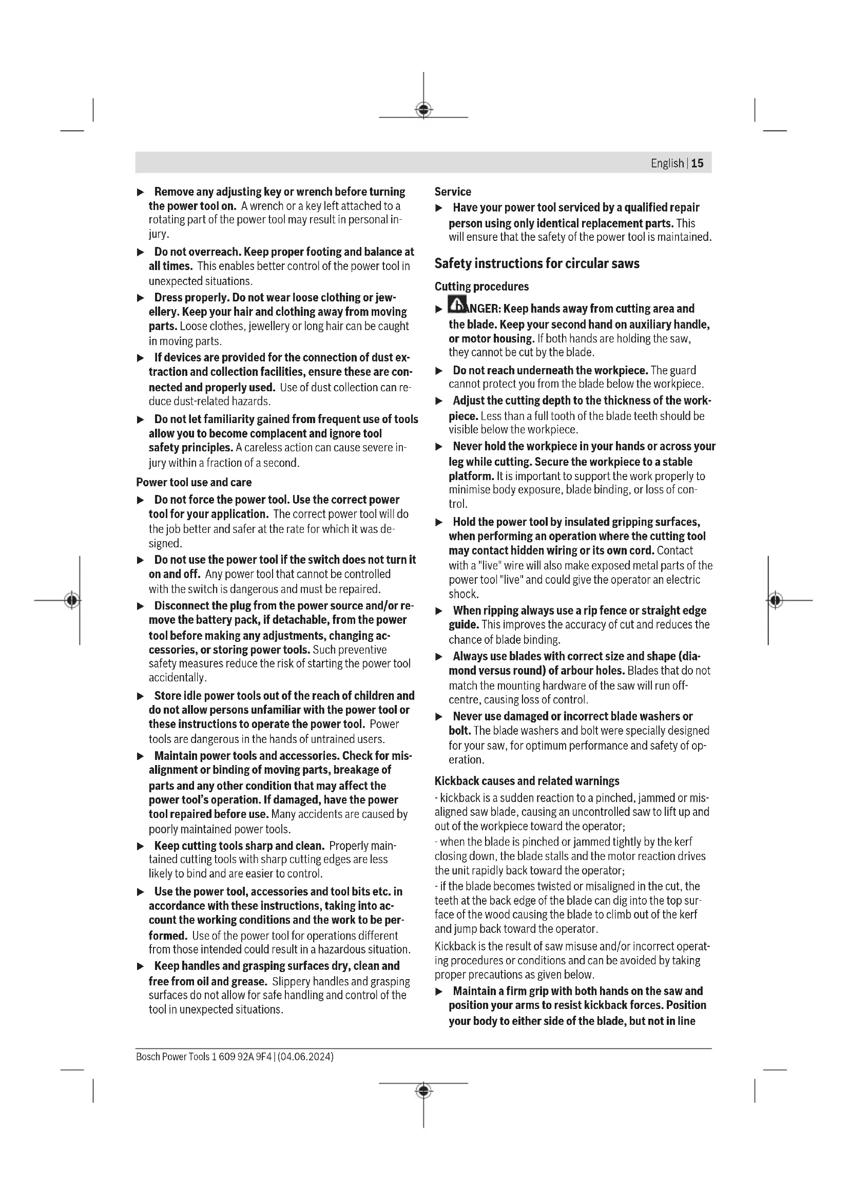 äußeren Abmessung größer als 25cm sind, im Einzel- handelsgeschäft oder in unmittelbarer Nähe hierzu un- entgeltlich zurückzunehmen; die Rücknahme darf nicht an den Kauf eines Elektro- oder Elektronikgerätes ge- knüpft werden und ist auf drei Altgeräte pro Geräteart beschränkt. Der Vertreiber hat beim Abschluss des Kaufvertrags für das neue Elektro- oder Elektronikgerät den Endnutzer über die Möglichkeit zur unentgeltlichen Rückgabe bzw. Abholung des Altgeräts zu informieren und den Endnutzer nach seiner Absicht zu befragen, ob bei der Auslieferung des neuen Ge- räts ein Altgerät zurückgegeben wird. Dies gilt auch bei Vertrieb unter Verwendung von Fernkom- munikationsmitteln, wenn die Lager- und Versandflächen für Elektro- und Elektronikgeräte mindestens 400m² betragen oder die gesamten Lager- und Versandflächen mindestens 800m² betragen, wobei die unentgeltliche Abholung auf Elektro- und Elektronikgeräte der Kategorien 1 (Wärmeüber- träger), 2 (Bildschirmgeräte) und 4 (Großgeräte mit mindes- tens einer äußeren Abmessung über 50cm) beschränkt ist. Für alle übrigen Elektro- und Elektronikgeräte muss der Ver- treiber geeignete Rückgabemöglichkeiten in zumutbarer Ent- fernung zum jeweiligen Endnutzer gewährleisten; das gilt auch für Altgeräte, die in keiner äußeren Abmessung größer als 25cm sind, die der Endnutzer zurückgeben will, ohne ein neues Gerät zu kaufen. English Safety Instructions General Power Tool Safety Warnings WARNING Read all safety warnings, instruc- tions, illustrations and specifica- tions provided with this power tool. Failure to follow all in- structions listed below may result in electric shock, fire and/ or serious injury. Save all warnings and instructions for future reference. The term "power tool" in the warnings refers to your mains- operated (corded) power tool or battery-operated (cord- less) power tool. Work area safety u Keep work area clean and well lit. Cluttered or dark areas invite accidents. u Do not operate power tools in explosive atmospheres, such as in the presence of flammable liquids, gases or dust. Power tools create sparks which may ignite the dust or fumes. u Keep children and bystanders away while operating a power tool. Distractions can cause you to lose control. Electrical safety u Power tool plugs must match the outlet. Never modify the plug in any way. Do not use any adapter plugs with earthed (grounded) power tools. Unmodified plugs and matching outlets will reduce risk of electric shock. u Avoid body contact with earthed or grounded sur- faces, such as pipes, radiators, ranges and refrigerat- ors. There is an increased risk of electric shock if your body is earthed or grounded. u Do not expose power tools to rain or wet conditions. Water entering a power tool will increase the risk of elec- tric shock. u Do not abuse the cord. Never use the cord for carry- ing, pulling or unplugging the power tool. Keep cord away from heat, oil, sharp edges or moving parts. Damaged or entangled cords increase the risk of electric shock. u When operating a power tool outdoors, use an exten- sion cord suitable for outdoor use. Use of a cord suit- able for outdoor use reduces the risk of electric shock. u If operating a power tool in a damp location is un- avoidable, use a residual current device (RCD) protec- ted supply. Use of an RCD reduces the risk of electric shock. Personal safety u Stay alert, watch what you are doing and use common sense when operating a power tool. Do not use a power tool while you are tired or under the influence of drugs, alcohol or medication. A moment of inatten- tion while operating power tools may result in serious per- sonal injury. u Use personal protective equipment. Always wear eye protection. Protective equipment such as a dust mask, non-skid safety shoes, hard hat or hearing protection used for appropriate conditions will reduce personal in- juries. u Prevent unintentional starting. Ensure the switch is in the off-position before connecting to power source and/or battery pack, picking up or carrying the tool. Carrying power tools with your finger on the switch or en- ergising power tools that have the switch on invites acci- dents. 1 609 92A 9F4 | (04.06.2024) Bosch Power ToolsEnglish | 15 u Remove any adjusting key or wrench before turning the power tool on. A wrench or a key left attached to a rotating part of the power tool may result in personal in- jury. u Do not overreach. Keep proper footing and balance at all times. This enables better control of the power tool in unexpected situations. u Dress properly. Do not wear loose clothing or jew- ellery. Keep your hair and clothing away from moving parts. Loose clothes, jewellery or long hair can be caught in moving parts. u If devices are provided for the connection of dust ex- traction and collection facilities, ensure these are con- nected and properly used. Use of dust collection can re- duce dust-related hazards. u Do not let familiarity gained from frequent use of tools allow you to become complacent and ignore tool safety principles. A careless action can cause severe in- jury within a fraction of a second. Power tool use and care u Do not force the power tool. Use the correct power tool for your application. The correct power tool will do the job better and safer at the rate for which it was de- signed. u Do not use the power tool if the switch does not turn it on and off. Any power tool that cannot be controlled with the switch is dangerous and must be repaired. u Disconnect the plug from the power source and/or re- move the battery pack, if detachable, from the power tool before making any adjustments, changing ac- cessories, or storing power tools. Such preventive safety measures reduce the risk of starting the power tool accidentally. u Store idle power tools out of the reach of children and do not allow persons unfamiliar with the power tool or these instructions to operate the power tool. Power tools are d