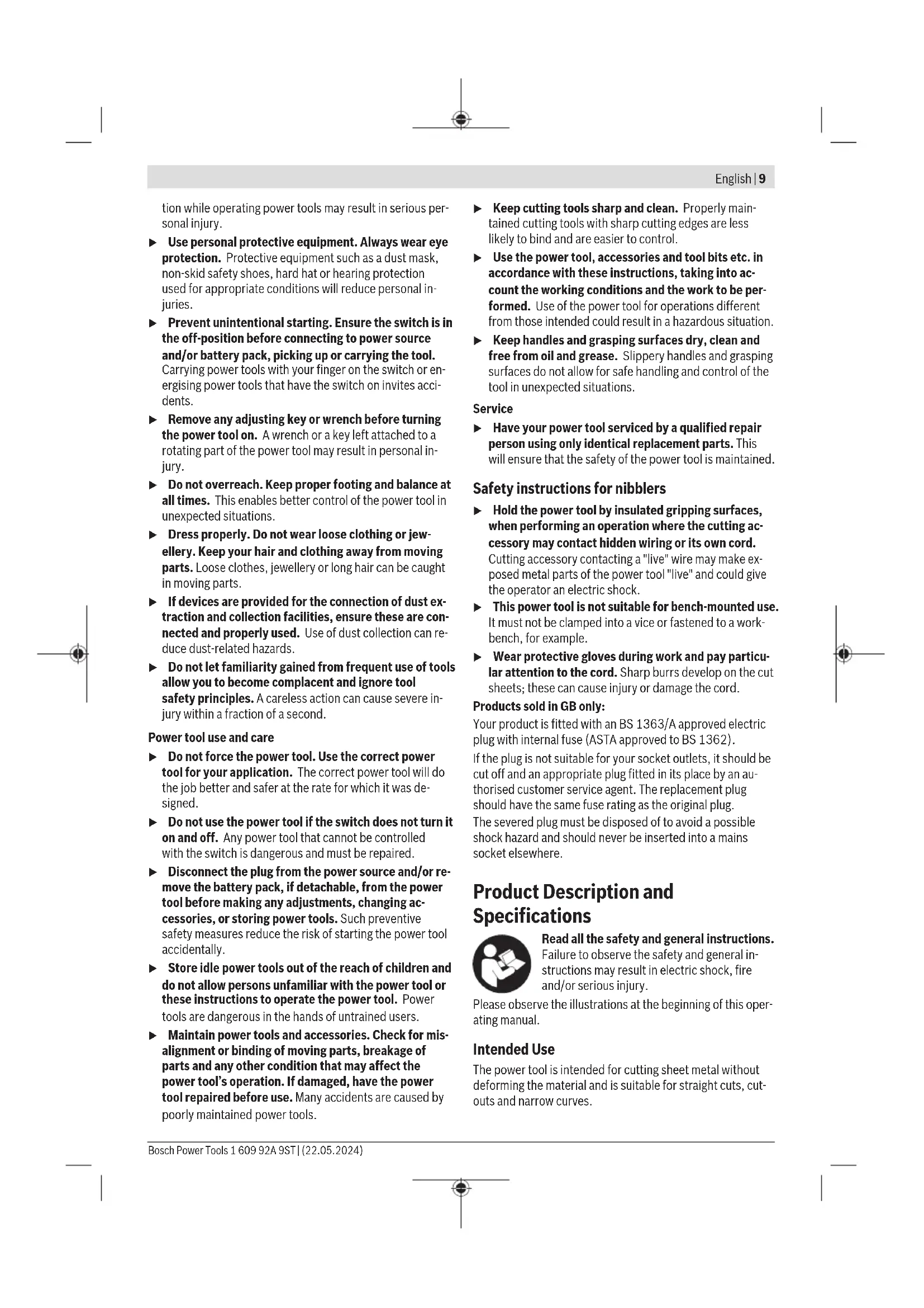 äußeren Abmessung größer als 25cm sind, im Einzel- handelsgeschäft oder in unmittelbarer Nähe hierzu un- entgeltlich zurückzunehmen; die Rücknahme darf nicht an den Kauf eines Elektro- oder Elektronikgerätes ge- knüpft werden und ist auf drei Altgeräte pro Geräteart beschränkt. Der Vertreiber hat beim Abschluss des Kaufvertrags für das neue Elektro- oder Elektronikgerät den Endnutzer über die Möglichkeit zur unentgeltlichen Rückgabe bzw. Abholung des Altgeräts zu informieren und den Endnutzer nach seiner Absicht zu befragen, ob bei der Auslieferung des neuen Ge- räts ein Altgerät zurückgegeben wird. Dies gilt auch bei Vertrieb unter Verwendung von Fernkom- munikationsmitteln, wenn die Lager- und Versandflächen für Elektro- und Elektronikgeräte mindestens 400m² betragen oder die gesamten Lager- und Versandflächen mindestens 800m² betragen, wobei die unentgeltliche Abholung auf Elektro- und Elektronikgeräte der Kategorien 1 (Wärmeüber- träger), 2 (Bildschirmgeräte) und 4 (Großgeräte mit mindes- tens einer äußeren Abmessung über 50cm) beschränkt ist. Für alle übrigen Elektro- und Elektronikgeräte muss der Ver- treiber geeignete Rückgabemöglichkeiten in zumutbarer Ent- fernung zum jeweiligen Endnutzer gewährleisten; das gilt auch für Altgeräte, die in keiner äußeren Abmessung größer als 25cm sind, die der Endnutzer zurückgeben will, ohne ein neues Gerät zu kaufen. English Safety Instructions General Power Tool Safety Warnings WARNING Read all safety warnings, instruc- tions, illustrations and specifica- tions provided with this power tool. Failure to follow all in- structions listed below may result in electric shock, fire and/ or serious injury. Save all warnings and instructions for future reference. The term "power tool" in the warnings refers to your mains- operated (corded) power tool or battery-operated (cord- less) power tool. Work area safety u Keep work area clean and well lit. Cluttered or dark areas invite accidents. u Do not operate power tools in explosive atmospheres, such as in the presence of flammable liquids, gases or dust. Power tools create sparks which may ignite the dust or fumes. u Keep children and bystanders away while operating a power tool. Distractions can cause you to lose control. Electrical safety u Power tool plugs must match the outlet. Never modify the plug in any way. Do not use any adapter plugs with earthed (grounded) power tools. Unmodified plugs and matching outlets will reduce risk of electric shock. u Avoid body contact with earthed or grounded sur- faces, such as pipes, radiators, ranges and refrigerat- ors. There is an increased risk of electric shock if your body is earthed or grounded. u Do not expose power tools to rain or wet conditions. Water entering a power tool will increase the risk of elec- tric shock. u Do not abuse the cord. Never use the cord for carry- ing, pulling or unplugging the power tool. Keep cord away from heat, oil, sharp edges or moving parts. Damaged or entangled cords increase the risk of electric shock. u When operating a power tool outdoors, use an exten- sion cord suitable for outdoor use. Use of a cord suit- able for outdoor use reduces the risk of electric shock. u If operating a power tool in a damp location is un- avoidable, use a residual current device (RCD) protec- ted supply. Use of an RCD reduces the risk of electric shock. Personal safety u Stay alert, watch what you are doing and use common sense when operating a power tool. Do not use a power tool while you are tired or under the influence of drugs, alcohol or medication. A moment of inatten- 1 609 92A 9ST | (22.05.2024) Bosch Power ToolsEnglish | 9 tion while operating power tools may result in serious per- sonal injury. u Use personal protective equipment. Always wear eye protection. Protective equipment such as a dust mask, non-skid safety shoes, hard hat or hearing protection used for appropriate conditions will reduce personal in- juries. u Prevent unintentional starting. Ensure the switch is in the off-position before connecting to power source and/or battery pack, picking up or carrying the tool. Carrying power tools with your finger on the switch or en- ergising power tools that have the switch on invites acci- dents. u Remove any adjusting key or wrench before turning the power tool on. A wrench or a key left attached to a rotating part of the power tool may result in personal in- jury. u Do not overreach. Keep proper footing and balance at all times. This enables better control of the power tool in unexpected situations. u Dress properly. Do not wear loose clothing or jew- ellery. Keep your hair and clothing away from moving parts. Loose clothes, jewellery or long hair can be caught in moving parts. u If devices are provided for the connection of dust ex- traction and collection facilities, ensure these are con- nected and properly used. Use of dust collection can re- duce dust-related hazards. u Do not let familiarity gained from frequent use of tools allow you to become complacent and ignore tool safety principles. A careless action can cause severe in- jury within a fraction of a second. Power tool use and care u Do not force the power tool. Use the correct power tool for your application. The correct power tool will do the job better and safer at the rate for which it was de- signed. u Do not use the power tool if the switch does not turn it on and off. Any power tool that cannot be controlled with the switch is dangerous and must be repaired. u Disconnect the plug from the power source and/or re- move the battery pack, if detachable, from the power tool before making any adjustments, changing ac- cessories, or storing power tools. Such preventive safety measures reduce the risk of starting the power tool accidentally. u Store idle power tools out of the reach of children and do not allow persons unfamiliar with the power tool or these instructions to operate the power tool. Power tools are da