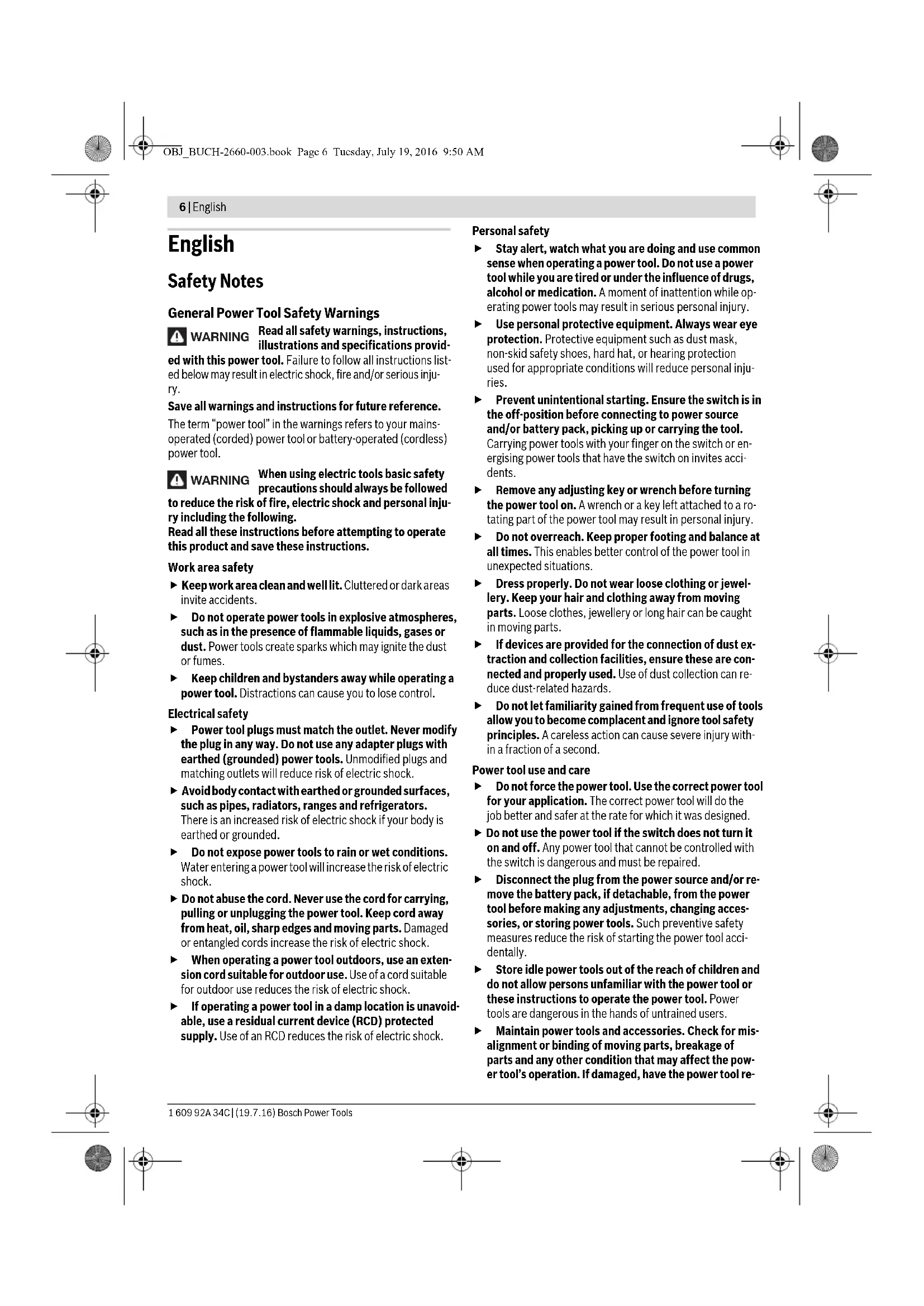 OBJ_BUCH-2660-003.book Page 5 Tuesday, July 19, 2016 9:50 AM6 | English 1 609 92A 34C | (19.7.16) Bosch Power Tools English Safety Notes General Power Tool Safety Warnings Read all safety warnings, instructions, illustrations and specifications provid- ed with this power tool. Failure to follow all instructions list- ed below may result in electric shock, fire and/or serious inju- ry. Save all warnings and instructions for future reference. The term “power tool” in the warnings refers to your mains- operated (corded) power tool or battery-operated (cordless) power tool. When using electric tools basic safety precautions should always be followed to reduce the risk of fire, electric shock and personal inju- ry including the following. Read all these instructions before attempting to operate this product and save these instructions. Work area safety Keep work area clean and well lit. Cluttered or dark areas invite accidents. Do not operate power tools in explosive atmospheres, such as in the presence of flammable liquids, gases or dust. Power tools create sparks which may ignite the dust or fumes. Keep children and bystanders away while operating a power tool. Distractions can cause you to lose control. Electrical safety Power tool plugs must match the outlet. Never modify the plug in any way. Do not use any adapter plugs with earthed (grounded) power tools. Unmodified plugs and matching outlets will reduce risk of electric shock. Avoid body contact with earthed or grounded surfaces, such as pipes, radiators, ranges and refrigerators. There is an increased risk of electric shock if your body is earthed or grounded. Do not expose power tools to rain or wet conditions. Water entering a power tool will increase the risk of electric shock. Do not abuse the cord. Never use the cord for carrying, pulling or unplugging the power tool. Keep cord away from heat, oil, sharp edges and moving parts. Damaged or entangled cords increase the risk of electric shock. When operating a power tool outdoors, use an exten- sion cord suitable for outdoor use. Use of a cord suitable for outdoor use reduces the risk of electric shock. If operating a power tool in a damp location is unavoid- able, use a residual current device (RCD) protected supply. Use of an RCD reduces the risk of electric shock. Personal safety Stay alert, watch what you are doing and use common sense when operating a power tool. Do not use a power tool while you are tired or under the influence of drugs, alcohol or medication. A moment of inattention while op- erating power tools may result in serious personal injury. Use personal protective equipment. Always wear eye protection. Protective equipment such as dust mask, non-skid safety shoes, hard hat, or hearing protection used for appropriate conditions will reduce personal inju- ries. Prevent unintentional starting. Ensure the switch is in the off-position before connecting to power source and/or battery pack, picking up or carrying the tool. Carrying power tools with your finger on the switch or en- ergising power tools that have the switch on invites acci- dents. Remove any adjusting key or wrench before turning the power tool on. A wrench or a key left attached to a ro- tating part of the power tool may result in personal injury. Do not overreach. Keep proper footing and balance at all times. This enables better control of the power tool in unexpected situations. Dress properly. Do not wear loose clothing or jewel- lery. Keep your hair and clothing away from moving parts. Loose clothes, jewellery or long hair can be caught in moving parts. If devices are provided for the connection of dust ex- traction and collection facilities, ensure these are con- nected and properly used. Use of dust collection can re- duce dust-related hazards. Do not let familiarity gained from frequent use of tools allow you to become complacent and ignore tool safety principles. A careless action can cause severe injury with- in a fraction of a second. Power tool use and care Do not force the power tool. Use the correct power tool for your application. The correct power tool will do the job better and safer at the rate for which it was designed. Do not use the power tool if the switch does not turn it on and off. Any power tool that cannot be controlled with the switch is dangerous and must be repaired. Disconnect the plug from the power source and/or re- move the battery pack, if detachable, from the power tool before making any adjustments, changing acces- sories, or storing power tools. Such preventive safety measures reduce the risk of starting the power tool acci- dentally. Store idle power tools out of the reach of children and do not allow persons unfamiliar with the power tool or these instructions to operate the power tool. Power tools are dangerous in the hands of untrained users. Maintain power tools and accessories. Check for mis- alignment or binding of moving parts, breakage of parts and any other condition that may affect the pow- er tool’s operation. If damaged, have the power tool re- WARNING WARNING OBJ_BUCH-2660-003.book Page 6 Tuesday, July 19, 2016 9:50 AMEnglish | 7 Bosch Power Tools 1 609 92A 34C | (19.7.16) paired before use. Many accidents are caused by poorly maintained power tools. Keep cutting tools sharp and clean. Properly maintained cutting tools with sharp cutting edges are less likely to bind and are easier to control. Use the power tool, accessories and tool bits etc. in ac- cordance with these instructions, taking into account the working conditions and the work to be performed. Use of the power tool for operations different from those intended could result in a hazardous situation. Keep handles and grasping surfaces dry, clean and free from oil and grease. Slippery handles and grasping sur- faces do not allow for safe handling and control of the tool in unexpected situations. Service Have your power tool serviced by a qualified repair per- son using only identical replacem
