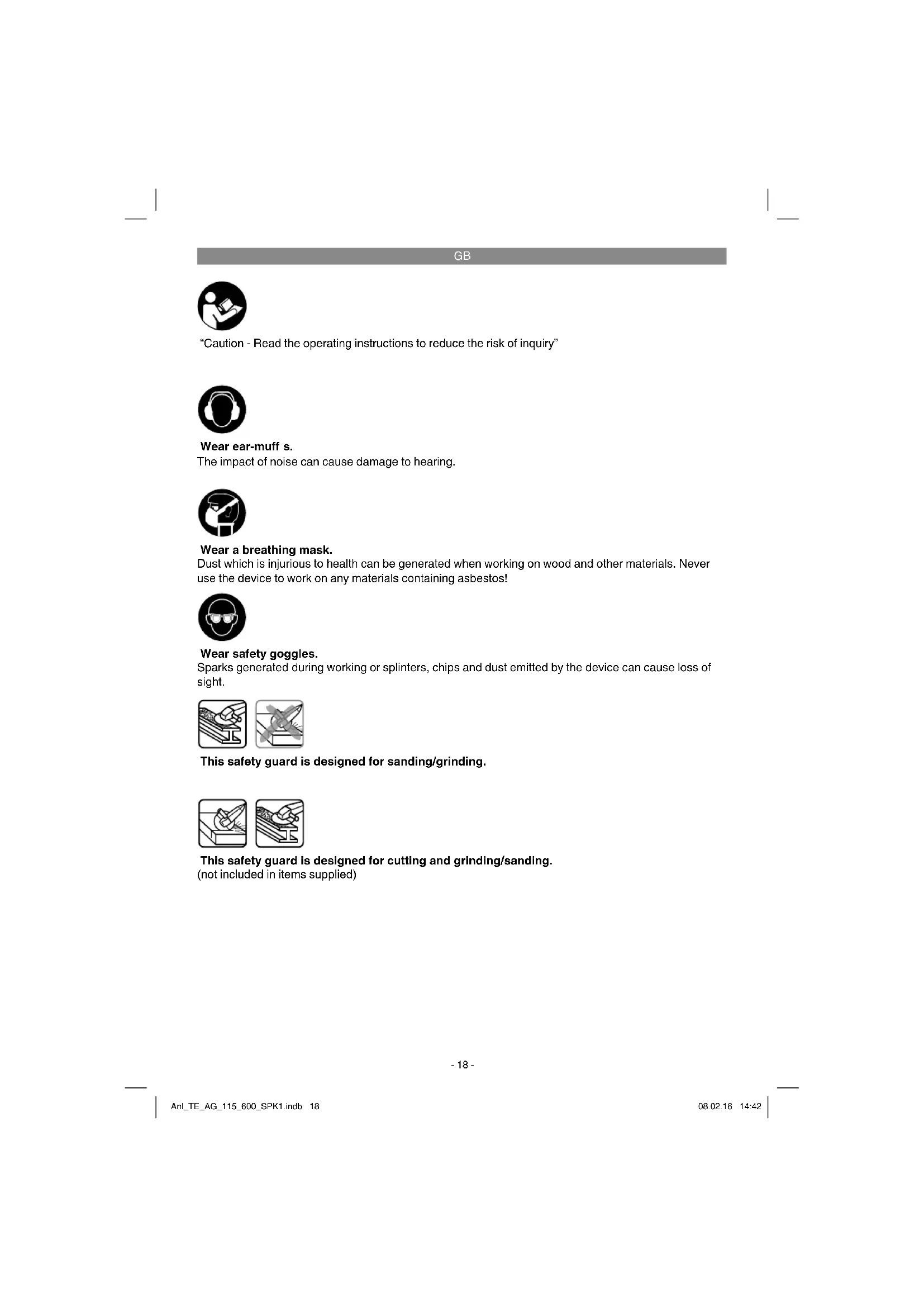 “Caution - Read the operating instructions to reduce the risk of inquiry” Wear ear-muff s. The impact of noise can cause damage to hearing. Wear safety goggles. Sparks generated during working or splinters, chips and dust emitted by the device can cause loss of sight. Wear a breathing mask. Dust which is injurious to health can be generated when working on wood and other materials. Never use the device to work on any materials containing asbestos! This safety guard is designed for cutting and grinding/sanding. (not included in items supplied) This safety guard is designed for sanding/grinding. Anl_TE_AG_115_600_SPK1.indb 18Anl_TE_AG_115_600_SPK1.indb 18 08.02.16 14:4208.02.16 14:42GB