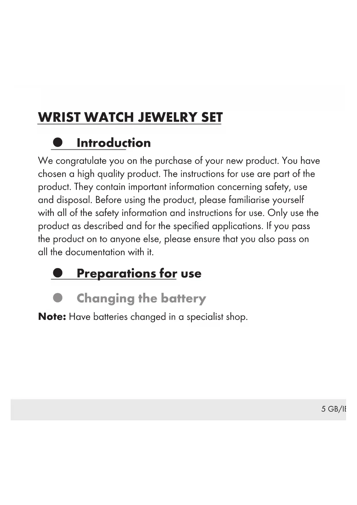 Introduction We congratulate you on the purchase of your new product. You have chosen a high quality product. The instructions for use are part of the product. They contain important information concerning safety, use and disposal. Before using the product, please familiarise yourself with all of the safety information and instructions for use. Only use the product as described and for the specified applications. If you pass the product on to anyone else, please ensure that you also pass on all the documentation with it. Preparations for use Changing the battery Note: Have batteries changed in a specialist shop.6 GB/IE/NI Display