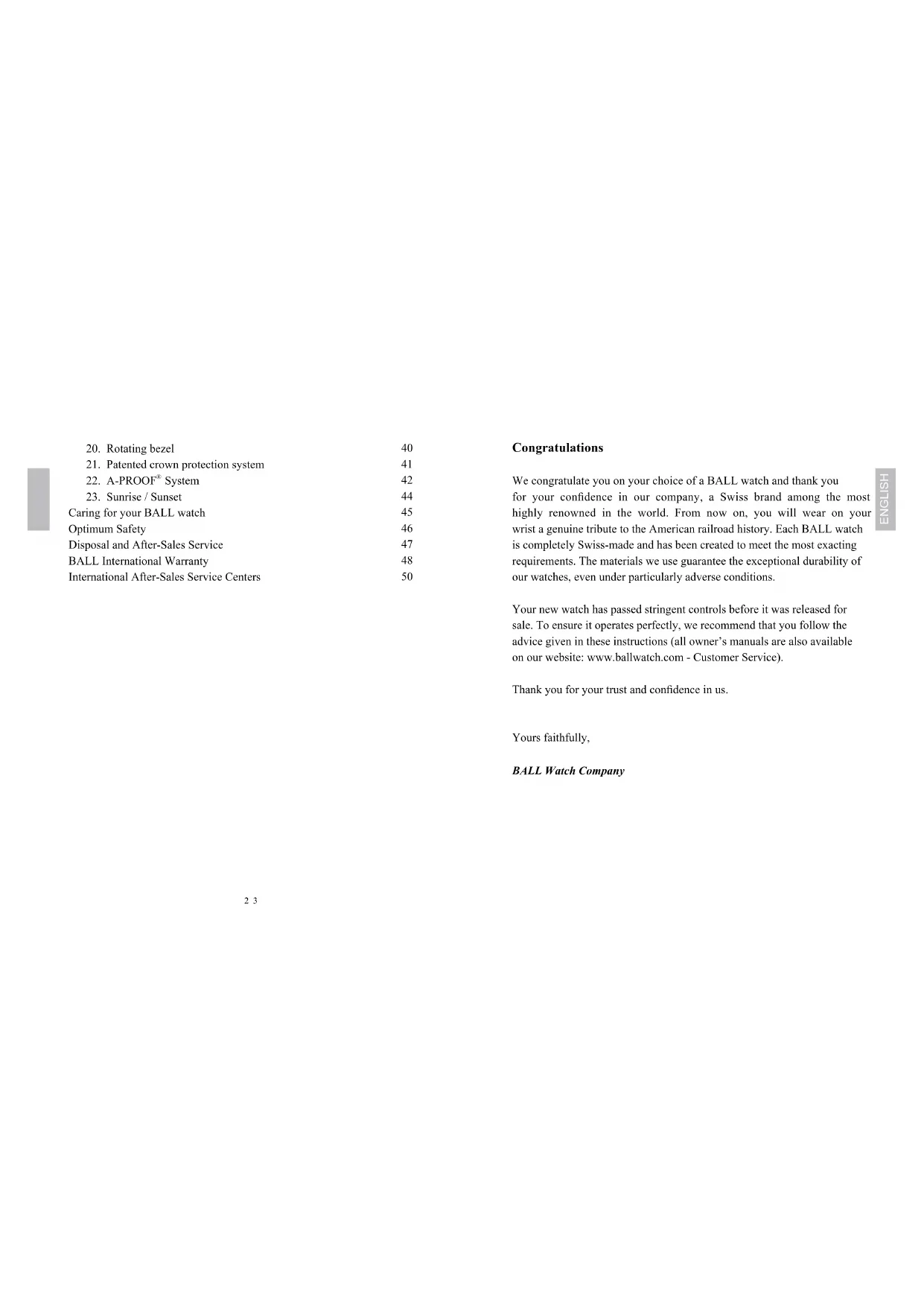 ENGLISH2 3 Congratulations We congratulate you on your choice of a BALL watch and thank you for your condence in our company, a Swiss brand among the most highly renowned in the world. From now on, you will wear on your wrist a genuine tribute to the American railroad history. Each BALL watch is completely Swiss-made and has been created to meet the most exacting requirements. The materials we use guarantee the exceptional durability of our watches, even under particularly adverse conditions. Your new watch has passed stringent controls before it was released for sale. To ensure it operates perfectly, we recommend that you follow the advice given in these instructions (all owner’s manuals are also available on our website: www.ballwatch.com - Customer Service). Thank you for your trust and condence in us. Yours faithfully, BALL Watch Company