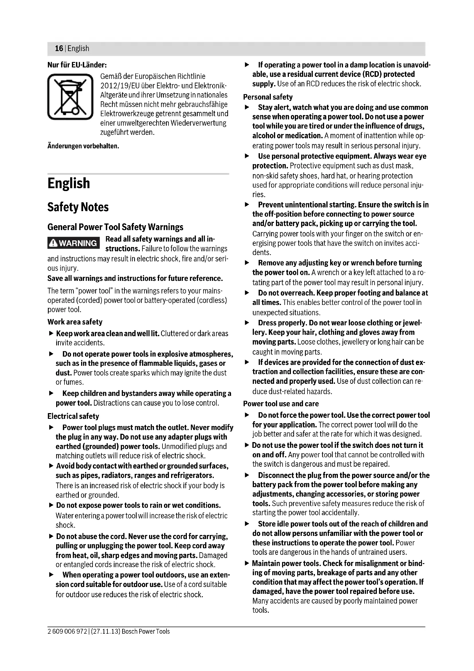 OBJ_BUCH-1961-003.book Page 14 Wednesday, November 27, 2013 3:12 PMDeutsch | 15 Bosch Power Tools 2 609 006 972 | (27.11.13) Tragen Sie eine Staubschutzmaske. Das Elektrowerkzeug darf nur für Trockenschnitt/Tro- ckenschliff verwendet werden. Verwenden Sie zum Trennen von Stein am besten eine Dia- mant-Trennscheibe. Bei Verwendung der Absaughaube zum Trennen mit Füh- rungsschlitten 19 muss der Staubsauger zum Absaugen von Steinstaub zugelassen sein. Bosch bietet geeignete Staub- sauger an. Schalten Sie das Elek- trowerkzeug ein und setzen Sie es mit dem vorderen Teil des Füh- rungsschlittens auf das Werkstück. Schieben Sie das Elektrowerkzeug mit mäßigem, dem zu bearbeitenden Material angepasstem Vorschub. Beim Trennen besonders harter Werkstoffe, z. B. Beton mit hohem Kieselgehalt, kann die Diamant-Trennscheibe überhit- zen und dadurch beschädigt werden. Ein mit der Diamant- Trennscheibe umlaufender Funkenkranz weist deutlich dar- auf hin. Unterbrechen Sie in diesem Fall den Trennvorgang und lassen Sie die Diamant-Trennscheibe im Leerlauf bei höchster Dreh- zahl kurze Zeit laufen, um sie abzukühlen. Merklich nachlassender Arbeitsfortschritt und ein umlaufen- der Funkenkranz sind Anzeichen für eine stumpf gewordene Diamant-Trennscheibe. Sie können diese durch kurze Schnit- te in abrasivem Material, z. B. Kalksandstein, wieder schär- fen. Hinweise zur Statik Schlitze in tragenden Wänden unterliegen der Norm DIN 1053 Teil 1 oder länderspezifischen Festlegungen. Diese Vorschriften sind unbedingt einzuhalten. Ziehen Sie vor Arbeitsbeginn den verantwortlichen Statiker, Architekten oder die zuständige Bauleitung zurate. Wartung und Service Wartung und Reinigung Ziehen Sie vor allen Arbeiten am Elektrowerkzeug den Netzstecker aus der Steckdose. Halten Sie das Elektrowerkzeug und die Lüftungs- schlitze sauber, um gut und sicher zu arbeiten. Verwenden Sie bei extremen Einsatzbedingungen nach Möglichkeit immer eine Absauganlage. Blasen Sie die Lüftungsschlitze häufig aus und schalten Sie einen Fehlerstrom-(FI-)Schutzschalter vor. Bei der Bearbei- tung von Metallen kann sich leitfähiger Staub im Innern des Elektrowerkzeugs absetzen. Die Schutzisolierung des Elektrowerkzeugs kann beeinträchtigt werden. Lagern und behandeln Sie das Zubehör sorgfältig. Wenn ein Ersatz der Anschlussleitung erforderlich ist, dann ist dies von Bosch oder einer autorisierten Kundendienststel- le für Bosch-Elektrowerkzeuge auszuführen, um Sicherheits- gefährdungen zu vermeiden. Kundendienst und Anwendungsberatung Der Kundendienst beantwortet Ihre Fragen zu Reparatur und Wartung Ihres Produkts sowie zu Ersatzteilen. Explosions- zeichnungen und Informationen zu Ersatzteilen finden Sie auch unter: www.bosch-pt.com Das Bosch-Anwendungsberatungs-Team hilft Ihnen gerne bei Fragen zu unseren Produkten und deren Zubehör. www.bosch-do-it.de, das Internetportal für Heimwerker und Gartenfreunde. www.1-2-do.com In der Heimwerker-Community 1-2-do.com können Sie Produkttester werden, Ideen sammeln oder sich mit anderen Heimwerkern austauschen. www.dha.de, das komplette Service-Angebot der Deutschen Heimwerker Akademie. Geben Sie bei allen Rückfragen und Ersatzteilbestellungen bitte unbedingt die 10-stellige Sachnummer laut Typenschild des Elektrowerkzeuges an. Deutschland Robert Bosch GmbH Servicezentrum Elektrowerkzeuge Zur Luhne 2 37589 Kalefeld – Willershausen Unter www.bosch-pt.com können Sie online Ersatzteile be- stellen oder Reparaturen anmelden. Kundendienst: Tel.: (0711) 40040480 Fax: (0711) 40040481 E-Mail: Servicezentrum.Elektrowerkzeuge@de.bosch.com Anwendungsberatung: Tel.: (0711) 40040480 Fax: (0711) 40040482 E-Mail: Anwendungsberatung.pt@de.bosch.com Österreich Tel.: (01) 797222010 Fax: (01) 797222011 E-Mail: service.elektrowerkzeuge@at.bosch.com Schweiz Tel.: (044) 8471511 Fax: (044) 8471551 E-Mail: Aftersales.Service@de.bosch.com Luxemburg Tel.: +32 2 588 0589 Fax: +32 2 588 0595 E-Mail: outillage.gereedschap@be.bosch.com Entsorgung Elektrowerkzeuge, Zubehör und Verpackungen sollen einer umweltgerechten Wiederverwertung zugeführt werden. Werfen Sie Elektrowerkzeuge nicht in den Hausmüll! OBJ_BUCH-1961-003.book Page 15 Wednesday, November 27, 2013 3:12 PM16 | English 2 609 006 972 | (27.11.13) Bosch Power Tools Nur für EU-Länder: Gemäß der Europäischen Richtlinie 2012/19/EU über Elektro- und Elektronik- Altgeräte und ihrer Umsetzung in nationales Recht müssen nicht mehr gebrauchsfähige Elektrowerkzeuge getrennt gesammelt und einer umweltgerechten Wiederverwertung zugeführt werden. Änderungen vorbehalten. English Safety Notes General Power Tool Safety Warnings Read all safety warnings and all in- structions. Failure to follow the warnings and instructions may result in electric shock, fire and/or seri- ous injury. Save all warnings and instructions for future reference. The term “power tool” in the warnings refers to your mains- operated (corded) power tool or battery-operated (cordless) power tool. Work area safety Keep work area clean and well lit. Cluttered or dark areas invite accidents. Do not operate power tools in explosive atmospheres, such as in the presence of flammable liquids, gases or dust. Power tools create sparks which may ignite the dust or fumes. Keep children and bystanders away while operating a power tool. Distractions can cause you to lose control. Electrical safety Power tool plugs must match the outlet. Never modify the plug in any way. Do not use any adapter plugs with earthed (grounded) power tools. Unmodified plugs and matching outlets will reduce risk of electric shock. Avoid body contact with earthed or grounded surfaces, such as pipes, radiators, ranges and refrigerators. There is an increased risk of electric shock if your body is earthed or grounded. Do not expose power tools to rain or wet conditions. Water entering a power tool will increase the risk of electric shock. Do not abuse the cord. Never use the cord for carrying, pulling or un